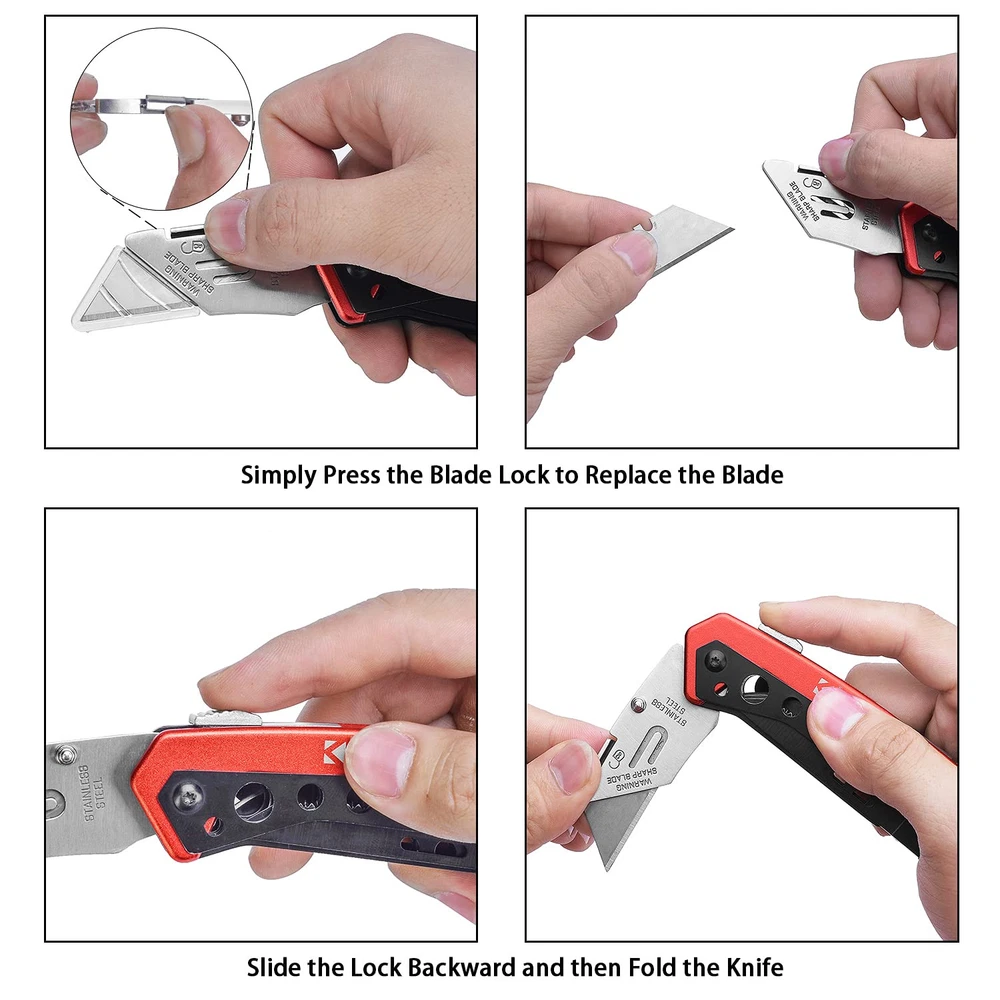 【Built to Last】- Aluminum alloy handle of Pocket Knife with black and red grit blasting for durability and longevity. Stainless Steel blade head is sturdy and rustless. Each Box Cutter come with 10 SK5 stainless steel blades which are hard and sharp. 【Multi-function tool】- This retractable Utility knife features a box cutter, small saw, fruit knife, flat head/Phillips screwdriver etc. Ergonomic comfort grip handle design for increase friction to anti slip and save labor. 【Quick Change Blade】- Quick-change blade mechanism for easy installing and releasing knife. This folding knife can Work quickly and easily. Lock the blade tightly and helps prevent injury. The utility knife blade is sharp enough to cut boxes, rope, carpet, plastic, leather, wallpaper etc. 【Safety Design】- With lock back and Liner lock release design, Pocket Knife safely locks the blade in place when in use. Secure folding mechanism makes sure no accident opening when Box Cutter in your pocket. Transparent plastic protector on the blade tip prevent hurting when not in use. 【Easy Carry】- Weight 6.76 OZ tactical knife with potable and convenience belt clip design easy to clip on your belt or backpack. You can carry the utility knife with the nylon sheath we give too. Such a useful EDC outdoor gadgets for office, home, work, hiking, camping.