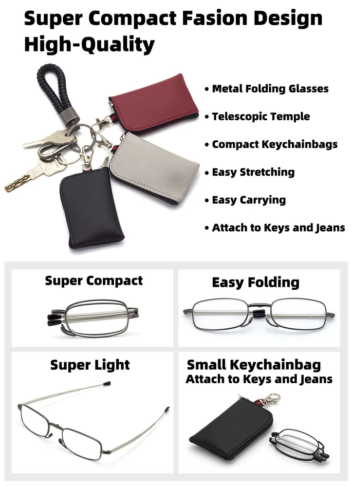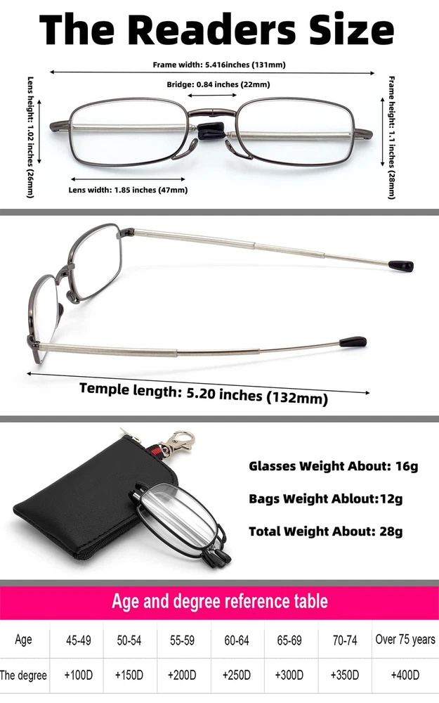 Easy to carry: Compact packaging design allows you to bring glasses with you at any time, easy to use. Product Size: Frame width 5.16 inches (131mm); Lens width 1.85 inches (47mm); Lens height 1.02 inches (26mm); Frame height 1.10 inches (28mm); Bridge (DBL) 0.87 inches (22mm); Temple length 5.20 inches (132mm). There is a measurement error of about 1%. High quality: we use leading technology to make reading glasses for high-quality products and user experience. Fit well spring hinge reading glasses for most face shape and well made frame. Great value style and colors of frames. Very substantial and well built but flexible.