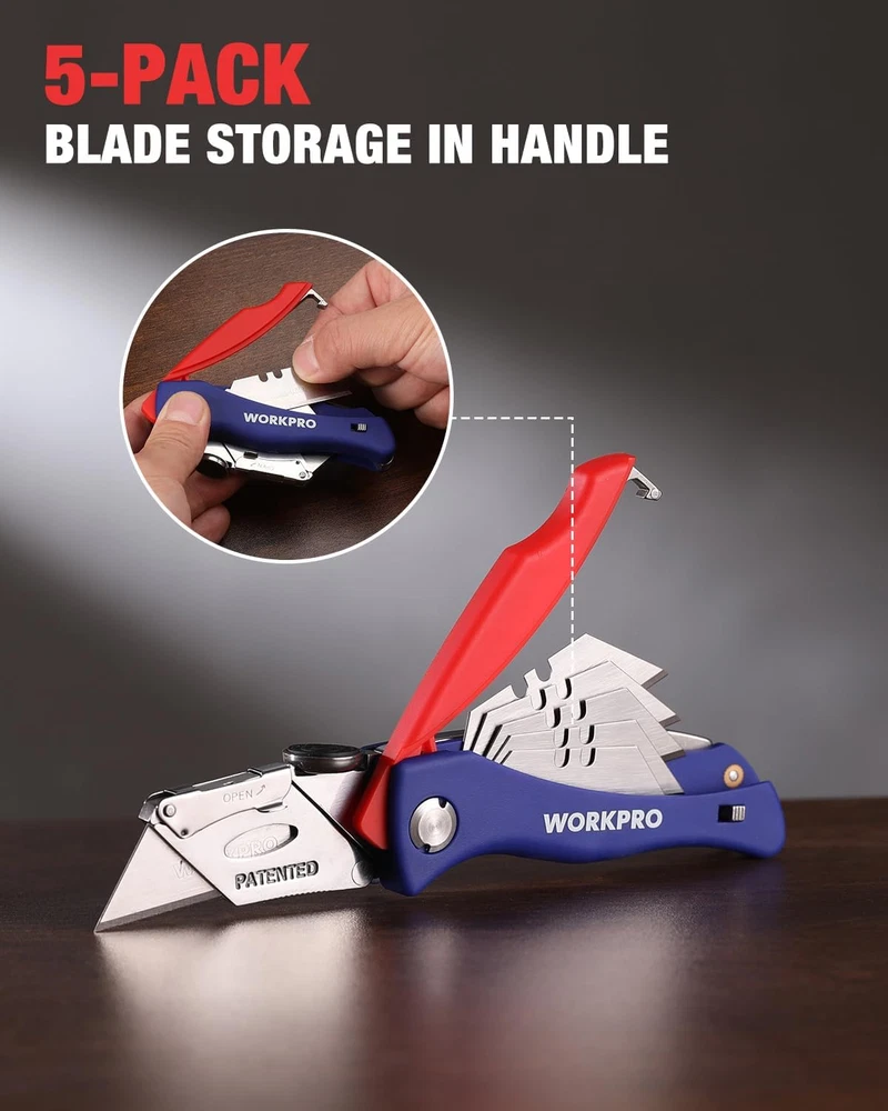 Safe to use. This knife cutter features a quality steel handle and an anti-slip ABS grip, providing more security. The ergonomic curve of the handle fits your hands. No need to worry about the blade slipping from your hand while working. Also, our razor knife is built with a back lock that safely keeps the blades in place, allowing one-hand easy opening and close Quick-change mechanism. Your brand-new work knife comes with an easy blade release mechanism that allows you to safely change the blades and helps prevent injury. Just push the head cover of the blade and drop down the cover of the blade. Our utility knife is compatible with most standard-sized utility knife blades for extra convenience Portable & lightweight design. Our box cutter knife is lightweight and compact, making it easy to take anywhere. It comes with a belt clip, so you can quickly clip it on and off. Carry it with you on your belt, pocket, or bag so you’ll always have it when needed. You can store up to 5 extra blades in the handle Use for various applications. WORKPRO utility knife is built to last. It can be used for various jobs that you may need to get done. It cuts through paper, carpet, plastic, cartons, cloth, bags, leather, PVC, drywall, and more. Get more work done with our sturdy cutter knife Long-lasting utility blades. WORKPRO folding utility knife is made from quality steel which makes it sturdy and long-lasting Product Description WORKPRO Utility Knife & Blades Add to Cart Add to Cart Add to Cart Add to Cart Add to Cart Add to Cart Add to Cart Customer Reviews 4.6 out of 5 stars 10,403 4.7 out of 5 stars 1,820 4.7 out of 5 stars 3,551 4.7 out of 5 stars 1,465 4.7 out of 5 stars 3,551 4.7 out of 5 stars 17,605 4.8 out of 5 stars 1,232 Price $9.99 $ 9 . 99 $15.99 $ 15 . 99 $14.99 $ 14 . 99 $15.99 $ 15 . 99 $14.99 $ 14 . 99 $9.99 $ 9 . 99 $14.99 $ 14 . 99 Foldable ✔ ✔ ✔ ✔ ✔ ✘ ✘ Retractable ✘ ✘ ✘ ✘ ✘ ✘ ✘ Quick Blade Change ✔ ✔ ✔ ✔ ✔ ✔ ✔ Blades Storage ✔ ✔ ✘ ✘ ✘ ✔ ✔ Extra Blades 5 15 10 — — 100 100 1 5 Extra Blades in Handle 2 Thumb Rest 3 Sharpe Blade 4 Belt Clip Blade Storage in the Handle Push the button to open the storage compartment Back-Lock Release Push here to close the utility knife Belt Clip Design Stainless steel belt clip for easy access Long-lasting Use Heavy duty construction for contractor use