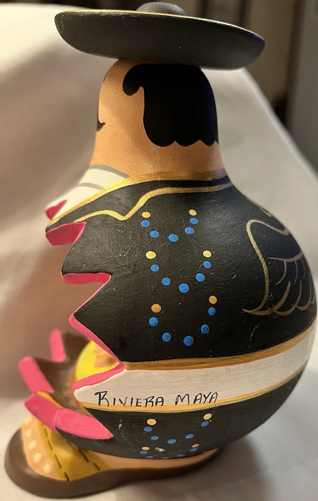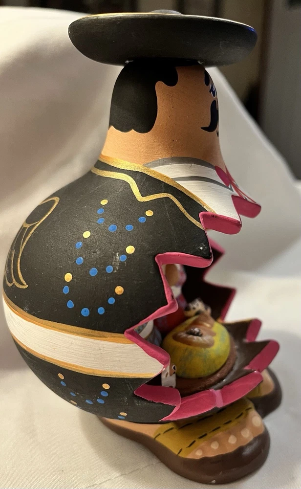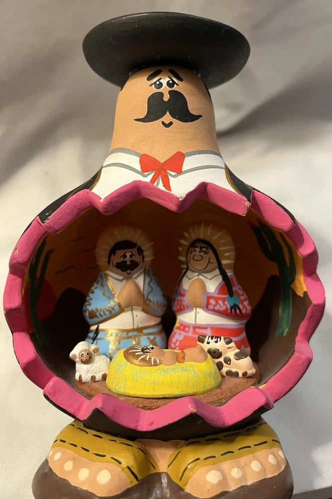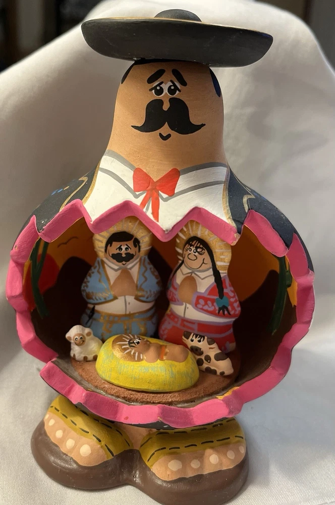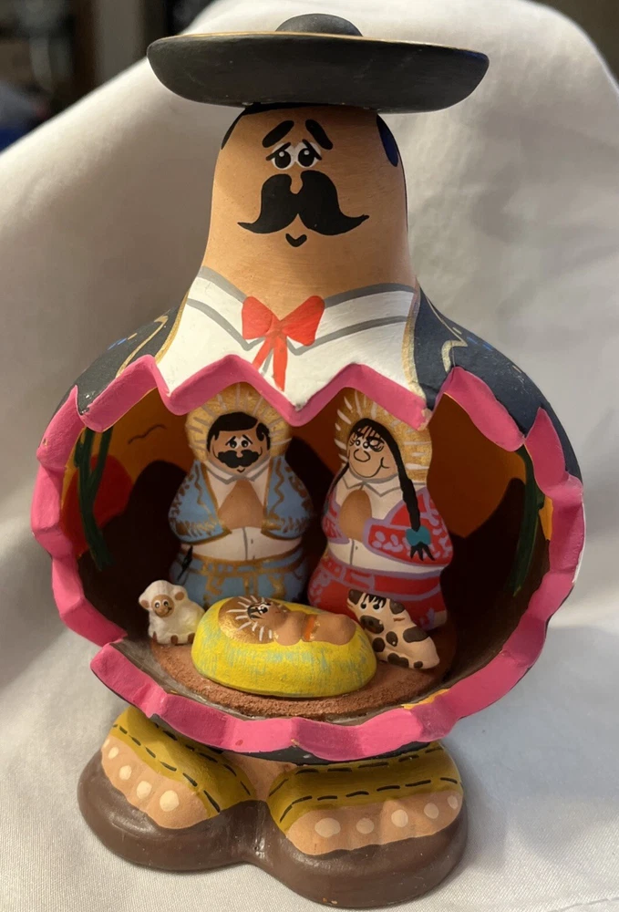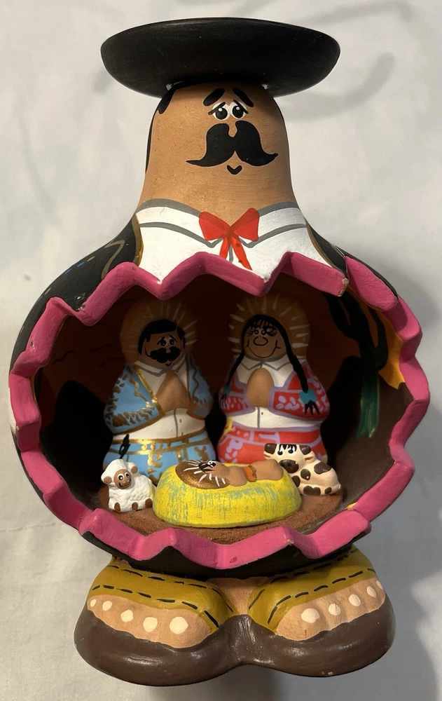 This beautiful piece of folk art features a Mexican nativity scene inside a figurine of a Mexican man. The intricate details and unique design make it a perfect addition to any collection or decoration. The piece showcases the rich culture of Mexico and is a great representation of Latin American folk art.
