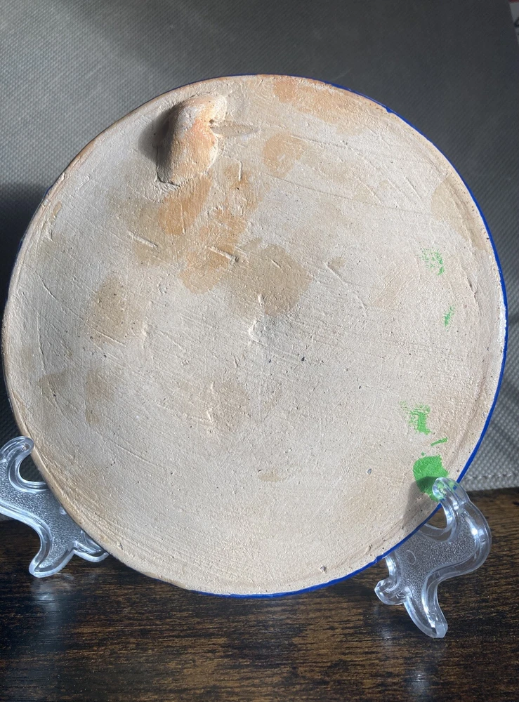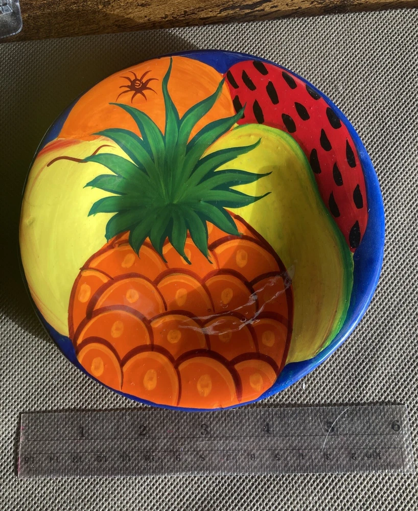 This Folkart terracotta plate is handmade and features a vibrant fruit theme design that is hand painted. With a diameter of 6 inches, Made from terracotta, this plate exudes a rustic charm and is ideal for display on your walls. It is not marked, but probably from Mexico. Very vibrant colors. Photos do not do justice to depict colors.