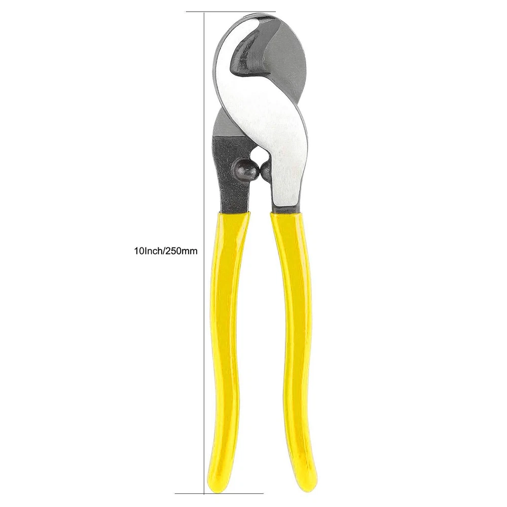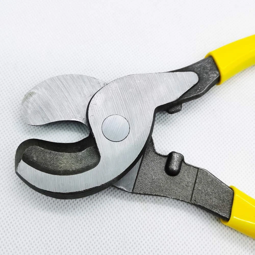 Specification: Overall length:10 inches Jaw length:1.4 inches Joint thickness:0.5-inch Handle span:1.9 inches Joint width:1.6 inches Cutting edge:1.4 inches Weight:2 pounds What You Will Get: 1*10 Inches Cable Cutters Easy to cut up to 4/0 aluminum, 2/0 soft copper, 100-pair 24 AWG communications cable with our expertly induction-hardened high-carbon steel cutting edges, Not for steel or ACSR. Made of durable Chrome-Moly steel, these cable cutters feature precision-machined knife and anvil style cutting blades with a low profile design that makes this the perfect tool for applications in confined areas. The long handle of the wire crimper is 10 inch and wrapped with soft rubber, ergonomic lever structure design can increase friction and help you use less effort . You will get one piece cutter,Through-hardened (not case-hardened) for longer-lasting cutting surfaces.