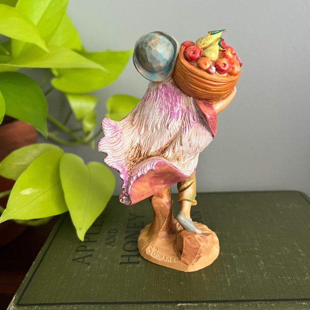 Fontanini “Simeone” nativity village figurine. Marked © Fontanini 1987, Depose Italy, and mold number 145 on the base. Made in Italy. This 5 inch scale figure depicts Simeone carrying a basket of fruit and is part of the Fontanini nativity village collection. Details: • Simeone • © Fontanini 1987 • Depose Italy • Mold number 145 • Made in Italy • 5 inch scale Condition: Preowned condition. No cracks or structural damage observed. Paint appears intact. Please review all photos carefully for complete condition details. A nice addition to a Fontanini nativity or harvest village scene.