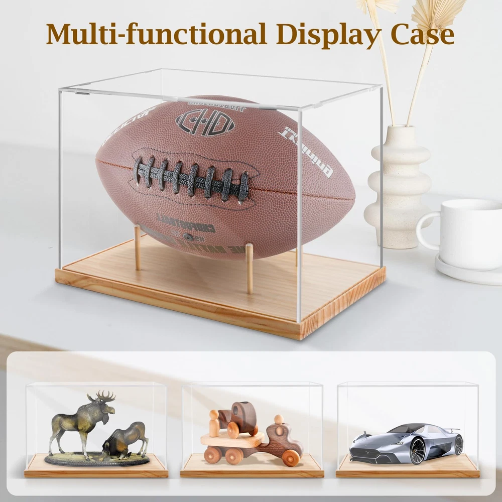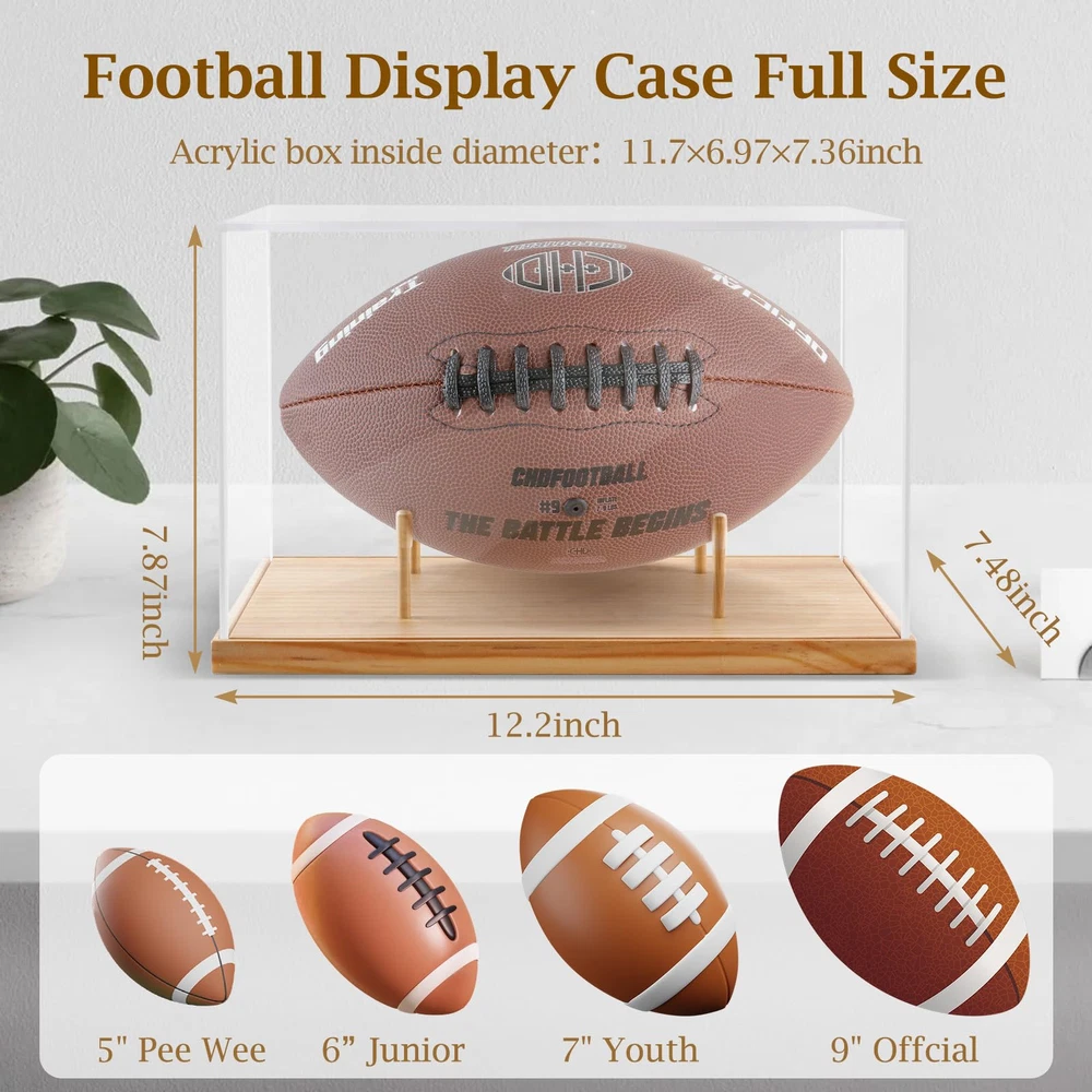 Football Display Case Full Size:Acrylic box inside size: 11.7”x 7”x 7.4“, wooden base size:12.2”x 7.48”x 0.59“. This football case size is designed to fit most footballs. It is recommended to measure the size of the football before buying. High Transparent Acrylic: Football case display clear is made of the highest quality acrylic material, the vision is clear and the high transparency makes the collection in the box achieve a better display effect. Antioxidant Protection:Displaying your memorabilia, keeping clean from dust, but also antioxidant and UV protection, can well protect the items inside from the external environment, protect your signature collection from fading. Easy Assembly:Display case is composed of 4 clear acrylic panels and a wooden base.The installation only needs to insert the acrylic panel into the card slot. The base xith 4 small detachable wood sticks. (Peel off the protective film before use) Multi functional Applications:Wooden base football display box not only meets your storage needs, but also adorns your space. You can use it to your models, trophy, perfume and plaything etc. It is the best choice for collectors and sports enthusiasts.
