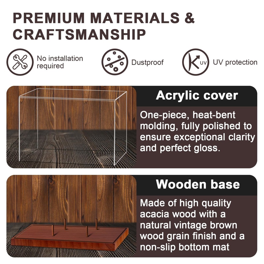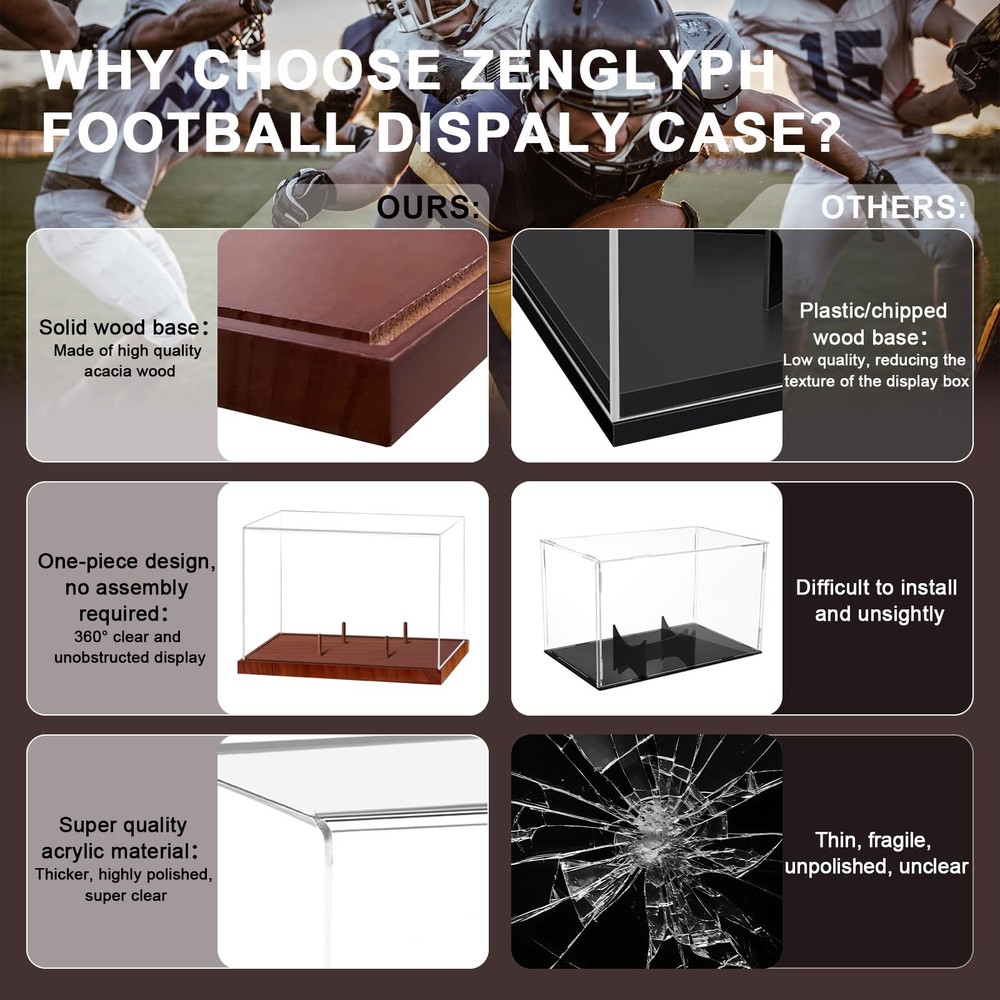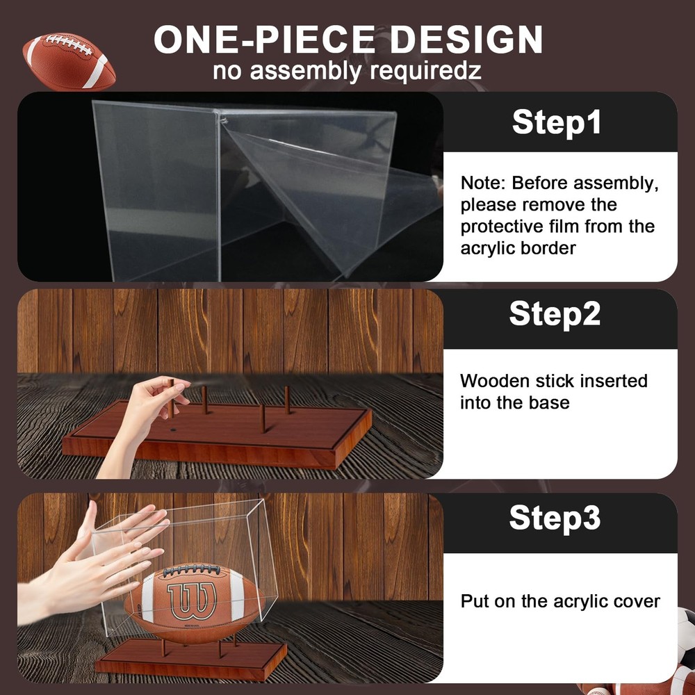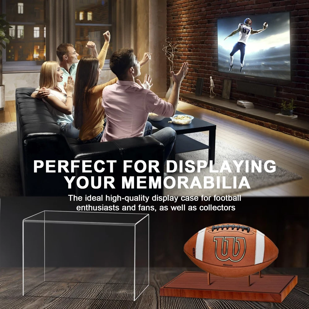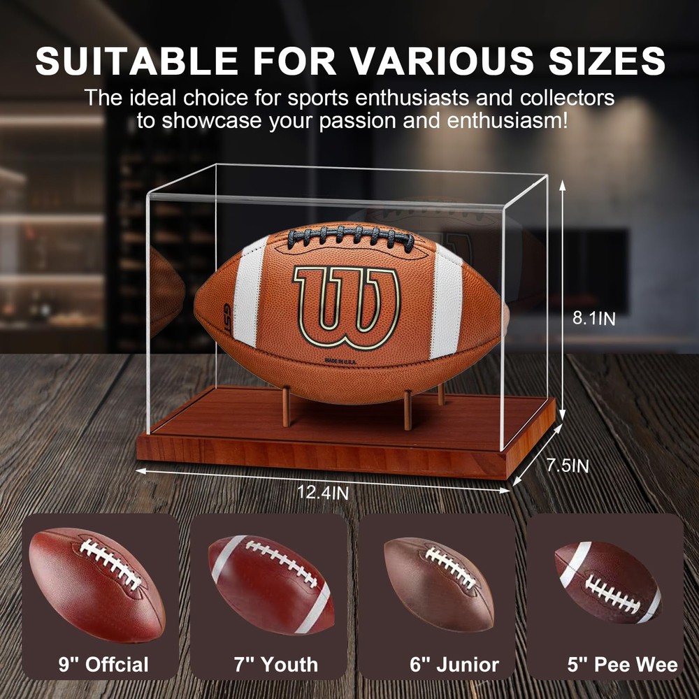 We specialize in crafting premium acrylic football display case, empowering brand retail presentations through innovative design. Created by professional designers and exported worldwide, our cases perfectly showcase footballs, figurines, and collectibles in both home and window settings. Featuring smart spatial optimization for organized storage, they transform collections into eye-catching focal points for both special events and everyday display. Premium UV-Protected Acrylic & Solid Wood Construction: Crafted with museum-grade acrylic walls 30% thicker than standard displays (3mm thickness), the football case features advanced 99% UV-blocking technology to eternally safeguard autographs from fading. Its hand-polished crystal-clear enclosure harmonizes with a rugged acacia wood foundation, creating an heirloom-quality preservation system designed to protect your memorabilia for generations. Vintage Elegance Reimagined: The substantial acacia wood base showcases nature's artistry through its warm vintage-brown woodgrain finish. Effortlessly assemble your display by inserting the wooden support rods, positioning your football, and securing the seamless acrylic case. Enhanced with four 0.78" non-slip silicone pads, the base maintains immaculate surfaces while ensuring unwavering stability - transforming your collectible into a sophisticated centerpiece that commands attention. Innovative Angular Display Architecture: Meticulously engineered at 12.9"x7.5"x8.3", this football display case perfectly cradles standard-sized footballs. Four strategically placed cylindrical wood risers elevate your ball at an optimized angle, creating dynamic visual depth. More than a case, this is a kinetic sculpture celebrating athletic legacy - designed to stir passion in sports connoisseurs and casual fans alike. Multiple Display Options: The Football case with removable wooden rod system accommodates diverse memorabilia configurations. The interplay between industrial-grade transparency and organic wood textures creates chameleonic versatility - equally at home in modern loft spaces, traditional studies, or corporate trophy rooms. Its timeless walnut patina adapts to evolving décor while perpetually enhancing spatial aesthetics. Ideal Gift for Football Enthusiasts: Transcend ordinary display solutions with this excellent quality acrylic and artisan woodcraft. Unlike flimsy alternatives, every architectural detail - from molecular UV filters to precision-milled joinery - serves both form and function. The ultimate expression of fandom, this museum-quality acrylic display case displays precious memorabilia to perfection, making it the perfect gift for those who.