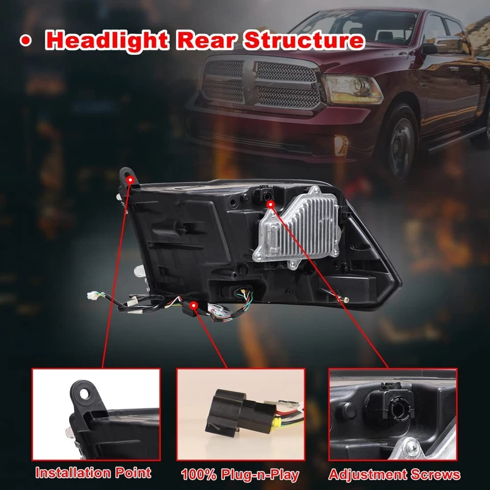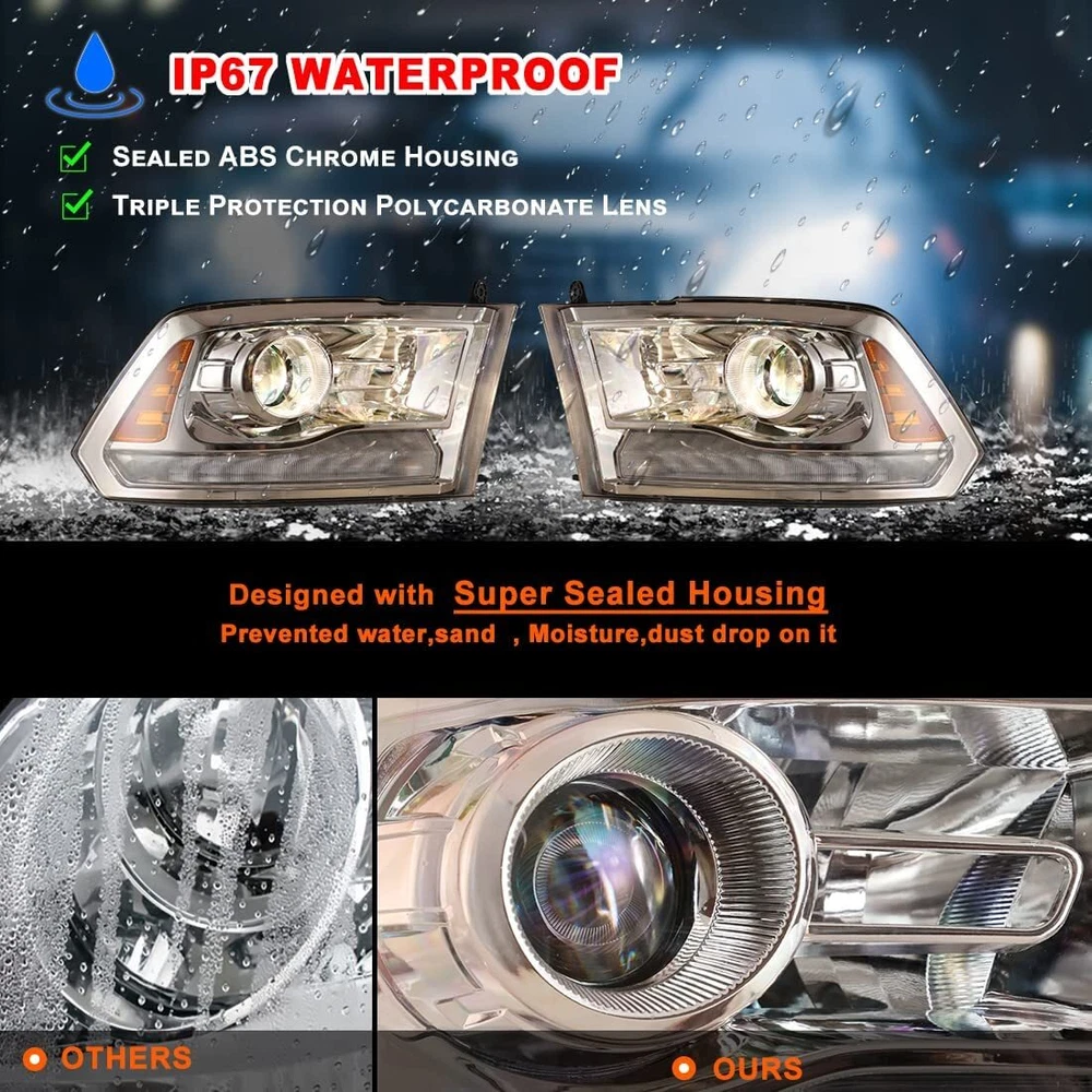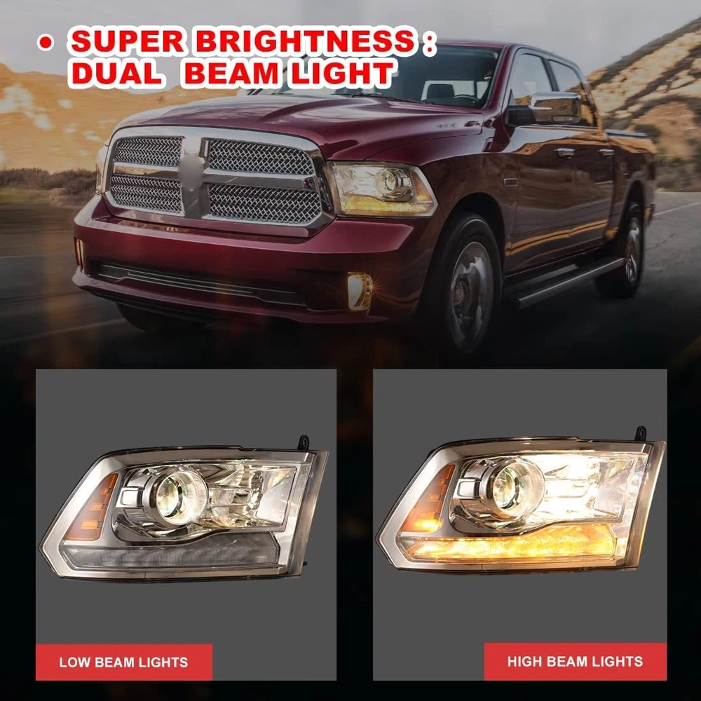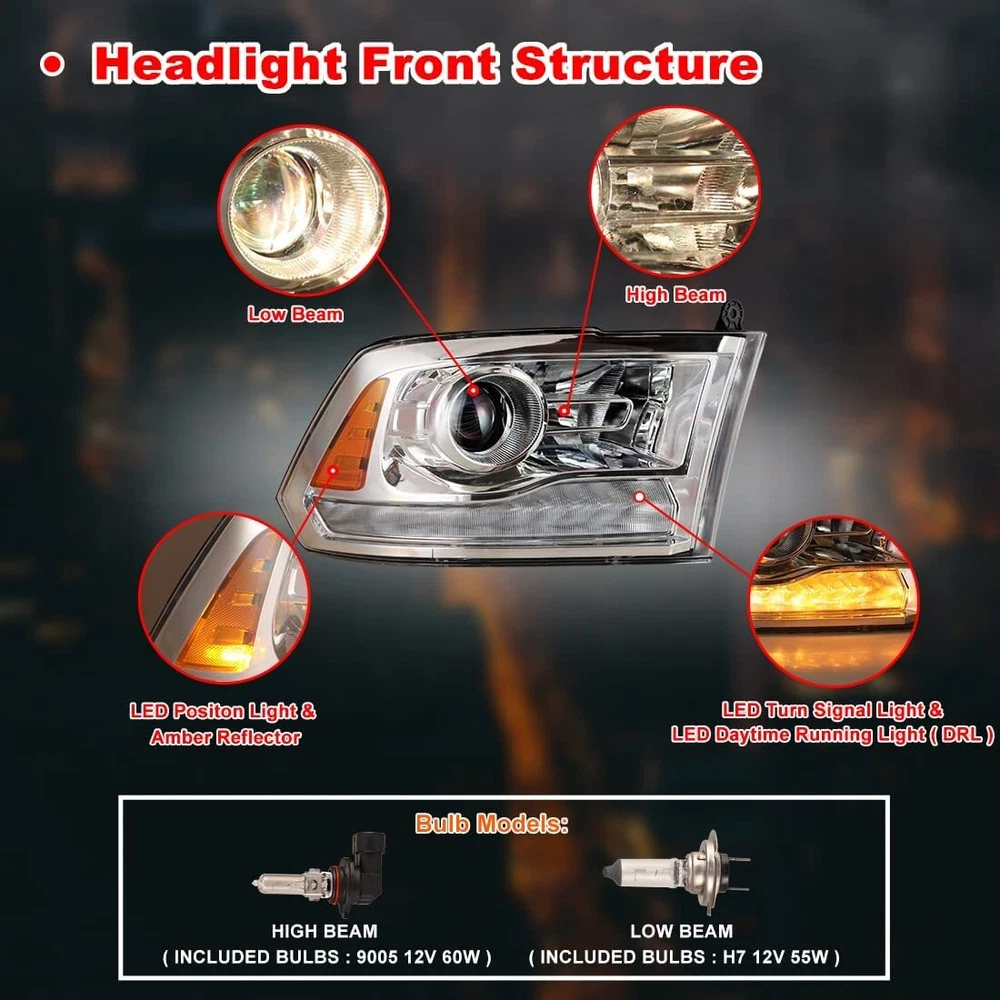 For 09-18 Dodge Ram 1500 2500 3500 Pair Headlights Chrome LED DRL Projector Lamp Features Compatible with 2009-2018 Dodge Ram 1500 / 2500 / 3500. Direct bolt-on OE fitment or replacement for the stock Unit. Comes in a Pair with the Left Driver and Right Passenger sides. Enhance visibility - Multifunction lighting modes design : LED daytime running light / LED turn signal light / high beam / low beam / LED position light with amber reflector. Increase safety during nighttime, heavy rain, snow, or dense fog. Durable OEM grade quality housing and triple layer protection lens; weather-proof, shock-proof. Plug & Play easy installation, no need for rewiring or modification on the original circuit, compliant with SAE and DOT FMVSS108 regulations. 100% Satisfaction Guaranteed, 30 days return if damage when an opened box or defective itself, 1 year warranty. Specification High Beam Light: 9005 12V 60W Low Beam Light: H7 12V 55W Turn Signal Light: LED Daytime Running Light: LED Side Marker Light: LED Wiring Harness: Not included Color Finish: Chrome housing / Clear lens / Amber turn signal Replace Original (OE) Part #: 68093217AD, 68093216AD, 68093221AD, 68093220AD Partslink: CH2502245, CH2503245, CH2502244, CH2503244 Fitment For2009-2018 Dodge Ram 1500 2500 3500 Fits for stock Projector headligths, models with Quad or Dual headlights Package Included 1 pair of Headlights(left and right side) 2x 9005 bulbs 2x H7 bulbs Payment Delivery details Terms of sales About us Contact us Payment 🤟 We accept PayPal (Recommended), credit card, VISA, Google Pay & Discover etc. 🤟 Please submit your payment within 7 days after your purchase. 🤟 If not, eBay will automatically open an Unpaid Item Dispute on our behalf if the item(s) are not paid within 7 days. Delivery details 🤟 Please double check your delivery address and contact information. 🤟 All items will be shipped within 1 business days after payment received. 🤟 Tracking numbers will be easily accessible ASAP they are created and processed. Terms of sales 🤟 Free 60 days Return, we will cover the return post fee. 🤟 If a defective product was received, please do not hesitate to message us via eBay message. 🤟 We will response in 24 hours in business to resolve the problem 🤟 We stand behind our products. Items can be returned for exchange or full refund within 60 days from the date you receive. About us 🤟 Winjet has a huge warehouse and office located in the United States. 🤟 All US domestic 48 states customers are able to benefit from the FREE SHIPPING services. 🤟 Our experienced, professional customer service representatives offers prompt and courteous service. 🤟 Best quality products, outstanding services and professional experience keep our customers. Contact us 🤟 Please feel free to contact us if you have any problems. 🤟 Emails will be replied within 24 hours in working days. 🤟 After hours emails will be replied on the next business day. Brand WINJET Type Headlight Assembly Features DOT-Certified, SAE-Certified, Sealed Assembly OE/OEM Part Number L:68324941AD,68324933AB,68093217AB,, R:68324940AD,68324940AD,68324932AD Housing Color Chrome (Crystal) Manufacturer Part Number WJ1020-0676B-GA-L-01 Light Color Warm White Lens Color Clear Lighting Technology LED Bulb Shape Code H7, 9005 Placement on Vehicle Front, Left, Right Manufacturer Warranty 1 Year Assembly Type Sealed Ballast Included No Certifications DOT, SAE Sold as a pair Driver and passenger side Shipping Fee Free shipping within 48 states Fitment Type Direct Replacement Mounting Hardware Included No Items Included Bulbs Finish Smooth Country/Region of Manufacture United States Model WJ1020-0676B-GA-L-01 Voltage 12V High Beam 9005 12V 60W Halogen Bulbs Included Low Beam H7 12V 55W Halogen Bulbs Included DRL/Turn Signal LED Included