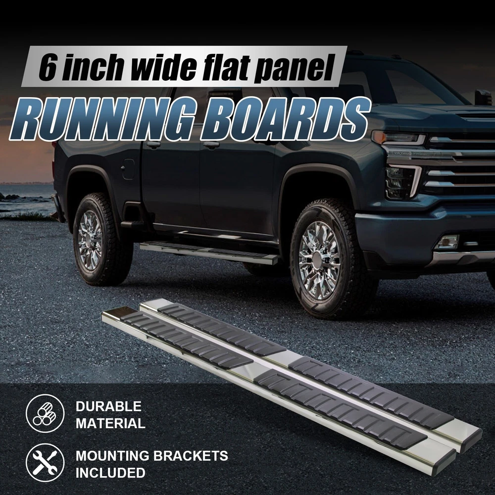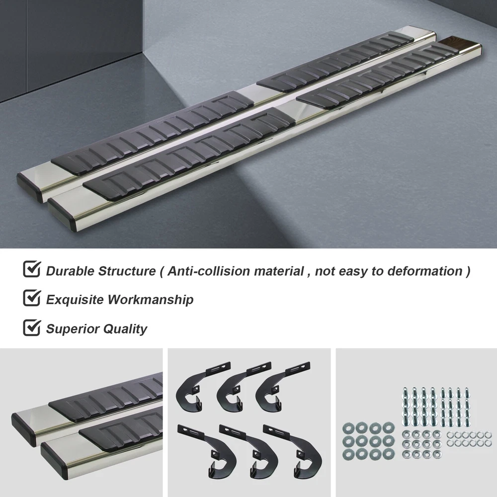 Specification Package Dimensions(LengthxWidthxHeight:inch): 78*8.19*8.97 Item Weight(lbs): 2.71 Item Size(LengthxWidthxHeight:inch): 77.21*7.41*8.19 Fitment Type: Direct Replacement Installation Instruction: Not Included Manufacturer Warranty: 1 Year Sealing End Cover: Yes Package Include: 1x Pair of Running Boards (Left + Right) 4 Brackets on Each Side Mounting Hardware Style: OE Style Only Fit: Double Cab Placement on Vehicle: Left+Right Material: ABS, Stainless Steel Finish: polished Color: Silver Package Weight(lbs): 7.11 Condition: New Manufacturer Warranty: 1 Year Fitment 2020-2024 GMC Sierra 3500 HD 2019-2024 GMC Sierra 1500 2022-2022 Chevrolet Silverado 1500 LTD 2020-2024 Chevrolet Silverado 3500 HD 2020-2024 Chevrolet Silverado 2500 HD 2019-2024 Chevrolet Silverado 1500 2020-2024 GMC Sierra 2500 HD 2022-2022 GMC Sierra 1500 Limited Features & Benefits 1. Made with durable, heavy-duty high light stainless steel and ABS plastic. Seamless joined ABS plastic tread with powder coated body surface to achieve great UV rays, rust, and slippery resistance. 2. Our running boards are made from the finest aluminum alloy, which is sturdy, durable, wear-resistant and rust-resistant. After repeated tests, they can resist the corrosion of salt spray, and withstand UV radiation without discoloration. 3. To a certain extent, they also help protect the paint on the side of the car from being scratched. At the same time, you can easily reach the top of your car when you need it, such as accessing the luggage rack or cleaning the rooftop. 4. Slider Design, Able to adjust position on vehicle forward & backwards for better customization. the whole closed end design make your running board inside clean. 5. Whatever finish you choose, the result is a smooth, finished look that complements your factory chrome and trim perfectly. 6. Running Boards & Side Steps make your life safe and simple for taking your coworkers to the job place, take your pets go out or carpooling the kids to school both. You have a very solid under foot feeling thanks to the Anti-slip tread surface and rugged construction. 7. Easy bolt-on installation: No cutting or drilling. On Nov 18, 2024 at 02:13:59 PST, seller added the following information: On Nov 22, 2024 at 02:46:47 PST, seller added the following information: