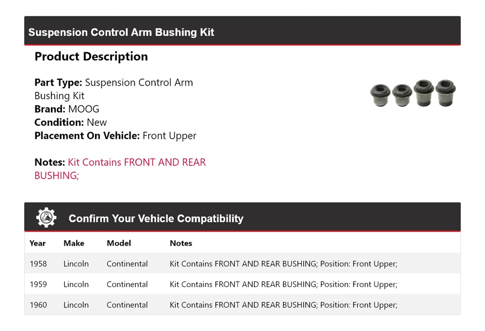 Document For 1958-1960 Lincoln Continental Suspension Control Arm Bushing Kit MOOG Notes: Kit Contains FRONT AND REAR BUSHING; Placement on Vehicle: Front Upper Product Description Description Brand: MOOG Warranty: 12 Month Warranty Part Type: Suspension Control Arm Bushing Kit Compatible Years: 1958 1959 1960 Description Cntrl Arm Bushing Kt Front Upper Suspension Control Arm Bushing Kit Important: Please Review Fitment Notes to Ensure Proper Fit Confirm Your Vehicle Compatibility Year Make Model Notes 1958 Lincoln Continental Kit Contains FRONT AND REAR BUSHING| Position: Front Upper; 1959 Lincoln Continental Kit Contains FRONT AND REAR BUSHING| Position: Front Upper; 1960 Lincoln Continental Kit Contains FRONT AND REAR BUSHING| Position: Front Upper; Please read before purchasing Shipping and Cancellation Policy We utilize UPS, FedEx, and USPS for shipping, selecting the nearest available location to expedite delivery. Tracking numbers will be uploaded on eBay upon shipment. Most items are shipped on the same business day. Please note that interchange tables are intended for American Market Vehicles only. All orders are processed automatically. Before placing your order, please: Ensure that this part fits your vehicle by entering your vehicle's Year, Make, Model, Trim, and Engine in the Compatibility Table. Additionally, review the notes section in the compatibility chart for additional specifications about this part. If you're still unsure whether the part fits your car, please contact us for assistance. Verify that the item you're about to purchase will solve the problem with your car. Double-check that the delivery address provided during checkout is accurate. Return Policy We offer free returns for domestic purchases. However, please note that we are not responsible for the cost of international return shipping. Before returning items or leaving anything other than positive feedback, please contact us. For further details regarding returns, please refer to the "Shipping and Payments" tab. Additionally, it is important to understand that manufacturers reserve the right to modify the appearance or material of their items. They may even discontinue an item and replace it with an updated version. Consequently, the picture displayed may not always reflect the most recent changes, though this occurs rarely. We source our pictures directly from the manufacturer and may not immediately receive updated photos if changes are made. California Proposition 65 WARNING: This product may contain chemicals known to the State of California to cause cancer and birth defects or other reproductive harm. For more info go to www.p65warnings.ca.gov 2024 DTautoparts All Rights Reserved