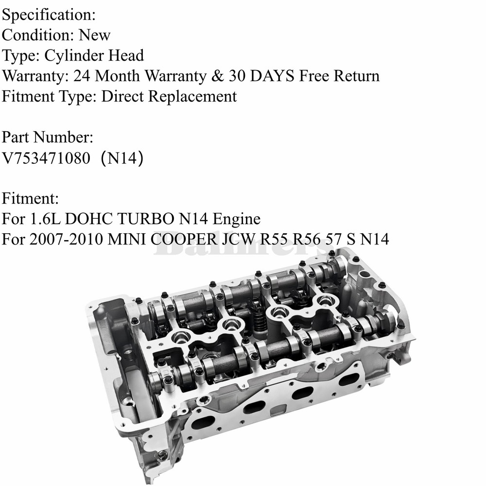 For 2007-2010 MINI COOPER JCW R55 R56 57 S N14 CYLINDER HEAD V753471080 Specification: Condition: New Type: Cylinder Head Warranty: 24 Month Warranty & 30 DAYS Free Return Fitment Type: Direct Replacement Part Number: V753471080(N14) Fitment: For 1.6L DOHC TURBO N14 Engine For 2007-2010 MINI COOPER JCW R55 R56 57 S N14 Specifics: 1)Engineered for superior durability. 2) According to the original factory specifications. 3) Built to strict quality control standards, perfect match for the original car. 4) Easy installation, Direct replacement. 5) Stable performance, high reliability. Package Included: 1 X Cylinder Head Home Payment Shipping Return Policy About Us Contact Us Feedback Title Other Catalytic Converter Shock Absorbers Struts Other Fuel Pump For 2007-10 MINI COOPER JCW R55 R56 57 S N14 1.6L Turbo CYLINDER HEAD V753471080 For 2007-2010 MINI COOPER JCW R55 R56 57 S N14 CYLINDER HEAD V753471080 Specification: Condition: New Type: Cylinder Head Warranty: 24 Month Warranty & 30 DAYS Free Return Fitment Type: Direct Replacement Part Number: V753471080(N14) Fitment: For 1.6L DOHC TURBO N14 Engine For 2007-2010 MINI COOPER JCW R55 R56 57 S N14 Specifics: 1)Engineered for superior durability. 2) According to the original factory specifications. 3) Built to strict quality control standards, perfect match for the original car. 4) Easy installation, Direct replacement. 5) Stable performance, high reliability. Package Included: 1 X Cylinder Head Terms of sales Delivery details Payment About us Contact us Terms of sales If you are not sure about the compatibility, or you are looking for other car parts, just contact us. We are happy to offer any help. Bellow information will help: VIN(Vehicle Identification Number), detailed car model, part number and photos of the parts. as the information in the " vehicle compatible chart" section above is generated by eBay Motors and not from us. 📣30-day window for returns and exchanges for reason other than defect. 📣Standard 1 year warranty on all parts except as noted. 📣 We do not warranty for improper installation or usage after time of purchase. 📣 Please make sure your address and contact information is accurate and correct. 📣 Except the product costs, international buyers may need to pay additional import taxes to local customs. Our prices do NOT include taxes. Delivery details 👉Domestic orders are usually shipped within 2 working days. Delivery is between 2-5 business days. (except holidays and weekends). Sometimes the carrier may not update the tracking in time, so we arranged staff to follow up the tracking status of all orders. If there is any abnormality, we will provide solutions to guarantee the rights and interests of customers. (Domestic orders will be shipped FREE of charge via UPS/ FedEx/ USPS at our discretion.) 👉Outside the United States, orders will be shipped within 3 working days and delivered within 2-7 working days. Apart from the product cost, international buyers may have to pay additional import duties to the local customs. Our price does not include tax. (International orders will be shipped via DHL, FedEx, UPS) Payment Please use the eBay checkout system when paying for your order. Immediate payment is required for all orders. About us We are a leading auto parts supplier with our own supply chain system. Our products are produced according to the original factory standard, with high quality and a competitive price, and the warranty period is one year. Our Advantage: Expert Guidance and Support: Our team of knowledgeable and experienced professionals is here to provide expert guidance and support. Exceptional Quality Assurance: Quality is our top priority. All our auto parts undergo rigorous testing and quality assurance processes to meet or exceed industry standards. Competitive Pricing and Value : We understand the importance of competitive pricing without compromising on quality. Our commitment is to provide customers with value for their money, offering affordable auto parts that don't sacrifice performance or reliability. Specialized in automotive shock absorber and catalytic converter parts, fuel pump, Transfer Case, ignitioncoil, Vacuum Pump, Repair kit, etc. Contact us ❤️ Communication is the best way to solve the problem. If you have any problems after purchasing, please contact us in time, before opening return or case 🔔Please contact us before committing to buy if you have any questions about the applicability, warranty or conditions of the product. ⚠️Notes: Due to the time difference, we may not be able to reply in time. Please be patient. Please don't worry. We will definitely reply your email within 24 hours. Main Brand