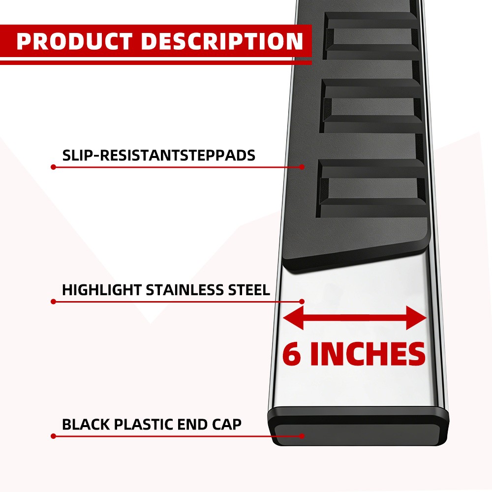 Product View Detail These running boards will elevate your vehicle's style and functionality to new heights. Combining a sleek aesthetic with rugged appeal, these innovative running boards are the perfect upgrade for your truck or SUV. Constructed with a high-quality aluminum alloy frame, these steps are built to withstand the harshest weather and the test of time. Their robust structure offers exceptional corrosion resistance. Oversized, molded anti-slip treads ensure a secure footing for effortless entry and exit. No drilling required! Mounting brackets snap directly into factory-provided holes for incredibly simple installation. Save valuable time and effort by avoiding drilling into your vehicle's body. Kit Includes: 2 Running Boards 2 Mounting Bracket Sets Installation hardware as shown Product Features: Durable rust-resistant stainless steel construction ABS plastic slip-resistant treads ABS plastic end caps Polished surface finish 550 lb weight capacity Simple drill-free installation—mounts directly to factory mounting points. Installation takes less than an hour on most vehicles. Includes vehicle-specific mounting brackets Important Notes: Compatible Models: 2009-2018 RAM 1500 2010-2022 RAM 2500/3500 Double Cab models 2019-2022 RAM 1500 Classic Double Cab models Please verify vehicle compatibility before purchase. If unsure, consult customer service. 100% Brand New Authentic Product Professional installation is strongly recommended Installation instructions not included Shipping Policy Payment Method Returns Policy Shipping Policy Payment Method Returns Policy Copyright © 2017 DataCaciques Home Payment Shipping About us Contact us Store Categories Store Categories Tractor Heavy Duty Attachment Automotive Tools &Supplies Livestock supplies Business & Industrial Other Product View Detail These running boards will elevate your vehicle's style and functionality to new heights. Combining a sleek aesthetic with rugged appeal, these innovative running boards are the perfect upgrade for your truck or SUV. Constructed with a high-quality aluminum alloy frame, these steps are built to withstand the harshest weather and the test of time. Their robust structure offers exceptional corrosion resistance. Oversized, molded anti-slip treads ensure a secure footing for effortless entry and exit. No drilling required! Mounting brackets snap directly into factory-provided holes for incredibly simple installation. Save valuable time and effort by avoiding drilling into your vehicle's body. Kit Includes: 2 Running Boards 2 Mounting Bracket Sets Installation hardware as shown Product Features: Durable rust-resistant stainless steel construction ABS plastic slip-resistant treads ABS plastic end caps Polished surface finish 550 lb weight capacity Simple drill-free installation—mounts directly to factory mounting points. Installation takes less than an hour on most vehicles. Includes vehicle-specific mounting brackets Important Notes: Compatible Models: 2009-2018 RAM 1500 2010-2022 RAM 2500/3500 Double Cab models 2019-2022 RAM 1500 Classic Double Cab models Please verify vehicle compatibility before purchase. If unsure, consult customer service. 100% Brand New Authentic Product Professional installation is strongly recommended Installation instructions not included Shipping Policy Payment Method Returns Policy ABOUT US Shipping Policy Ships within 24 hours of payment Delivered using FedEx Ground or FedEx Home Delivery Ships from a warehouse close by Delivered within 3-7 days Product... Payment Method We accept PayPal payment,PayPal Credit,Credit card or debit card and so on.Payment should be completed within 4 (Four) days of auction closing. Or unpaid dispute will be filed for closing auction.We will leave a positive feedback immediately after payment is received. We appreciate a positive feedback as much as you do. If for some reason there is any issue with the purchase, please contact us prior to leaving feedback, we will be glad to work together and provide a satisfying solution. Returns Policy Receive the product has problems or did not receive the product the first time to contact us to solve the problem for you they provide free returns do not need to seller to pay the shipping costs do not worry about the product in the transportation process problems ABOUT US Welcome to our eBay store. As a leading and emerging company in manufacturer and exporting business, we are specialized in Business and Industrial Products, Sporting Goods, Pet Products, Home and Garden products for more than 10 years. We believe that it is our vision and mission to provide innovative products with best service and competitive price to satisfy you. Our goal is to make sure that you can find exactly what you are looking for and make it easy for you to place your orders.