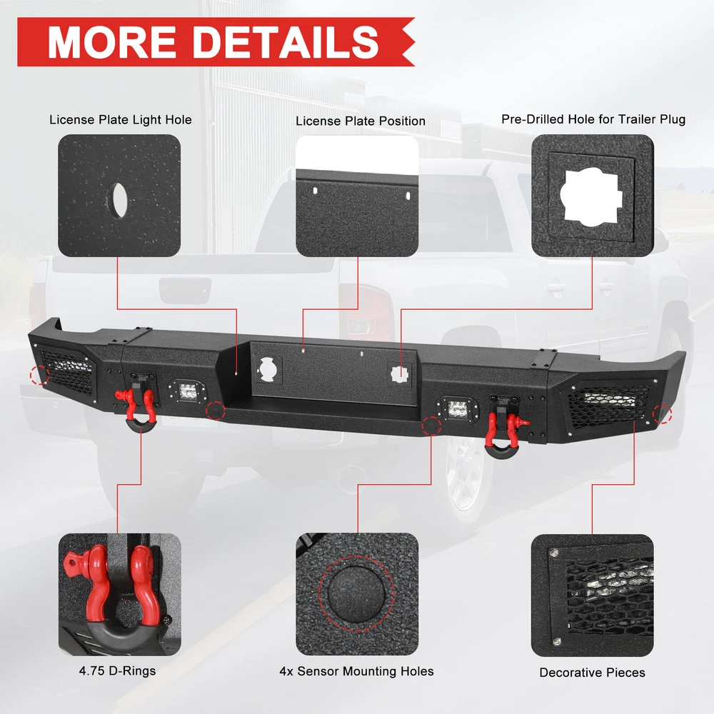 Store Categories Store Categories LED Work Light LED Light Bar 5x7" LED Headlight 4x6" LED Headlight LED Whip Light Jeep Light Mounting Brackets Front & Rear Bumper Accessories Toys For Kids Auction Others Floor Mat Clearance 20% OFF Shipping labels E-bike Other For 2011-2014 GMC Sierra 2500 3500HD Steel Rear Bumper W/LED Lights&D-Ring (The sensor holes in the rear bumper does't fit the original sensor) Manufacturer Direct Sell | Awesome customer's service GUARANTEED | Free shipping Volume and Weight: Rear Bumper Volume:78.27X16.3 X8.43(inches) Weight:83.9lbs. Compatible with 2011-2012-2013-2014 GMC Sierra 2500HD 3500HD Package included: Rear Bumper 4 x 20 W Square LED Lights 2 x 3/4"T D-Rings 2 x Washers A set of screws Installation instructions Service:Aaiwa offers a 1-year product defect warranty free of charge. Product Advantage: 1.The material is make of 5/32" thick low carbon hard steel and 2" x 0.120" precision tolerance steel tube, stiffer, more durable bumpers, advanced level 3 black powder coating, corrosion resistant and durable. 2.Our bumpers are engineered to be a direct bolt-on upgrade using just basic hand tools, so there is no drilling or cutting required,straight forward installation. Payment Shipping Returns Contact Us Feedback Payment We accept PayPal, Google Pay, VISA, Master Card, Amex. Credit card payment can also be made via PayPal E-check payment will be held until the payment is cleared. Item can only be shipped out when all payment is cleared. Please make sure your eBay address is correct before you pay. All the unpaid case will automatically opened after 4 days because the ebay final value charge of the transaction. Shipping All shipment will ship by UPS, USPS,Fedex Or DHL. We know you’re keen to receive your order as quickly as possible. Please note eBay’s delivery date estimate at the top of the listing. United States: 3-7 business days . Other countries: no more than 12 business days . Package will be sent out within 24 hours after the pament is cleared. We will not be responsible for any delivery failure due to unclear address. Delivery is not available on weekends, public holidays or after business hours. CANADA & International customers please note: your government might charge a duty tax (brokerage fees). We do not responsible for any custom duty or import tax. If you have any questions or issue about delivery, please contact us via eBay Messages and we will do our best to make sure you’re happy. Returns Although rare, we understand that an order might need to be returned to us for a number of reasons. Please contact us before sending anything back to make sure the correct process is followed. We will accept returns or refund or exchange if they are unused and unmarked within 60 days . If you received wrong of defective products, please take photos and contact us to confirm. We must protect your interest as promsied. Remember to contact us via eBay message firstly. Don't open the return request. Contact Us Office Opening Times: Monday to Friday-9:00AM-19:00PM .. We do our best to respond within 12-24 hours. If no response within 24 hours, please check the spam in your mail box. If you have any questions or issue about delivery, please contact us via eBay Messages and we will do our best to make sure you’re happy. Ask us about bulk discounts if you want to buy 3 or more. Our store is good ebay seller and we are renowned auto suppliers seller in China who had earned the highest feedback on high quality we have factory in HongKong. Our Company is a Branch company that of a manufacturer which producing of the LED and HID products,we move and in charge our main business in E-commerce on eBay,Aaiwa engages in lighting equipment and accessories for the car and vehicle Feedback We apprecaite your business and strived to improve our customer service and our commitment to quality. We will leave a postive feedback immediately after payment is received. We appreciate a positive feedback as much as you do. Please do NOT leave negative or neutral feedback . If for some reason there is any issue with the purchase, please contact us prior to leaving feedback, and we will be glad to work with you to have it resolved.