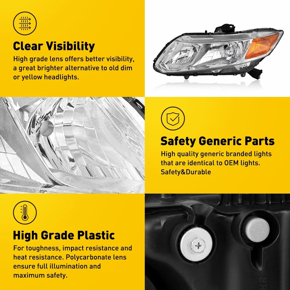 Fit for: 2012-2015 Honda Civic 4Dr Sedan 2012-2013 Honda Civic 2Dr Coupe Specifications: OE number: 33150TR0A01,33400TR0A01,33150TR2A01,331400TR2A01 HO2502144, HO2503144, HO2502150, HO2503150 Material: ABS+PC (ABS Plastic Housing/Polycarbonate lens) Appearance color: 1.Housing Color:Chrome 2.Lens Color:Clear 3.Reflector Color:Amber Note: Projector ×(Not Include) DRL × (Not include) Bulb × (Not include) Features: *Easy to install: Direct replacement, drilling and cutting are not required. For 2012-2015 Honda Civic Chrome Housing Headlights Headlamp Assembly Left+Right Fit for: 2012-2015 Honda Civic 4Dr Sedan 2012-2013 Honda Civic 2Dr Coupe Specifications: OE number: 33150TR0A01,33400TR0A01,33150TR2A01,331400TR2A01 HO2502144, HO2503144, HO2502150, HO2503150 Material: ABS+PC (ABS Plastic Housing/Polycarbonate lens) Appearance color: 1.Housing Color:Chrome 2.Lens Color:Clear 3.Reflector Color:Amber Note: Projector ×(Not Include) DRL × (Not include) Bulb × (Not include) Features: *Easy to install: Direct replacement, drilling and cutting are not required. *Superior quality: Made of ABS and PC materials with toughness and heat resistance functions to ensure its long service life and durability. *Angle adjustment: Equipped with a headlamp Angle adjustment knob, you can adjust the best Angle of view through the knob. *Suggestion: 1.Please confirm the OE number before purchasing!!! 2.Professional installation is required!!! Packaging include: Headlights*2(Left+Right) Item Specifics Brand AUXITO Lighting Technology Halogen Type Headlight Assembly Features Reflector Housing, SAE-Certified, Sealed Assembly Housing Color Chrome Placement on Vehicle Front Left,Right Light Color No Bulb Lens Color Clear Reflector Color Amber Manufacturer Part Number HDCV12.00 Color Temperature \ Voltage 12 V Mounting Style Screws Vintage Part Yes Performance Part Yes Manufacturer Warranty 5 Years Universal Fitment No Number of Bulbs 0 Finish Smooth Model For 2012-2015 Honda Civic 4Dr Sedan,2012-2013 2Dr Coupe OE/OEM Part Number 33150TR0A01,33400TR0A01,33150TR2A01,331400TR2A01 Quantity 2 Headlight assembly Packaging include Left & Right Side Headlights Assembly Bulbs Included Not Included Bulb Shape Code Please Use Stock Bulbs Include Projector Not Included Include DRL Not Included Fitment Type Direct Replacement Assembly Type Composite Type Headlight Assembly Mounting Hardware Included No Certifications DOT, SAE Dust and Moisture Protection Yes Waterproof Yes Ballast Included No Applicable Regions US Items Included Headlight Assembly Bulb Shape Code Just like the original Wattage \ Interchange Part Number HO2502144, HO2503144, HO2502150, HO2503150 FAQ ♥ If you have a decoding problem or any other problems, please contact us first, we will help you with it. We will reply you within 24 hours in working days. I'm a new seller, thanks a lot for your trust and convince! I will serve you with all my heart. ♥ Q1: Will this bulb fit my vehicle? A: We can match almost any vehicle to one of our bulb sizes. eBay only lets us include some vehicle fitments per listing, but if your vehicle does not show up on the compatibility table at the top of our listings, welcome you to contact us for free consulation before purchasing a product. Q2: My item has not arrived, what's taking so long? A: Sometimes items take longer than expected, especially if it’s going far or to rural area. Check with your post office to see if your item has been held up. Sometimes Royal Mail will not update a tracking number until it has arrived at its destination. If your item still don't arrive after a few days, let us know so we can double check for you and help solve it asap. Q3: My bulbs won't fit, help! A: Special bulb holder may be required. See if you can take the holder from the stock bulb. If not, let us know. The bulb size may be wrong, double check the item you received with the item you ordered. Do you have an aftermarket lighting housing? These may not be perfectly fitted for aftermarket bulbs and will require some manual modifications. Q4: Neither side lighting up? Both sides flicker, hyper flash, or work inconsistantly. A:Check the light fuses, and then check the ballast plugs to insure correct installation. If this doesn't work, there may be a voltage problem with the vehicle. You probably just need a relay or capacitor. Even though some bulbs are builtin resistors, they may still need a decoder. Payment (1). We gladly accepts payment via PayPal, We will ship your item(s) within 24 hours. (2). Before payment, please keep the consistency of Paypal address and ebay address. (3). Quantity orders are welcome! Returns (1). We offer 60 days free return policy. Please contact us within 60 days from the date you receive your order if you have any issues with the product or want return. Refund will be send after we got your resend package. (2). All returned items should be in the original packaging , return tracking information should be provided . Contact us (1).Negative feedback will not help resolve any problems you have, please contact us via eBay messages before leaving negative feedback , our customer service will make best effort to help you with the issues. (2).We maintain high standards of excellenceand strive for 100% customer satisfaction! Feedback is very important to us. We request that you contact us immediately before you give us neutral or negative feedback, so that we can satisfactorily address your concerns. About us We're professional in car and motorcycle accessories, especially in LED bulbs. We have our own factory and R&D team. Our belief is to sell top quality items that fit your car and serve you with our heart. Anything please feel free to contact us! Our customer service is very responsibility. Come and follow us! DESCRIPTION PAYMENT SHIPPING RETURN POLICY CONTACT US Shop Category Store Home Other Hot Item BLACK ROOF TOP TRIM MOLDINGS FOR 2006 2007 2008 2009 2010 2011 2012 TOYOTA YARIS USD 17.99 2x H7 Super Bright LE