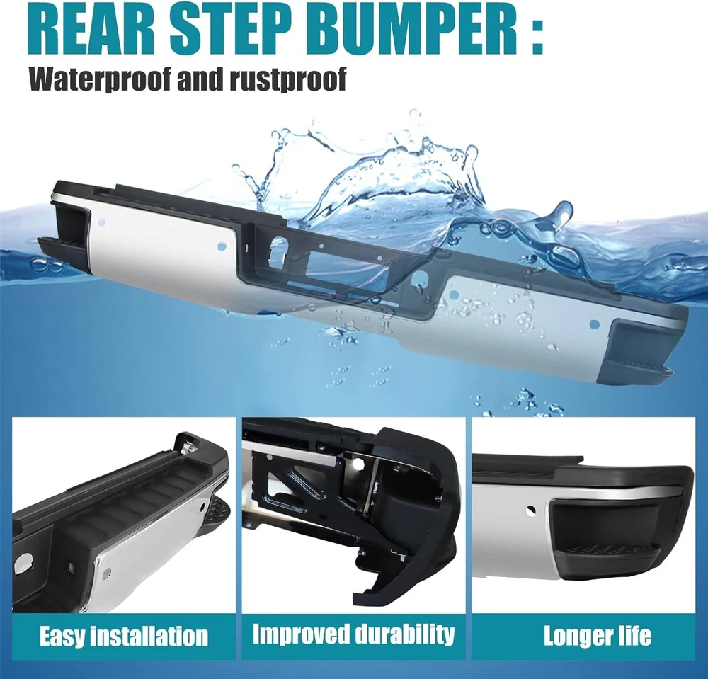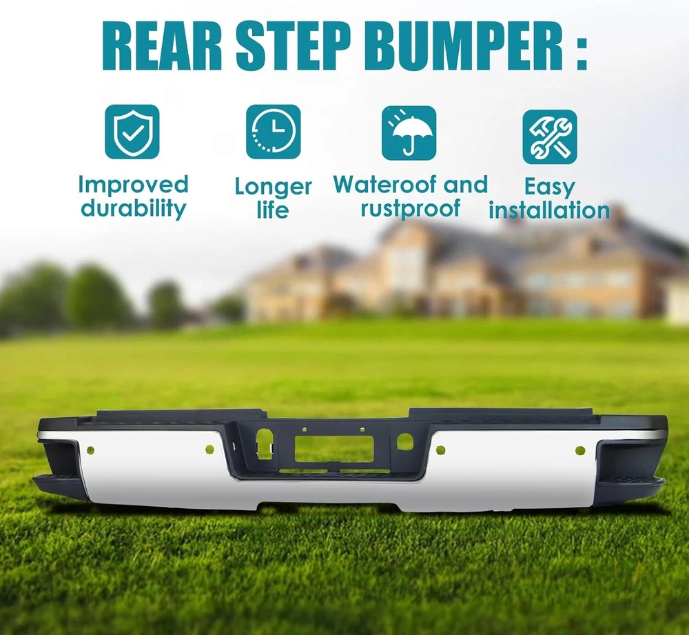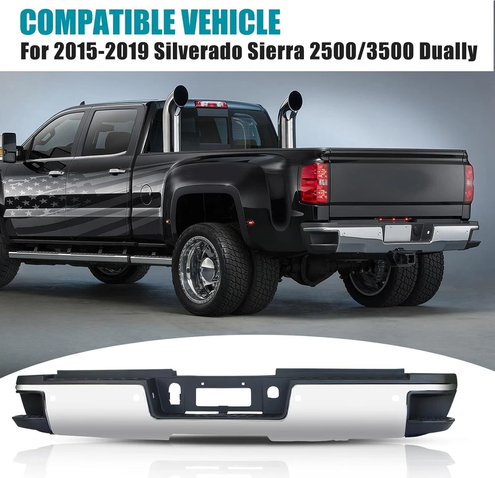 Park Assist Sensor Cut-out Rear Bumper Compatible with 2015-2019 Chevy Silverado/GMC Sierra 2500 HD 3500 HD, Step Bumper with Parking Sensor Hole without Tow Hitch for Dual Rear Wheel (Dually) Models , Chrome Bar Replacement Step Pad Assembly Product Description About this item Chrome Rear Bumper Assembly: Enhance the look of your 2015-2019 Silverado Sierra 2500 3500 with this and stylish chrome rear bumper assembly. compatible with Specific Models: Designed to compatible with seamlessly on Silverado Sierra 2500 3500 models from 2015 to 2019, e a precise and custom compatible with. Integed Park Assist: This rear bumper assembly comes equipped with park assist sensors, making parking and ee your vehicle easier and safer. Easy Installation: With a straightforward installation process, you can quickly upgrade your vehicle's rear bumper without the need compatible with professional help. Enhanced ion and Style: Not only does this chrome rear bumper assembly your vehicle, but it also adds a touch of sophistication and style to your Silverado Sierra 2500 3500. Features: 2015-2019 Chevrolet Silverado 2500 HD 2015-2019 Chevrolet Silverado 3500 HD 2015-2019 GMC Sierra 2500 HD 2015-2019 GMC Sierra 3500 HD For Models With Park Sensors For Use With Factory Tow Hitch (Hitch Plate Not Included) For Dual Rear Wheel (Dually) Models ONLY High Polished Chrome Finish Includes Reinforcement, Brackets, Hardware, Lamps and Step Pad Direct OE Replacement W/o Park Assist Sensor Cut-out Chrome Steel Rear Step Bumper Replacement for 2015-2019 Chevy Silverado Sierra 2500HD 3500HD Single Rear Wheels without Park Assist Sensor Holes GM1103182 Product Description About this item Compatible with: specifically designed replacement for 2015-2019 Silverado 2500HD 3500HD 2015-2019 Sierra 2500HD 3500HD, ensuring a secure and stable installation Premium quality steel: constructed from steel and chrome for an extra layer of protection and an aesthetic appeal, is designed to withstand daily crash, ensuring a long-lasting performance Easy installation: no drilling or cutting required, designed as a direct replacement for your original step bumper. Installation instruction is not included. Professional installation would be highly recommended Stable use: the stepped bumper provides additional protection for your vehicle, ensuring stable driving on the road Complete package: it comes with 1 x rear bumper as shown in the picture. All these components are of good quality, ensuring reliable performance and functionality Features: It undergoes strict factory testing to ensure reliable performance and a long service life It is designed to be a direct replacement, made to factory specifications, so no modifications are required This rear bumper is the good fit for your vehicle, seamlessly integrating with the overall design and enhancing its aesthetics Not only does this rear bumper provide excellent protection for your vehicle, but it also offers a stylish and sleek appearance Its finish adds a touch of elegance to your car while effectively guarding avoid impacts, scratches, and other forms of damage Fitment: Replacement for 2015-2019 Silverado 2500HD Replacement for 2015-2019 Silverado 3500HD Replacement for 2015-2019 Sierra 2500HD Replacement for 2015-2019 Sierra 3500HD Specifications: Part number: replacement for GM1103182 23108142-PFM 84078289 Color: chrome Material: steel Type: rear step bumper Placement on vehicle: rear Fitment type: direct replacement Attachment type: bolt-on Package included: 1 x rear step bumper shown in pictures Notes: With corner step Without hitch draw bar Without mounting brackets For Single Rear Wheel Models ONLY For models without park assist holes only For use with factory tow hitch (no stabilizer plate included) Payment Delivery Details Return Feedback Contact us Payment We accept payment by any of the following methods: Delivery Details Shipping Time Your item will ship within 3 days (Mon-Fri) of your cleared payment. Items will be shipped to the shipping address you specify via Paypal only. We are NOT able to change the shipping address once payment has been made. A tracking number will be provided once your item has shipped. Domestic Buyers No shipping to PO BOX and APO addresses. No shipping to PR, AK, HI. International Buyers International buyers please note: Import duties, taxes and charges are not included in the item price or shipping charges. These charges are the buyer's responsibility. Please check with your country's customs office to determine what these additional costs will be prior to bidding/buying. Return All returns must have RMA number. Returns with no RMA number will be avoided! 1. Changed your mind and don't want the item anymore? We back our products with a 30-DAY SATISFACTION GUARANTEE! (Item must be in the original condition as it was received. 30 Days Refund, 30 Day Replacement.). Brand New items will have 30 days warranty or replacement policy. 2. Restocking fees will be charged ONLY on Brand New items. 3. Defective/Dead items will be fully refunded or replaced after matching the serial number with the one in our records. 4. Mobile phones and tablets MUST be restored to factory setting. 5. If your order arrives incorrect or the package is damaged in result of a carrier company, you must notify us within 4 days of receipt. Defective items will be credited only after matching the serial number with the one in our records. We are aware of all fraud cases and have all the items details in our records. 6. If there is a quality issue or malfunction with the product, we strongly suggest you to contact the original manufacturer. 7. Any item needed to be returned must be securely packaged, insured and shipped with tracking for safety. We cannot be responsible for lost damaged packages. We carefully inspect returned items upon receipt before any possible refunds, credits, or exchanges. Feedback Customer satisfaction is our top priority. Please give us a chance to resolve any issues 