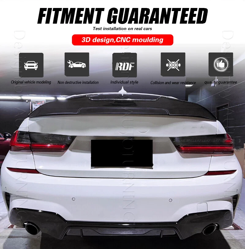 Fitment: Fits for BMW 3 Series G20 Sedan G80 M3 2018-2025 Specifications: Product Name: Rear Spoiler Material: Carbon Fiber Package Size:131*32*11cm Package Weight:2.32kg Features: Made of High Quality Lightweight Carbon Fiber. Latest Design GT Wing Spoiler Completed Kit, Improve Handling And Make Tail More Stable in High Speed. Water Transfer Carbon Fiber for Highest Durability and Appearances. Adjustable Angles for Customizable Usages and Efficiencies, Enhances Aerodynamic. Reduces Drag, Increases Fuel Efficiency, Reinforces Downforce, Traction and Stability. Double-sided adhesive paste, Easy to Install. Package included: 1 x Spoiler with self-adhesive glue tape Carbon Fiber Spoiler FOR BMW The Rear Trunk Spoiler is one of the simplest mods you can do to the exterior of your car that will give your car that completely different look. Not only are spoilers meant for great looks, they also help with the aero dynamics of the car by lowering drag, or helping to put more downforce on the car making sure that the wheels stay grounded for maximum traction. Fitment: Fits for BMW 3 Series G20 Sedan G80 M3 2018-2025 Specifications: Product Name: Rear Spoiler Material: Carbon Fiber Package Size:131*32*11cm Package Weight:2.32kg Features: Made of High Quality Lightweight Carbon Fiber. Latest Design GT Wing Spoiler Completed Kit, Improve Handling And Make Tail More Stable in High Speed. Water Transfer Carbon Fiber for Highest Durability and Appearances. Adjustable Angles for Customizable Usages and Efficiencies, Enhances Aerodynamic. Reduces Drag, Increases Fuel Efficiency, Reinforces Downforce, Traction and Stability. Double-sided adhesive paste, Easy to Install. Package included: 1 x Spoiler with self-adhesive glue tape Delivery details Payment and TAX Return Policy Warranty Contact us Delivery details NOTE: The shipping fee is only for the mainland of each country, it does not include the overseas territories, such as Virgin Islands (U.S.) , Puerto Rico, Hawaii , French Reunion Island, etc. But on ebay, when buyers from Puerto Rico and overseas territories , the shipping fee is equal to United States, it is NOT correct,. please contact us for correct shipping fee, or we will cancel the order. Sorry for the inconvenience, and thanks for your cooperation. 2. If you want to upgrade the shipping, please contact us before making payment, we will revise the shipping fee. 3. We will ship according to your Ebay address. Please make sure it is correct and include phone number for delivery. If you want to know the exact shipping time , please contact us . Payment and TAX 1.We accept Multiple Payment Methods Available: Credit Card, Debit Card, Gift Card, Apple Pay, Goggle Pay, PayPal and PayPal Cred. 2.Please leave note for your special request (e.g. Colors or Size) in ebay note when you pay the order. 3.Your must complete the payment within 7 days or Ebay will automatically open unpaid item case For US Buyer:The invoice value of each item is less than 800USD ,so you no need to pay any tariff . NON-US Buyer Note: Most countries are tax free based on our invoices, if tax is required, which will be buyer's responsibility. Return Policy 1.Customer satisfaction is our top goal. We believe our items are so outstanding. All products are quality checked. They are new and in good condition when shipped to our customers. We are convinced you will be happy with your Purchase. 2.If product is defective or damage upon arrival, or wrong product shipped, please contact us immediately. Returns accepted within 30 days of delivery date and item must be in original new condition, not worn or altered in any way with attached tags & wrap. Otherwise deal is final. Return shipping must be paid by buyer. Please always contact us to resolve any problems, we will do our best to satisfy you. Thanks very much. Warranty 30 Days Money Back It is our goal to provide 100% satisfaction and peace of mind to our customers. If you are not satisfied with the products for any reason within 30 days of receiving the item. (Items must be not opened in their original package. Any mark of installation, mounting, cutting, scratch or using will not be allowed.) Please be free to contact us first if you have any problems.thanks. Contact us 1.We are trying our best to explain all details of the products here! If you have any question, please feel free to contact us by Ebay message, and We will get back to you within 24-48 hours. 2.Customer satisfaction is our NO.1 priority. If you are not happy with the item that you purchase, please contact us first. We will try our best to solve the problem with you.Please leave us a positive feedback if you receive the item.Please do not leave negative or neutral feedback without any contact.If you haven't received item in 30 days, please contact us and we will arrange refund.We appreciate your business.Happy Bidding & Have a nice day! 3.Working hours: From 8 a.m. to 6 p.m. from Monday to Friday. From 8 a.m. to 12 a.m. on Saturday morning Holiday/Rest time: Saturday afternoon and Sunday