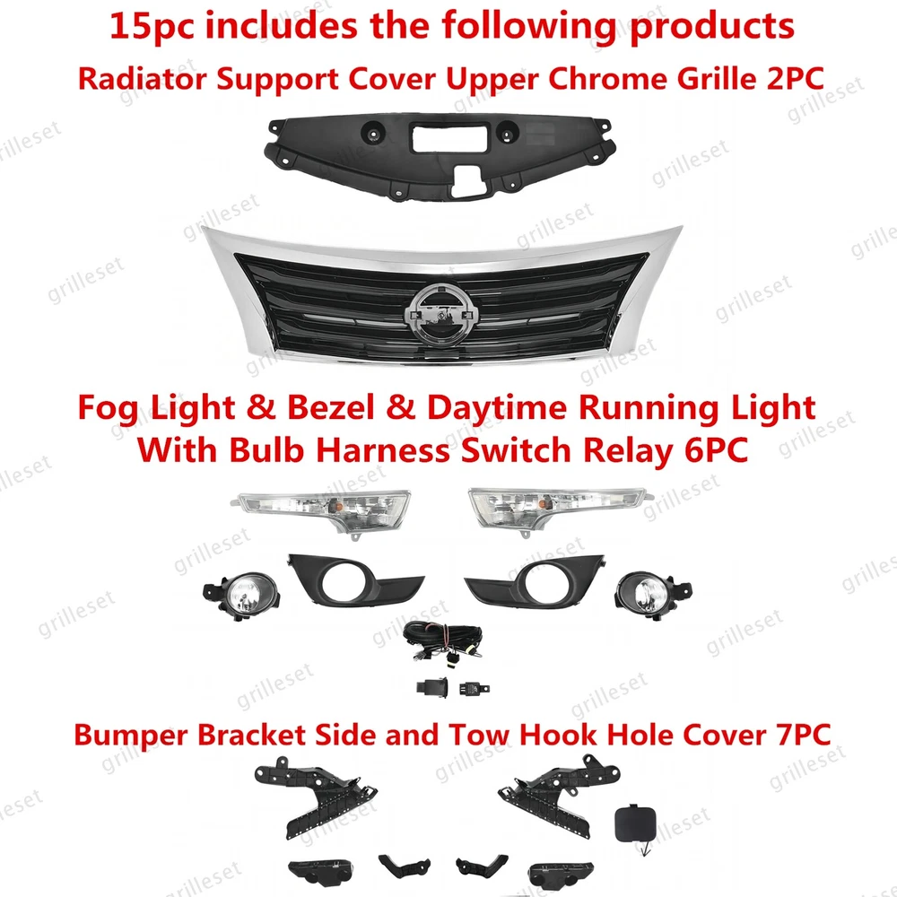 Fit for : 1 Set (15 PCS) Includes:(See more pictures for details) 1 Pc front radiator support cover 1 Pc front upper black grille with chrome trim 2 Pcs front daytime running light with bulb 2 Pcs fog lights with bulb,switch,relay and harness 2 Pcs fog light bezels 2 Pcs front bumper brackets 4 Pcs front bumper side brackets 1 Pc front Tow hook hole cover Item OE number : 62078-3TA0B;62310-3TA0A;26135-3TA0A;26130-3TA0A;62257-3TA0B;62258-3TA0B;26155-9B91D;26150-9B91D;62059-3TA0A;62058-3TA0A;62227-3TA0A;62226-3TA0A;62221-3TA0A;62220-3TA0A;622A0-3TA0A Installation : Perfect fit direct replacement, no modifications required. Installation manual not provided; we recommend professional installation. Item's-Features : Superior quality kit 100% brand new Made from high-quality materials Excellent replacement part, no modifications needed Other parts fit for