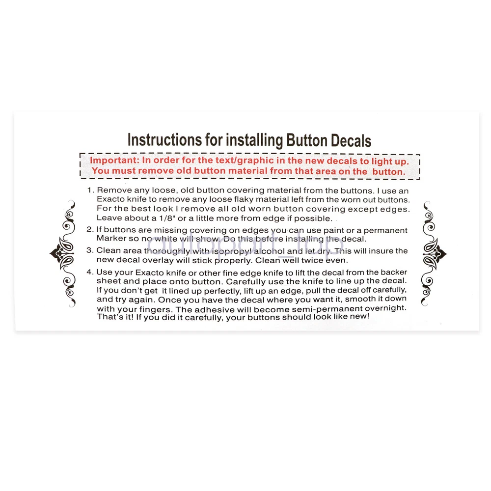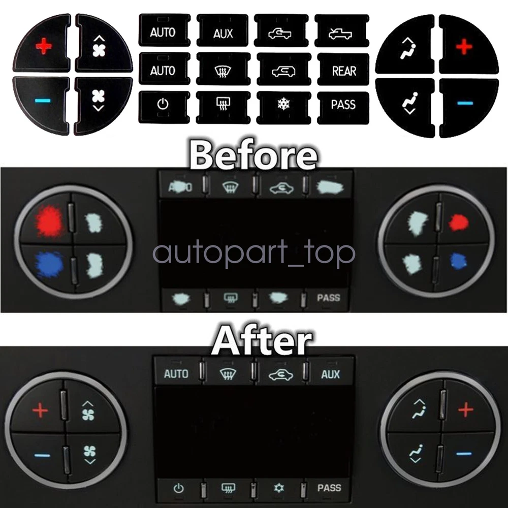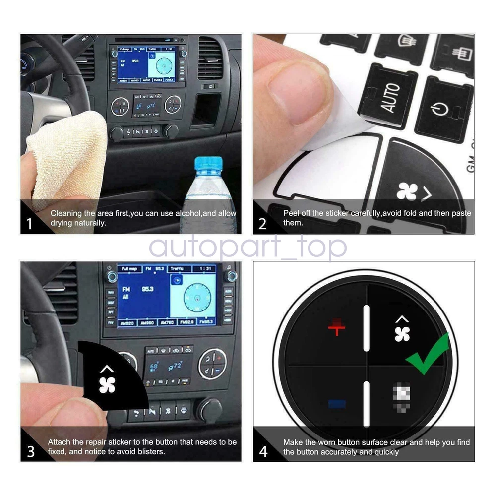 Autopart_top For Buick Enclave 08-12 High Grade Vinyl AC Dash Button Repair Decal Stickers ITEMS DESCRIPTION: This listing features for Radio Control Button Decal Stickers, specially design for Chevrolet GM Buick Vehicles. These stickers are precisely pre-cutted for a special fit and edge. Custom made for each specific car and model so as long as the year and model of your car is the same as this listing, it can perfect fit. And the Stickers are made with performance grade Vinyl to make itself durable and long lasting in the road abuse. Features: 1 Year Warranty 100% New Brand Easily Do It Yourself (DIY): Clean Buttons' surface 1st, Apply them over matching buttons; Fix Ruined Faded A/C Controls Buttons; Blacked film adhesive, to reduce "light bleed through"; Cut to allow factory lighting to come through your Vehicle Installation: Please have the surface complete clean and dry first before applying this Slowly peel off the back sheet off the decal and apply to the correct place Do not use high pressure water gun to flush FITMENT: 2008-2012 Buick Enclave 2007-2013 Chevrolet Avalanche 2007-2014 Chevrolet Silverado 1500 2007 Chevrolet Silverado 1500 Classic 2007 Chevrolet Silverado 1500 HD Classic 2007-2014 Chevrolet Silverado 2500 HD 2007 Chevrolet Silverado 3500 Classic 2007-2014 Chevrolet Silverado 3500 HD 2007-2014 Chevrolet Suburban 1500 2007-2014 Chevrolet Suburban 2500 2006-2014 Chevrolet Tahoe 2009-2013 Chevrolet Traverse 2007-2011 GMC Acadia 2007-2014 GMC Sierra 1500 2007 GMC Sierra 1500 Classic 2007 GMC Sierra 1500 HD Classic 2007-2014 GMC Sierra 2500 HD 2007 GMC Sierra 1500 HD Classic 2007 GMC Sierra 3500 Classic 2007-2014 GMC Sierra 3500 HD 2006-2014 GMC Yukon 2007-2014 GMC Yukon XL 1500 2006-2013 GMC Yukon XL 2500 2007-2010 Saturn Outlook Please Note: Communication is the best way to solve the problem. If you have any problems after purchasing, please contact us in time, before opening return or case. Package Includes: 1x AC Dash Button Repair Kit 1x Installation instructions Shipping policy: Payment: Returns: About us: Shipping policy: 1.Orders are usually shipped within 24 hours after your payment(except weekends & official holidays). You can log on to eBay to check your logistics tracking number. 2.Please make sure to provide us with correct,precise and detailed shipping address before purchase, and cannot change it once purchased. Payment: PayPal payment accepted only.Please purchase and pay for the item through the eBay. 1. If you need this product, please purchase the goods through eBay and pay, only Paypal can be used for payment. 2. Please check the payment method before buying. Returns: 1. If any items are found to be defective or not working properly after receipt, you need to return, exchange or refund, please contact us by email to seek conditions, we will provide for such situations solution and best service. 2. The item must be returned in a new state, including all attached accessories and materials, including the factory box. Unless the product is returned due to a defect, no refund will be made for transportation and handling. About us: 1.Thanks for purchasing in our store,if you have any questions, please contact us immediately by mail. We will provide you with the high quality service. 2.If you are satisfied with our products, please give us a positive feedback.