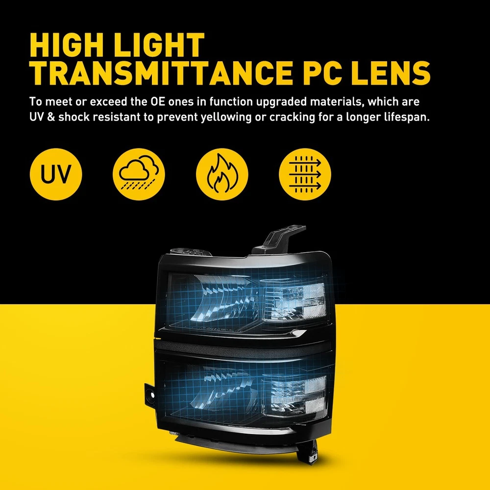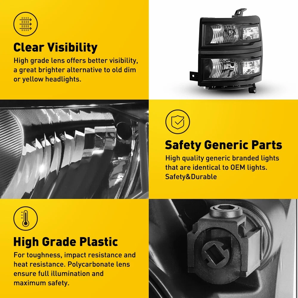 Headlights Headlamps Fit For 2014-2015 Chevy Silverado 1500 models only Fit for: 2014-2015 Chevy Silverado 1500 Models Only (Fit 2014 New Body Style Models Only; Does NOT Fit HD Models) Specifications: OE number: 20933724, 20933725, 20933722, 20933723, 23172782, 23172783 GM2502389, GM2503389, GM2502395, GM2503395, GM2502410 Material: ABS+PC (ABS Plastic Housing/Polycarbonate lens) Appearance color: 1.Housing Color: Black 2.Lens Color:Clear 3.Reflector Color:White Note: Projector ×(Not include) DRL ×( Not Include) For Chevy Silverado 1500 2014-2015 Pair Black Headlights Headlamps Assemblies Headlights Headlamps Fit For 2014-2015 Chevy Silverado 1500 models only Fit for: 2014-2015 Chevy Silverado 1500 Models Only (Fit 2014 New Body Style Models Only; Does NOT Fit HD Models) Specifications: OE number: 20933724, 20933725, 20933722, 20933723, 23172782, 23172783 GM2502389, GM2503389, GM2502395, GM2503395, GM2502410 Material: ABS+PC (ABS Plastic Housing/Polycarbonate lens) Appearance color: 1.Housing Color: Black 2.Lens Color:Clear 3.Reflector Color:White Note: Projector ×(Not include) DRL ×( Not Include) Bulb × (Not include) Features: *Easy to install: Direct replacement, drilling and cutting are not required. *Superior quality: Made of ABS and PC materials with toughness and heat resistance functions to ensure its long service life and durability. *Angle adjustment: Equipped with a headlamp Angle adjustment knob, you can adjust the best Angle of view through the knob. *Suggestion: 1.Please confirm the OE number before purchasing!!! 2.Professional installation is required!!! Packaging include: Headlights*2(Left+Right) ABOUT US For Chevy Silverado 1500 2014-2015 Pair Black Headlights Headlamps Assemblies Headlights Headlamps Fit For 2014-2015 Chevy Silverado 1500 models only Fit for: 2014-2015 Chevy Silverado 1500 Models Only (Fit 2014 New Body Style Models Only; Does NOT Fit HD Models) Specifications: OE number: 20933724, 20933725, 20933722, 20933723, 23172782, 23172783 GM2502389, GM2503389, GM2502395, GM2503395, GM2502410 Material: ABS+PC (ABS Plastic Housing/Polycarbonate lens) Appearance color: 1.Housing Color: Black 2.Lens Color:Clear 3.Reflector Color:White Note: Projector ×(Not include) DRL ×( Not Include) Bulb × (Not include) Features: *Easy to install: Direct replacement, drilling and cutting are not required. *Superior quality: Made of ABS and PC materials with toughness and heat resistance functions to ensure its long service life and durability. *Angle adjustment: Equipped with a headlamp Angle adjustment knob, you can adjust the best Angle of view through the knob. *Suggestion: 1.Please confirm the OE number before purchasing!!! 2.Professional installation is required!!! Packaging include: Headlights*2(Left+Right) FAQ Shipping Returns Contact Us Payment Why swith to LED? LEDs not only give your vehicle a clean, modern look but, with proper use, will outlast any halogen bulb and HID bulb! Low energy draw, high lumen output, and instant on/off LED technology out shines stock bulbs in every way. Which bulbs are used in my vehicle? Check Sylvania automotive lamp replacemnt guide , you can select the year, make, and model of your vehicle, then select the application you want to replace or upgrade from stock. What does CAN Bus mean? CAN Bus means Controller Area Network Bus. This system monitors your vehicle and reports operating conditions. CAN Bus systems are commonly found in European vehicles such as BMW, Audi, Mercedes, Volkswagen, Porsche, and in many American vehicles. While most late model American vehicles have CAN Bus systems, it is always good to check with your vehicle dealer to see which system your vehicle has before purchasing electrical products. When do you need Warning Canceller? Some vehicles with cmplex internal computers(such as Audi,BMW,Jaguar,Mercedes,etc.) might report on-dash errors or flickering on the headlights. The warning canceller fixes the dashboard warning and flickering effect. Bulb Out Dashboard Error: On some vehicles, the dashboard will report as if you have a headlight bulb missing or burnt. It does not affect the headlights functioning, but the light on-dash will be on. The warning canceller fixes the issue. Flickering Issue: This happens when your vehicle does not recognize the new headlights installed. When turning the headlights on, the vehicle's computer does not understand the signal back from the headlights hence thinking they are still off. This triggers the headlight flickering effect. The warning canceller solves this issue. LED Advantages: Very low and efficient energy consumption than halogen bulbs & HID Bulbs Compared with HID bulbs, LED bulbs Light up instantly, no warm up period Low voltage protection, high precision constant current driver chip Longer lifespan than HID and halogen bulbs Light can be controlled easily in color and intensity Easy to install a LED headlight conversion kit (1) We will ship your item(s) within 24 hours. (2) We ship this item to US only via USPS first class mail. It usually takes 3-6 working days to deliver. How Long Will It Take to Receive My Refund? If you have emailed us for a refund ,once we have approved it ,after 60 days your money will be refunded. The estimated time for the refund to appear in your account is based on the payment method you use. Paypal is the only supported in NIGHTEYE Store. Please notify us within 30 days after you've received your purchased item. All return requests must be submitted through your eBay account. NOTE: Buyers pay for the return shipping fee. Items to be returned must be in resalable condition, for example: You do not satisfy the item quality Item do not fit your vehicle perfect Item can not reach your expectation The item arrived be broken You do not receive the item Parcel Lost Receive the wrong item If you have problems with the above issue, please Contact Us immediately ! [Our office hours are MONDAY - Saturday 9:00PM - 6:00PM PST, but we will response yo