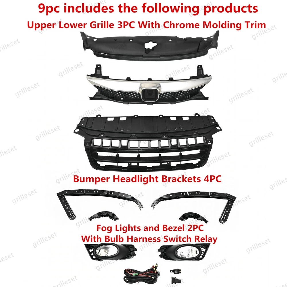 Fit for : 1 Set (9 PCS) Includes:(See more pictures for details) 1 Pc front radiator support cover 1 Pc front upper black grille with chrome trim 1 Pc front lower black grille mesh 2 Pcs front headlight brackets iron 2 Pcs front bumper brackets 2 Pcs fog lights assembly with bezel,bulb,switch,relay and Harness Item OE number : 71121-SNA-A50;71122-SNA-A50;71107-SNE-A50;71125-SNA-A00;71190-SNA-A00;71140-SNA-A00;71198-SNA-A02;71193-SNA-A02;33951-SNA-305;33901-SNA-305 Installation : Perfect fit direct replacement, no modifications required. Installation manual not provided; we recommend professional installation. Item's-Features : Superior quality kit 100% brand new Made from high-quality materials Excellent replacement part, no modifications needed Other parts fit for
