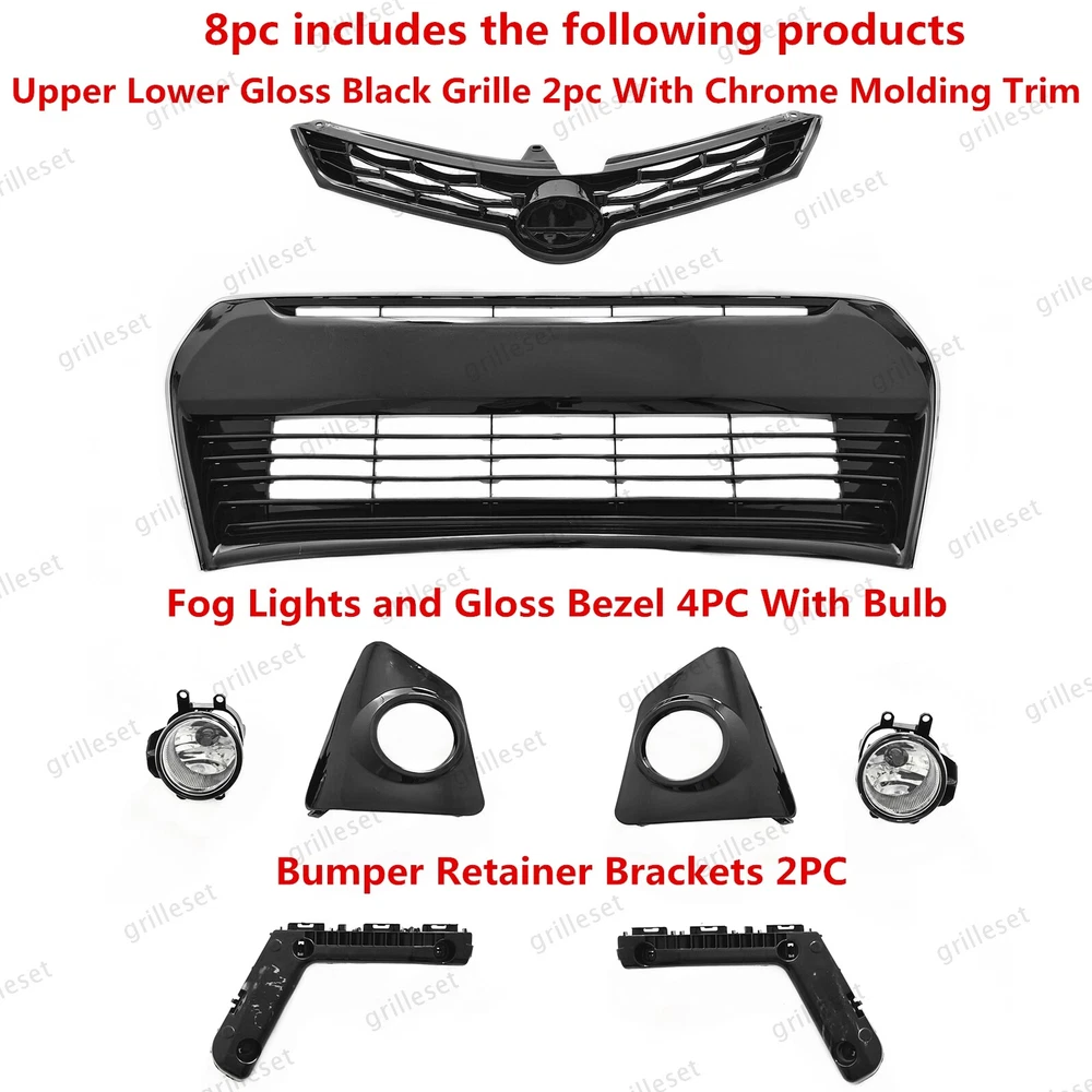 Fit for : 1 Set (8 PCS) Includes:(See more pictures for details) 1 Pc front upper black grille 1 Pc front lower gloss black grille mesh with chrome trim 2 Pcs fog lights with bulb 2 Pcs fog light bezels(gloss black) 2 Pcs front bumper brackets Item OE number : 53111-02770 ; 53126-02090; 53102-02210 ; 52116-02240; 52115-02240; 81482-02470 ; 81481-02480 ; 81220-02160 ; 81210-02160 Installation : Perfect fit direct replacement, no modifications required. Installation manual not provided; we recommend professional installation. Item's-Features : Superior quality kit 100% brand new Made from high-quality materials Excellent replacement part, no modifications needed Other parts fit for