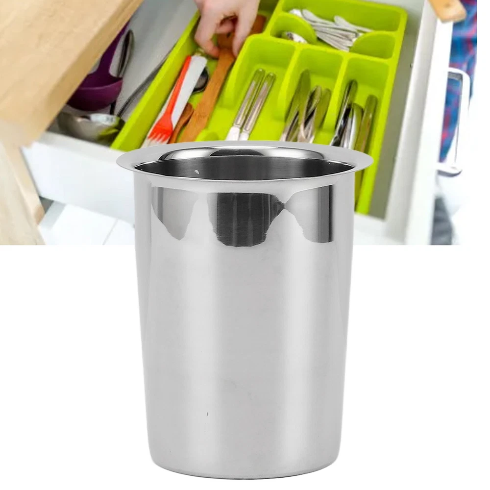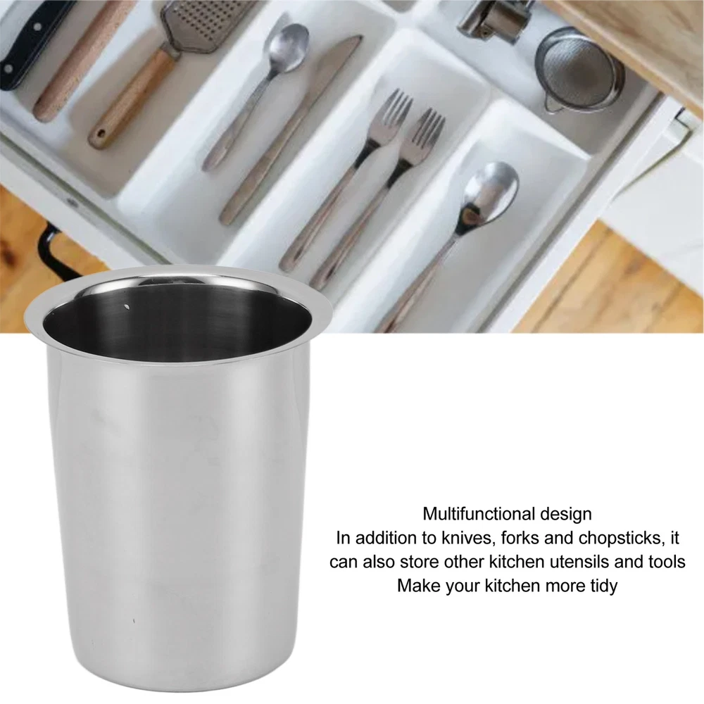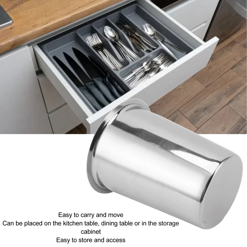 Features 1、LARGE CAPACITY STORAGE: Stainless steel knife, fork and chopsticks bucket, large capacity storage for your cutlery, keep your desktop neat and organized. 2、STAINLESS STEEL MATERIAL: The kitchen utensil holder is made of premium stainless steel, durable and easy to clean, ensuring the product lasts for a long time. 3、MULTIFUNCTIONAL DESIGN: In addition to knives, forks and chopsticks, the kitchen utensils organizer can also organize other kitchen utensils and tools, making your kitchen more neat and tidy. 4、UNIQUE APPEARANCE: The kitchen utensil holder features a simple and stylish design that matches with various kitchen décor styles, adding charm to your kitchen. 5、CONVENIENT AND PRACTICAL: The kitchen utensils organizer is easy to carry and move, and can be placed on the kitchen table, dining table or storage cabinet for easy storage and access. Specification Item Type: Kitchen Utensil Holder Material: 304 Stainless Steel Size: Bottom Length: Approx. 8.6cm/3.4in Top Outer Diameter: Approx. 11.5cm/4.5in Top Inside Diameter: Approx. 9.5cm/3.7in Height: Approx. 13.8cm/5.4in Use: Tableware Storage Package List 1 x Kitchen Utensil Holder