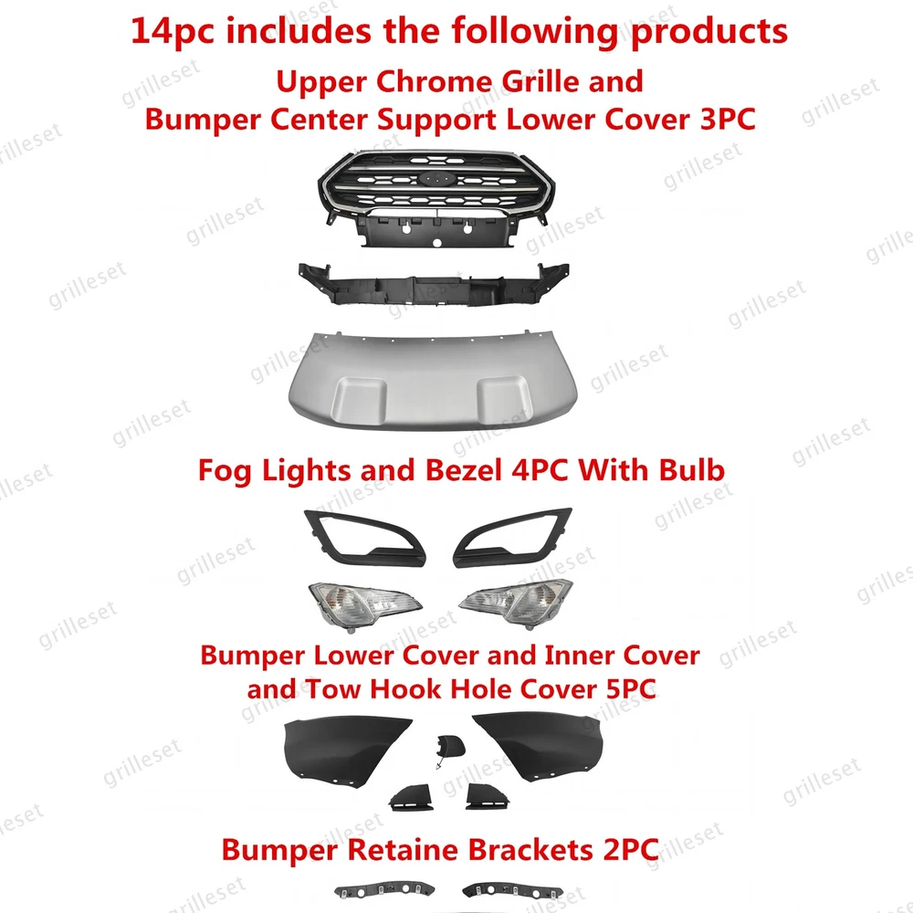 Fit for : 1 Set (14 PCS) Includes:(See more pictures for details) 1 Pc front upper black grille with chrome trim 1 Pc front bumper bracket center support 1 Pc front bumper lower center cover (silver) 2 Pcs f ront Fog lights with 2 bulb 2 Pcs fog light bezels 2 Pcs front bumper lower cover 2 Pcs front bumper lower inner cover 2 Pcs front bumper brackets 1 Pc tow hook hole cover Item OE number : GN1Z-17B968-AB;GN1Z-8419-BA;GN1Z17C897C;GN1Z-17D957-NB;GN1Z-15266-BD;GN1Z-15266-BC;GN1Z-13200-AE;GN1Z-13200-AC;GN1Z-17D957-CB;GN1Z-17D957-DB;GN1Z-17A900-AD;GN1Z-8419-AC;GN1Z-8419-BC;GN1Z-17A870-A;GN1Z-17A869-B Installation : Perfect fit direct replacement, no modifications required. Installation manual not provided; we recommend professional installation. Item's-Features : Superior quality kit 100% brand new Made from high-quality materials Excellent replacement part, no modifications needed Other parts fit for