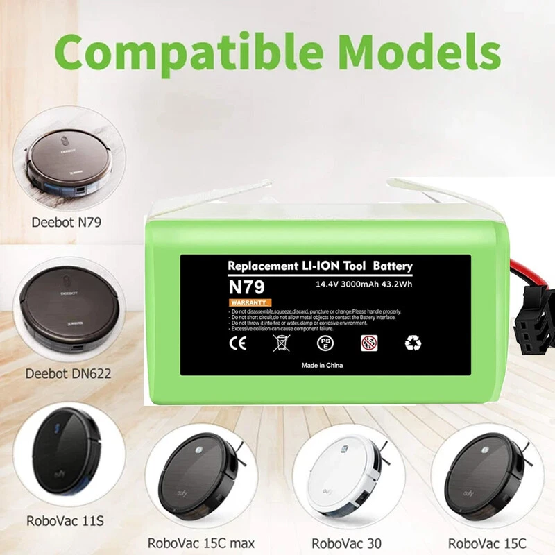 Product Description About this item Lithium-ion 🌳【Battery Type】Battery type: Li-ion battery,Voltage: 14.4V, Capacity: Upgraded 3000mAh(No Fake High Label Capacity). No memory effect, no pollution, and low self-discharge, can be charged or discharged as needed without loss of capacity. 100% compatible with original charger. 🌳【Compatibility】Compatible with Ecovacs Deebot N79S, Deebot N79, Deebot DN622, Eufy RoboVac 11, RoboVac 11S, RoboVac 11S MAX, RoboVac 12, RoboVac 15T, RoboVac 15C, RoboVac 15C MAX, RoboVac 30, RoboVac 30 MAX, RoboVac 30C, RoboVac 35C, G10 Hybrid, G30, G30 Edge, G30 Hybrid, G30 Verge. See more compatible model in description. 🌳【600+ Recharge Cycles】POWTREE 3.0Ah Ecovcas battery replacement can be recharged up to 600+ cycles of use. No memory effect, low self-discharge rate and long-lasting battery life 🌳【High Quality】Battery uses the highest quality cells, safe with rapid-charge technology while providing overcharge and over discharge multiple protection to increase the life of the battery. Reliable safeguard features with the protection for short-circuit, output over-voltage, over-heat and output over-current. Perfect Battery Management System, high-end protection IC. Power Battery to support max. 8A discharge. Compatible with Ecovacs N79S, 500, N79, N79SE, N79W, DN622, DN622.11 Robot Vacuum Cleaners. 14.4V 3000mAh Li-ion rechargeable replacement battery makes vacuum lasting around 100 minutes per charge. Easy to install, local sale support, 24/7 response to online messages, 12 months warranty. Futures : 3000mAh High Capacity Battery Li-ion Rechargeable battery, convenient to use. And it has no memory effect. Can be charged or discharged as needed without loss of capacity. Same size & function as original battery, don't worry damaging your robot. Quick charge and easy to install. ISO9001, RoHS, and CE certified NO FAKE HIGH "LABEL" CAPACITY High Performance Li-ion Battery with 600+ Recharge Cycles With 3000mAh capacity, the battery can last 120-180 minutes after being fully charged (Depending on use & setting), like the original. Built-in multiple protections against overload, overvoltage, overcurrent, short circuit and internal overheating, ensure effective and safe cleaning in your home. Imported high density lithium battery, higher cost, better performance, more durable(can be recharged 600+ cycles) Compatible With:(use"Ctrl+F" to find your own PN & Model) Compatible for Deebot Series: Ecovacs Deebot N79, Deebot N79S, Deebot 600, Deebot 601, Deebot DN622, Deebot 661 Compatible for RoboVac Series:Eufy RoboVac 11 (T2102), RoboVac 11S (T2108), 11S MAX (T2126), RoboVac 12, 15T, 15C (T2120), 15C MAX, 25C Max, 30, 30C, 30 MAX, 35C, G10 Hybrid, G30, G30 Edge, G30 Hybrid, G30 Verge Compatible for :for Conga 990, Tesvor x500 NOT Compatible with: NOT for Eufy RoboVac 11+, iLife A4/A4S/A4S pro/A6/A9/V7/V7S/V7S pro Compatible Models For Eufy RoboVac 11, RoboVac 11S, RoboVac 11S MAX For Eufy RoboVac 12, RoboVac 15C, RoboVac 15C MAX, RoboVac 15T For Eufy RoboVac 30, RoboVac 30C, RoboVac 30 MAX, RoboVac 35C For Ecovacs Deebot N79,Ecovacs Deebot N79S,Ecovacs Deebot DN622 Ecovacs Deebot N79, Deebot N79S, Deebot DN622, Deebot DN621, Eufy RoboVac 11, RoboVac 11S, RoboVac 11S MAX, RoboVac 15T, RoboVac 30, RoboVac 30C Max, RoboVac 15C, RoboVac 15C MAX, RoboVac 12, RoboVac 35C. For Eufy RoboVac 11, RoboVac 11S, RoboVac 11S MAX For Eufy RoboVac 12, RoboVac 15C, RoboVac 15C MAX, RoboVac 15T For Eufy RoboVac 30, RoboVac 30C, RoboVac 30 MAX, RoboVac 35C For Ecovacs Deebot N79,Ecovacs Deebot N79S,Ecovacs Deebot DN622 For Eufy RoboVac 11, RoboVac 11S, RoboVac 11S MAX For Eufy RoboVac 12, RoboVac 15C, RoboVac 15C MAX, RoboVac 15T For Eufy RoboVac 30, RoboVac 30C, RoboVac 30 MAX, RoboVac 35C For Ecovacs Deebot N79S, 500, N79, N79SE, N79W, DN622, DN622 About Us Welcome to our store! We are a professional worldwide wholesale company. High product quality, reasonable prices, excellent customer service and a reliable credit standing is our tenet.If you like our products, please add my eBay shop to your "My Favorites" list. All the products we are selling include factory warranty , don’t cover items that have been abused, burned and damaged in any form. Payment We accpet payment via PayPal , E-wallet , some Credit Card , Direct Debit and Other specific payment methods. Import duties,taxes and charge are not included in the item's price or shipping cost.These charges are the buyer's responsibility. Please check with your country's customs office to determine what these additional costs will be prior to bidding or buying. Insurance is included in the Shipping & Handling costs paid. Shipping Items are generally shipped out in 1-3 business day after your payment has been cleared (Sat. & Sun. excluded.) Orders from the United States Warehouse will be shipped out via USPS or UPS. The shipment usually takes 3-7 business days(Saturday and Sunday excluded), if you need the item urgently, please contact us for detail before purchasing. Local pick up is not available. Orders from China will be shipped via Belgian Post or Post NL.The shipment will take 15-35 working days,please contact us if you didn't get the parcel for a long time. We do not ship to APO, FPO, Alaska, Hawaii and Puerto Rico addresses, and we are unable to ship to PO BOX for this item. Please provide your psychical address. Returns You have 60 days to return it from the date it was received. All returned items must be in the original package and you must provide us with the shipping tracking number,specific reason for the return and your ebay ID. We will refund your full winning bid amount , upon receipt of the item in its original condition and package with all components and accessories included. Contact Us Dear buyers,we appreciate your business, if you are satisfied with our service , please leave us a Positive feedback and rate the details of the transaction (Detailed Seller Ratings) with a " Pefect Stars ". We