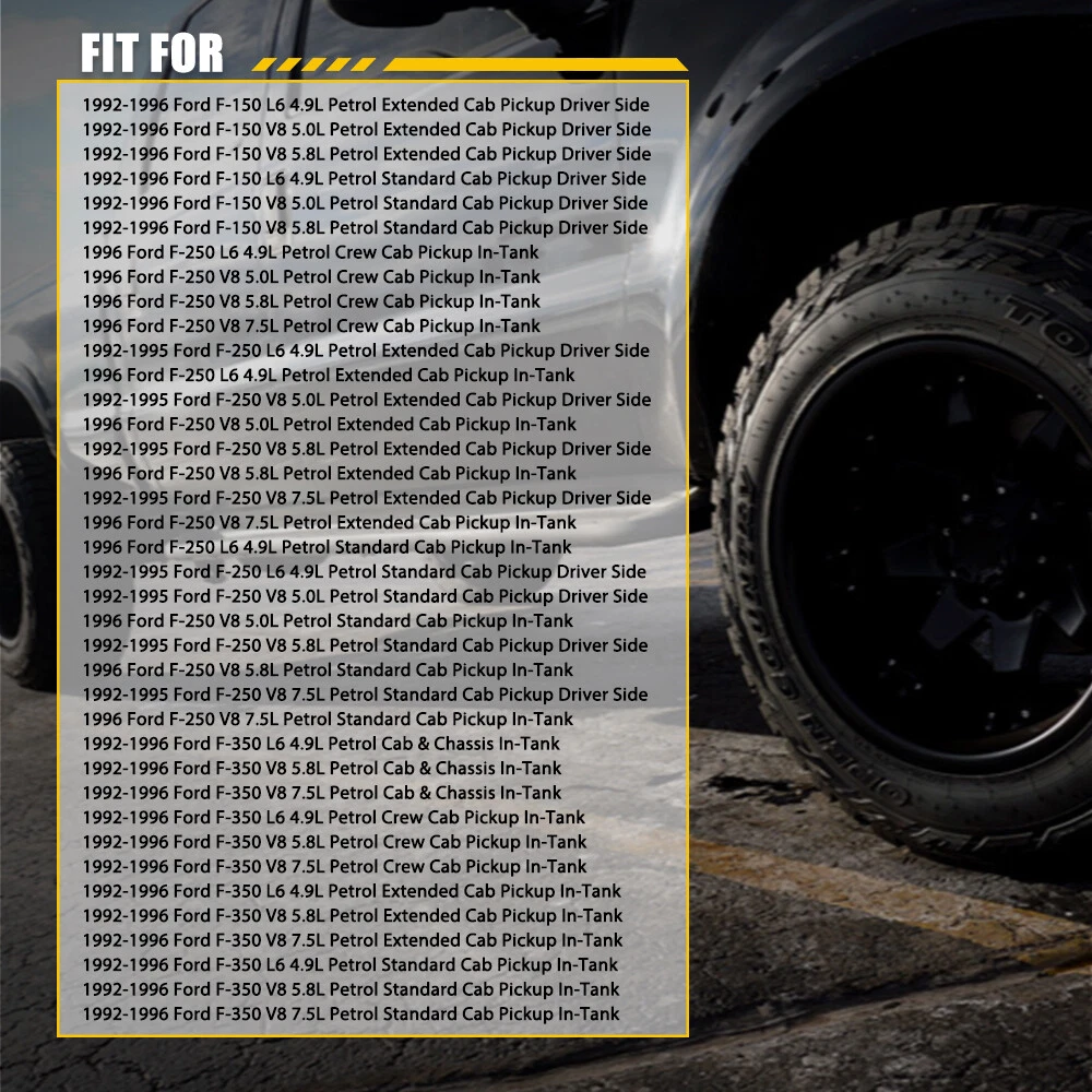Fit for; 1992-1996 Ford F-150 L6 4.9L Petrol Extended Cab Pickup Driver Side 1992-1996 Ford F-150 V8 5.0L Petrol Extended Cab Pickup Driver Side 1992-1996 Ford F-150 V8 5.8L Petrol Extended Cab Pickup Driver Side 1992-1996 Ford F-150 L6 4.9L Petrol Standard Cab Pickup Driver Side 1992-1996 Ford F-150 V8 5.0L Petrol Standard Cab Pickup Driver Side 1992-1996 Ford F-150 V8 5.8L Petrol Standard Cab Pickup Driver Side 1996 Ford F-250 L6 4.9L Petrol Crew Cab Pickup In-Tank 1996 Ford F-250 V8 5.0L Petrol Crew Cab Pickup In-Tank 1996 Ford F-250 V8 5.8L Petrol Crew Cab Pickup In-Tank 1996 Ford F-250 V8 7.5L Petrol Crew Cab Pickup In-Tank For Ford F Series F150 F250 Truck Rear 1990-1996 Fuel Pump Module Assembly 19gal Fit for; 1992-1996 Ford F-150 L6 4.9L Petrol Extended Cab Pickup Driver Side 1992-1996 Ford F-150 V8 5.0L Petrol Extended Cab Pickup Driver Side 1992-1996 Ford F-150 V8 5.8L Petrol Extended Cab Pickup Driver Side 1992-1996 Ford F-150 L6 4.9L Petrol Standard Cab Pickup Driver Side 1992-1996 Ford F-150 V8 5.0L Petrol Standard Cab Pickup Driver Side 1992-1996 Ford F-150 V8 5.8L Petrol Standard Cab Pickup Driver Side 1996 Ford F-250 L6 4.9L Petrol Crew Cab Pickup In-Tank 1996 Ford F-250 V8 5.0L Petrol Crew Cab Pickup In-Tank 1996 Ford F-250 V8 5.8L Petrol Crew Cab Pickup In-Tank 1996 Ford F-250 V8 7.5L Petrol Crew Cab Pickup In-Tank 1992-1995 Ford F-250 L6 4.9L Petrol Extended Cab Pickup Driver Side 1996 Ford F-250 L6 4.9L Petrol Extended Cab Pickup In-Tank 1992-1995 Ford F-250 V8 5.0L Petrol Extended Cab Pickup Driver Side 1996 Ford F-250 V8 5.0L Petrol Extended Cab Pickup In-Tank 1992-1995 Ford F-250 V8 5.8L Petrol Extended Cab Pickup Driver Side 1996 Ford F-250 V8 5.8L Petrol Extended Cab Pickup In-Tank 1992-1995 Ford F-250 V8 7.5L Petrol Extended Cab Pickup Driver Side 1996 Ford F-250 V8 7.5L Petrol Extended Cab Pickup In-Tank 1996 Ford F-250 L6 4.9L Petrol Standard Cab Pickup In-Tank 1992-1995 Ford F-250 L6 4.9L Petrol Standard Cab Pickup Driver Side 1992-1995 Ford F-250 V8 5.0L Petrol Standard Cab Pickup Driver Side 1996 Ford F-250 V8 5.0L Petrol Standard Cab Pickup In-Tank 1992-1995 Ford F-250 V8 5.8L Petrol Standard Cab Pickup Driver Side 1996 Ford F-250 V8 5.8L Petrol Standard Cab Pickup In-Tank 1992-1995 Ford F-250 V8 7.5L Petrol Standard Cab Pickup Driver Side 1996 Ford F-250 V8 7.5L Petrol Standard Cab Pickup In-Tank 1992-1996 Ford F-350 L6 4.9L Petrol Cab & Chassis In-Tank 1992-1996 Ford F-350 V8 5.8L Petrol Cab & Chassis In-Tank 1992-1996 Ford F-350 V8 7.5L Petrol Cab & Chassis In-Tank 1992-1996 Ford F-350 L6 4.9L Petrol Crew Cab Pickup In-Tank 1992-1996 Ford F-350 V8 5.8L Petrol Crew Cab Pickup In-Tank 1992-1996 Ford F-350 V8 7.5L Petrol Crew Cab Pickup In-Tank 1992-1996 Ford F-350 L6 4.9L Petrol Extended Cab Pickup In-Tank 1992-1996 Ford F-350 V8 5.8L Petrol Extended Cab Pickup In-Tank 1992-1996 Ford F-350 V8 7.5L Petrol Extended Cab Pickup In-Tank 1992-1996 Ford F-350 L6 4.9L Petrol Standard Cab Pickup In-Tank 1992-1996 Ford F-350 V8 5.8L Petrol Standard Cab Pickup In-Tank 1992-1996 Ford F-350 V8 7.5L Petrol Standard Cab Pickup In-Tank Specifications: OE:F6TZ9A407BB, F6TZ9A407BA, SP2006H, MU2006 Features: *Function The function of the fuel pump is to suck the fuel out of the fuel tank, and transfer it to the oil supply line after pressure adding to establish a certain fuel pressure with the fuel pressure regulator. *It is suitable for 19 gallons storage tank. *Note If the fuel pump is broken, it will lead to weak acceleration, slow acceleration, poor start, engine failure lights and other problems. *Direct replacement Simple installation with direct replacement, other modification is not required. Pacakging include: Fuel Pump Module Assembly*1 1.Fuel Transfer Pump 2.Lock-ring 3.O-RING 4.STRAINERS Item Specifics Other Part Number F6TZ9A407BB, F6TZ9A407BA, SP2006H, MU2006 Manufacturer Warranty 1 Year Fitment Type Direct Replacement Manufacturer Part Number SP2006H Mounting Hardware Included Yes Superseded Part Number F6TZ9A407BB, F6TZ9A407BA, SP2006H, MU2006 Type Sending Unit Fuel Type Gas Brand Unbranded Flow Rate 21-26 Interchange Part Number F6TZ9A407BB, F6TZ9A407BA, SP2006H, MU2006 FOR 1992-1996 Ford F-150 L6 4.9L V8 5.0L 5.8L FIT 1996 Ford F-250 V8 5.8L 5.0L 4.9L Pacakging include Fuel Pump Module Assembly*1 Warranty 2 Year Payment Variety of payment methods are accepted, such as credit, debit, gift cards, Apply pay, Google Pay, Paypal and Paypal Credit. Shipping 1. All items will be shipped in 24 hours after receiving your payment . 2. We ship this item to US only via USPS first class mail. It usually takes 3-5 working days to deliver. Returns 1. We offer 60 days return policy. 2. Please contact us if you have any questions with the products . 3. Refund will be sent after we got your returned package. 4. All returned items should be in the original packaging with tracking number. Contact Us We work from Monday - Saturday 9:00AM - 6:00PM, but we will reply once we get your message. There will be delay on response if you send message or E-Mail on Sunday. DESCRIPTION PAYMENT SHIPPING RETURN POLICY CONTACT US Shop Category Store Home LED Headlight ◈ 9005 HB3 ◈ 9006 HB4 ◈ H7 LED Fog Light ◈ H8 H9 H11 LED Plate Light LED Reverse Light LED Brake Light Rear Bumper Light LED Tail Light Tail Light assemblies Car Parts & Accessories ◈ LED Third Brake Light ◈ Other Parts & Accessories Other New List Item For Volkswagen Jetta 2019-2021 Glossy Black Door Pillar Post Side Cover Trim I USD 15.19 2PCS For BMW 2007-2013 X5 E70 X6 E71 E72 LH RH Rearview Wing Mirror Glass Heated USD 30.39 Rubber Hood Seal Gasket Replacement 74146-TBA-A01 For Honda For Civic 2016 -2019 USD 19.09 170 Car Rear View Backup Camera Reverse Cam Parking Waterproof HD Night Vision USD 13.48 20Pcs RGB LED Rock Light Pods Underbody Glow Lamp Offroad SUV Pickup Truck UTV USD 67.44 Hot Item AUXITO Grille Garnish TSS Sensor Cover For 2018-2021 Toyota Tacoma TRD PRO BLACK USD 13.99 WHITE LED Side Door Ligh
