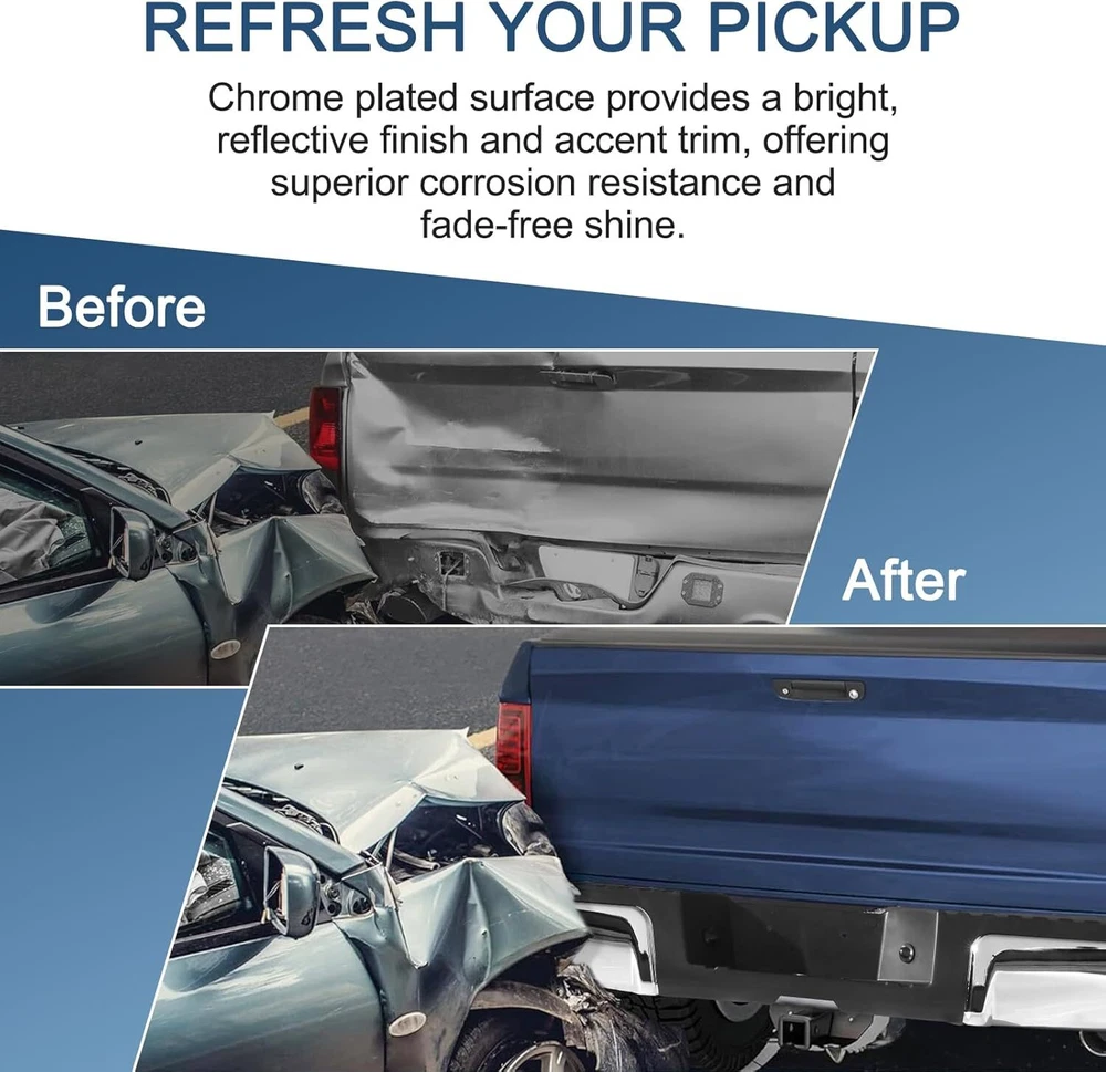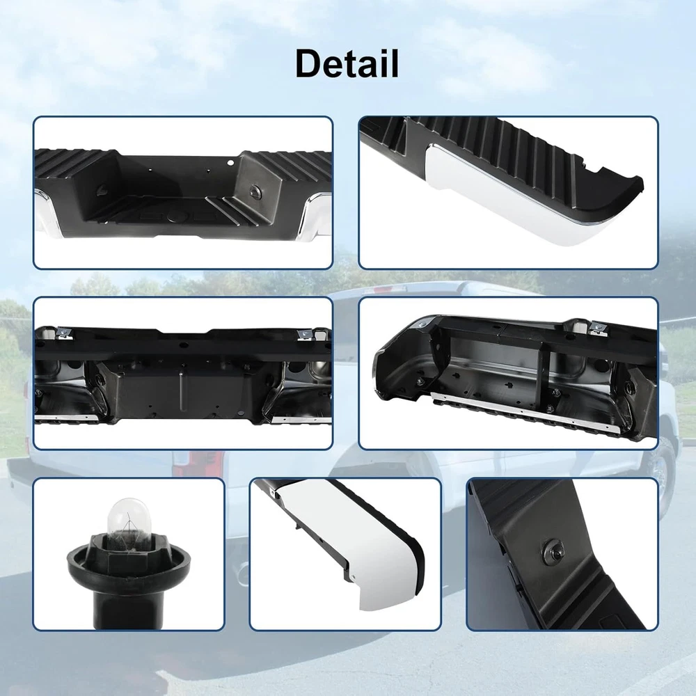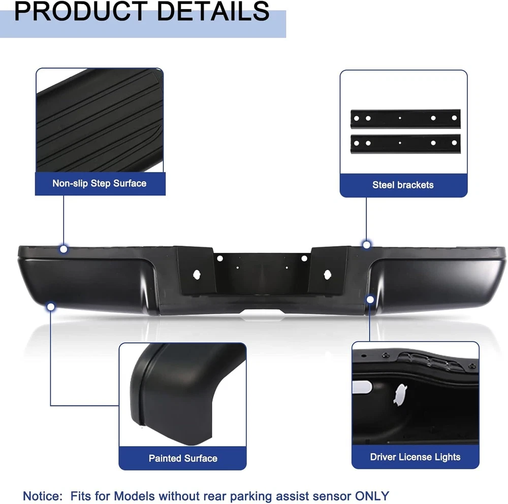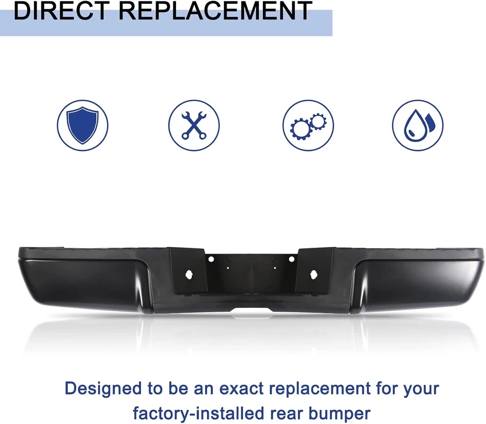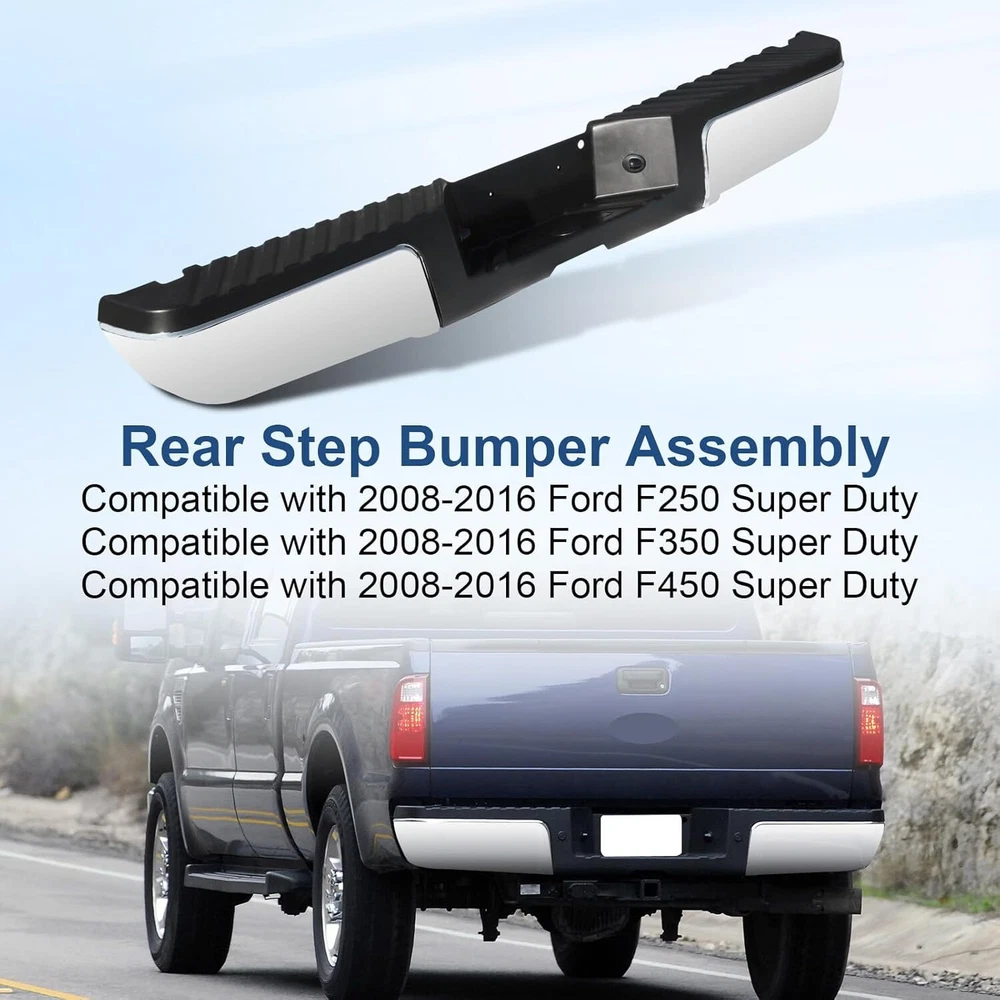 Chrome Style Rear Step Bumpers Assembly Replacement for Ford F-250 F-350 F-450 Super Duty 2008 2009 2010 2011 2012 2013 2014 2015 2016 W/O Park Assist Sensor Holes, Back Bumper Chrome Product Description About this item Rear Bumper replacement for: Ford F250 F350 F450 Super Duty 2008-2016. Note:this rear step bumper WITHOUT Rear Park Assist Sensor Holes. Part Numbers: FO1103148 9C3Z17906B-PFM. NOTE: Check the year and model of the vehicle carefully before buying Good Chrome Steel Construction:The rear step bumper assembly is made from using high quality steel and ABS plastic, it is designed to withstand impacts and protect the rear of your vehicle from damage. Easy installtion: It comes with a rear step bumper, brackets, license plate light and all the necessary hardware to make the installation process quick and easy with no modifications or drilling required. Simply remove your old bumper and replace it with our rear bumper. Enhanced protection: In the event of a collision, the rear bumper absorbs and cushions the impact of the outside world, effectively mitigating collisions and scratches, and restoring your vehicle to like-new condition at all times, protecting both the vehicle body and passengers. About service: Durable and Long Lasting Chrome Rear Bumper,the customer service period is 1 year. Note: Please check the display pictures and OEM to see before purchase. Package Includes: 1x Rear Step Bumper Assembly Compatible Vehicles: Compatible with 2008-2016 Ford F-250 Super Duty Compatible with 2008-2016 Ford F-350 Super Duty Compatible with 2008-2016 Ford F-450 Super Duty Replaces OEM Number: FO1103148,9C3Z17906B-PFM Suitable models Compatible with 2008 Ford F250 F350 F450 Super Duty Compatible with 2009 Ford F250 F350 F450 Super Duty Compatible with 2010 Ford F250 F350 F450 Super Duty Compatible with 2011 Ford F250 F350 F450 Super Duty Compatible with 2012 Ford F250 F350 F450 Super Duty Compatible with 2013 Ford F250 F350 F450 Super Duty Compatible with 2014 Ford F250 F350 F450 Super Duty Compatible with 2015 Ford F250 F350 F450 Super Duty Compatible with 2016 Ford F250 F350 F450 Super Duty Chromium Plating Chrome plated surface provides a bright, reflective finish and accent trim to the bumper, offering superior corrosion resistance and fade-free shine. Easy Installation Brackets, hardware & step pads included. Direct-to-frame mounts require no modifications installation. Step Function Made of durable alloy steel and resilent ABS plastic, this rear bumper assembly provides a convenient multi-purpose step solution for reaching the truck bed, roof rack or tool boxes. Black Style Rear Bumper Assembly Fits for Ford F250 F350 F450 Super Duty 2008-2016 W/O Parking Sensor Holes Back Bumper Replacement Black FO1103149 Product Description About this item 🚗 SUITBLE MODEL: Compatible with Ford F250 F350 F450 Super Duty 2008-2016. Replacement for # FO1103149. Please check the year and model of your vehicle carefully before purchasing. Please be noted that this rear step bumper WITHOUT parking aid sensor holes. 🚗 REFRESH APPEARANCE: Direct replacement for old or damaged bumpers, will give your car an incredible new appearance. Black color is easier to match with any color of vehicle, and brings a more stylish element to your pickup truck. 🚗 DURABILITY AND STRENGTH: The bumper is made of high quality steel and ABS plastic. Equipped with advanced production technology, can effectively enhance the lifetime of the product. Excellent durability and strength also provide protection for use in a variety of scenarios. 🚗 EASY INSTALLATION: Direct bolt-on. Easy to install without any drilling or modification. Professional installation is highly recommended for a better fit of the product to the vehicle. 🚗 PRODUCTS INCLUDED: 1 x Rear Step Bumper and Mounting Hardware. Payment Delivery Details Return Feedback Contact us Payment We accept payment by any of the following methods: Delivery Details Shipping Time Your item will ship within 3 days (Mon-Fri) of your cleared payment. Items will be shipped to the shipping address you specify via Paypal only. We are NOT able to change the shipping address once payment has been made. A tracking number will be provided once your item has shipped. Domestic Buyers No shipping to PO BOX and APO addresses. No shipping to PR, AK, HI. International Buyers International buyers please note: Import duties, taxes and charges are not included in the item price or shipping charges. These charges are the buyer's responsibility. Please check with your country's customs office to determine what these additional costs will be prior to bidding/buying. Return All returns must have RMA number. Returns with no RMA number will be avoided! 1. Changed your mind and don't want the item anymore? We back our products with a 30-DAY SATISFACTION GUARANTEE! (Item must be in the original condition as it was received. 30 Days Refund, 30 Day Replacement.). Brand New items will have 30 days warranty or replacement policy. 2. Restocking fees will be charged ONLY on Brand New items. 3. Defective/Dead items will be fully refunded or replaced after matching the serial number with the one in our records. 4. Mobile phones and tablets MUST be restored to factory setting. 5. If your order arrives incorrect or the package is damaged in result of a carrier company, you must notify us within 4 days of receipt. Defective items will be credited only after matching the serial number with the one in our records. We are aware of all fraud cases and have all the items details in our records. 6. If there is a quality issue or malfunction with the product, we strongly suggest you to contact the original manufacturer. 7. Any item needed to be returned must be securely packaged, insured and shipped with tracking for safety. We cannot be responsible for lost damaged packages. We carefully inspect returned items upon receipt before any possible refunds, credits, or exchanges. Feedback Customer satisfaction 