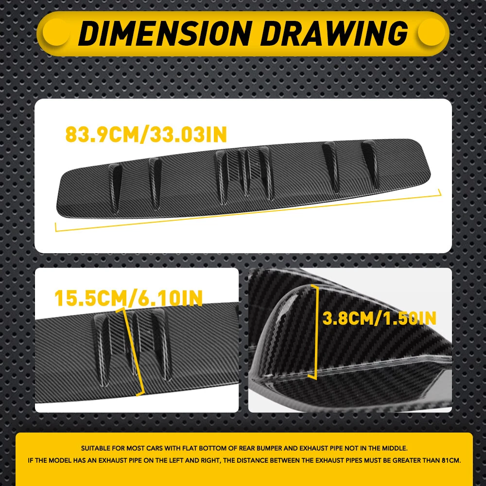 Fit for: Suitable for most cars with flat bottom of rear bumper and exhaust pipe not in the middle. If the model has an exhaust pipe on the left and right, the distance between the exhaust pipes must be greater than 84cm (33"). Specifications: Product Material: ABS Color: Carbon fiber (as pictures show) Placement on Vehicle: Lower, rear Features: 【Reduce Air Resistance】 This shark fin diffuser designed to increase a vehicle's aerodynamic performance and improve the stability of vehicle during fast driving. 【Excellent Appearance】 For Infiniti G37 Coupe Carbon Rear Diffuser fiber Bumper Lip Splitter Spoiler PU Fit for: Suitable for most cars with flat bottom of rear bumper and exhaust pipe not in the middle. If the model has an exhaust pipe on the left and right, the distance between the exhaust pipes must be greater than 84cm (33"). Specifications: Product Material: ABS Color: Carbon fiber (as pictures show) Placement on Vehicle: Lower, rear Features: 【Reduce Air Resistance】 This shark fin diffuser designed to increase a vehicle's aerodynamic performance and improve the stability of vehicle during fast driving. 【Excellent Appearance】 Shark fin and clean lines design with beautiful appearance to decorate your car, which gives your vehicle a more aggressive racing look. 【ABS Material】 Made of ABS material with high-quality, waterproof, durable functions and will not easy to break. 【Universal Fit】 Universal fit for most cars, please measure the size before purchasing. Note: Please confirm the size and make sure that there is enough space to install before purchasing!!! Professional installation is required. Packaging Include: 1 x Rear Shark Fin Bumper Diffuser 1 x Screws kit 1 x Double sided adhesive tape Item Specifics Brand AUXITO Type Spoiler Lip Placement on Vehicle Lower, rear Material ABS Color Carbon fiber Features Easy Installation Attachment Type Screw-On Universal Fitment Yes Items Included Screws Manufacturer Warranty 5 Years Performance Part No Vintage Car Part Yes Payment 1. We can only accept payment from PayPal. 2. Please keep the consistency of Paypal address and ebay address. Shipping 1. All items will be shipped in 12 hours after receiving your payment . 2. We ship this item to US only via USPS first class mail. It usually takes 3-5 working days to deliver. Returns 1. We offer 30 days return policy. 2. Please contact us within 30 days from the date you receive your package if you have any questions with the products . 3. Refund will be sent after we got your returned package. 4. All returned items should be in the original packaging with tracking number. Contact Us We work from Monday - Saturday 9:00AM - 6:00PM, but we will reply once we get your message. There will be delay on response if you send message or E-Mail on Sunday. DESCRIPTION PAYMENT SHIPPING RETURN POLICY CONTACT US Shop Category Store Home Other Hot Item Door Latch Cables LH+RH Front For 2007-2013 Chevy Silverado 1500 2500 HD 3500 HD USD 17.99 1set Control Knob Speed Fan Heater A/C For Jeep Wrangler TJ 99-06 5011218AA USD 9.99 Rear Left or Right Outside Door Handle for 2010-2016 Toyota 4Runner Lexus GX460 USD 14.99 For 2002-2008 Dodge Chrysler Stereo Car Radio Wiring Harness Adapter USD 11.59 Universal Car Windshield Wiper Squirter Washer Nozzle Spray Jet Kit Fluid Hose T USD 9.99 New List Item Exterior Door Handle For Hyundai 2011-2016 Elantra Primed Rear Right Side USD 12.99 LED 3RD Strobe Cargo Brake Light For 88-98 Chevy GMC C/K1500 Silverado 16522433 USD 34.99 2x Rear Bumper Reflector For Chevy Equinox 2010-2017 Tail Lamp Left Right Rear U USD 39.99 6M Body Side Molding For Roll Chevy Belt Exterior Protector / GMC SUV's Truck USD 39.99 Touch Screen Display for Cadillac 2018-2021 Escalade ATS CTS XTS CUE TouchSense USD 31.99 Excellent Delivery For Infiniti G37 Coupe Carbon Rear Diffuser fiber Bumper Lip Splitter Spoiler PU Fit for: Suitable for most cars with flat bottom of rear bumper and exhaust pipe not in the middle. If the model has an exhaust pipe on the left and right, the distance between the exhaust pipes must be greater than 84cm (33"). Specifications: Product Material: ABS Color: Carbon fiber (as pictures show) Placement on Vehicle: Lower, rear Features: 【Reduce Air Resistance】 This shark fin diffuser designed to increase a vehicle's aerodynamic performance and improve the stability of vehicle during fast driving. 【Excellent Appearance】 Shark fin and clean lines design with beautiful appearance to decorate your car, which gives your vehicle a more aggressive racing look. 【ABS Material】 Made of ABS material with high-quality, waterproof, durable functions and will not easy to break. 【Universal Fit】 Universal fit for most cars, please measure the size before purchasing. Note: Please confirm the size and make sure that there is enough space to install before purchasing!!! Professional installation is required. Packaging Include: 1 x Rear Shark Fin Bumper Diffuser 1 x Screws kit 1 x Double sided adhesive tape Payment Shipping Returns Contact Us 1. We can only accept payment from PayPal. 2. Please keep the consistency of Paypal address and ebay address. 1. All items will be shipped in 12 hours after receiving your payment . 2. We ship this item to US only via USPS first class mail. It usually takes 3-5 working days to deliver. 1. We offer 30 days return policy. 2. Please contact us within 30 days from the date you receive your package if you have any questions with the products . 3. Refund will be sent after we got your returned package. 4. All returned items should be in the original packaging with tracking number. We work from Monday - Saturday 9:00AM - 6:00PM, but we will reply once we get your message. There will be delay on response if you send message or E-Mail on Sunday. All rights reserved. On Dec 24, 2024 at 01:34:44 PST, seller added the following information: