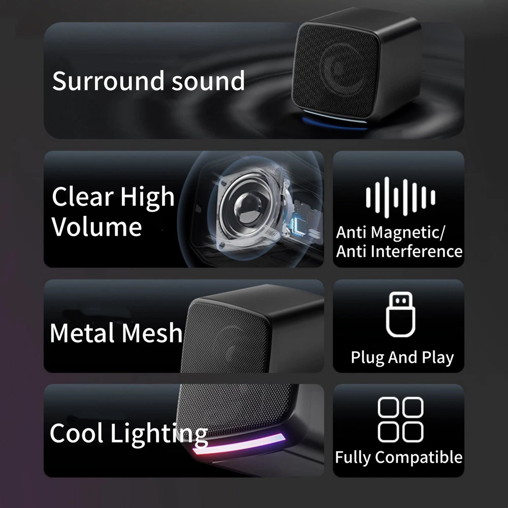 Product Description Features: 1. Loud Sound,Small Size: This Speakers For Computer Desktop,Providing Loud Sound,Crisp And Distortion-Free Hi-Fi Sound,Sound To Meet Your Audio Needs For Watching Movies, Listening To Music And Gaming. 2. Plug And Play: Equipped With A USB Cable And 3.5mm Audio Cable, The Computer Speakers For Laptop Is Usb Plug-And-Play Setup (No Drivers Needed). 3. Delicate Design: Unique Column-Shaped Desktop Computer Speakers, High Quality Plastics And Matte Metal Panel And Anti-Slip Foot Pads Design. Perfect For Any Modern Homes, Offices And Work Spaces. 4. Easy To Control: This USB Computer Speakers ,In-Line Volume Control For Easily Adjusting The Volum  Specifications: Rated Power: 2 X 3W Channel: 2.0 Frequency Response: 100hz-20khz Connector: 3.5mm Jack(Audio), USB(Power) Power Supply: DC 5V/1A Cable Length: About 31.5in/80cm(Plug→Wire Control), About 17.7in/45cm(Wire Control→Speaker)  Package includes: 2* Computer Speaker Cancel Policy Shipping Policy Return Policy Customer Service 1. Before ordering, please check description carefully to make sure it fits! 2. Before ordering, please make sure the address is correct. 3. T he packing and shipping process would be SUPER FAST, orders can't be cancelled or revised Once Packing Starts! 1. We dispatch items the same working day if payment has been received before 2pm. 2. We dispatch items via eBay fulfillment. Fast and 100% assured! 1. Always believe that we could solve the issue directly for you through communication . 2. Free Returns, postage covered by the seller. 3. If a return is the last solution, the product must be the same as you receive, also should be within 30 days after received. 1. Please contact us bofore leave reviews or start disputes, we would solve the issue for you asap. 2. We would reply within 24 hours on working days, and within 48 hours on weekends/holidays. Cancel Policy 1. Before ordering, please check description carefully to make sure it fits! 2. Before ordering, please make sure the address is correct. 3. T he packing and shipping process would be SUPER FAST, orders can't be cancelled or revised Once Packing Starts! Shipping Policy 1. We dispatch items the same working day if payment has been received before 2pm. 2. We dispatch items via eBay fulfillment. Fast and 100% assured! Return Policy 1. Always believe that we could solve the issue directly for you through communication . 2. Free Returns, postage covered by the seller. 3. If a return is the last solution, the product must be the same as you receive, also should be within 30 days after received. Customer Service 1. Please contact us bofore leave reviews or start disputes, we would solve the issue for you asap. 2. We would reply within 24 hours on working days, and within 48 hours on weekends/holidays. powered by