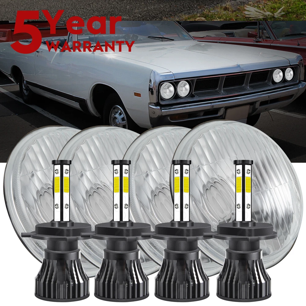 5-3/4"5.75 Round Stock Style H4 Conversion Headlights with Super Bright White LED Light Bulbs. Keep the Classic Look with Modern Light Brightness! Plug And Play! This listing is for a new set of 5 3/4" stock style glass lens - metal back headlight bulbs. This set includes (4) low/high beam headlights with high intensity LED light bulbs (no wiring or bucket modification needed). These have the original shaped prongs on the back so they will plug right into your original wiring harness plugs. These will fit any car or truck that has 4 round glass headlights. Will fit into stock buckets. Each bulb is 5 3/4 inches in diameter. These are glass and we will take extra care in packaging. Product Features: Dimension: 5.75 inch Housing Color:Black LED Type: White Material: Aluminum Housing, PMMA Lens Voltage: 10V-30V DC Color Temperature: 6000K Working Temperature: -40°C- 85°C Waterproof Protection: IP67 Interchange: H5009 / H5006 / H5506 / H5001 / 4001 Specification: 100% Brand New in the box with manufacturer packaging, never been installed before. LED LIGHT BULB Specifications and Features: Product Name: LED Headlight Bulbs Luminous flux: 10000LM Working voltage: DC9-32V IP rate: IP67 Wattage:55W Connector: H4 / 9003 (Low Beam and High Beam) Life Span: Above 50,000 Hours Color temperature: pure white 6000K Materia:Aviation aluminum profile Package Included: 4pcs 5.75" 5-3/4" headlight Housing 4pcs H4/9003 High & Low Beam LED Bulbs Note: 1. Please check the size of your bulbs on your vehicle before purchasing. 2. Please make sure the headlight housing has enough space for installation before purchasing.