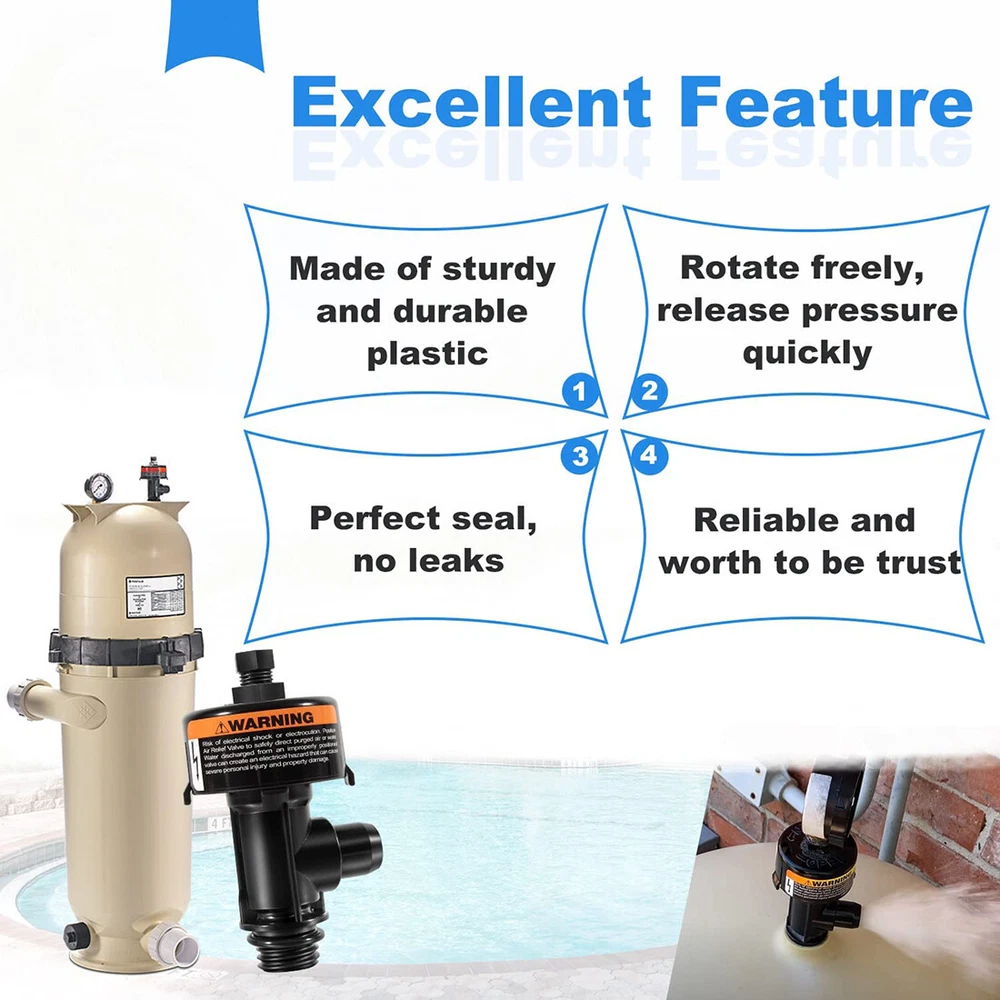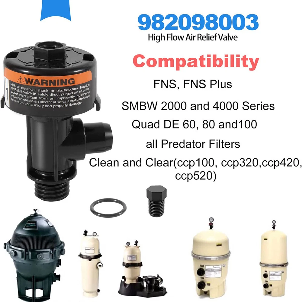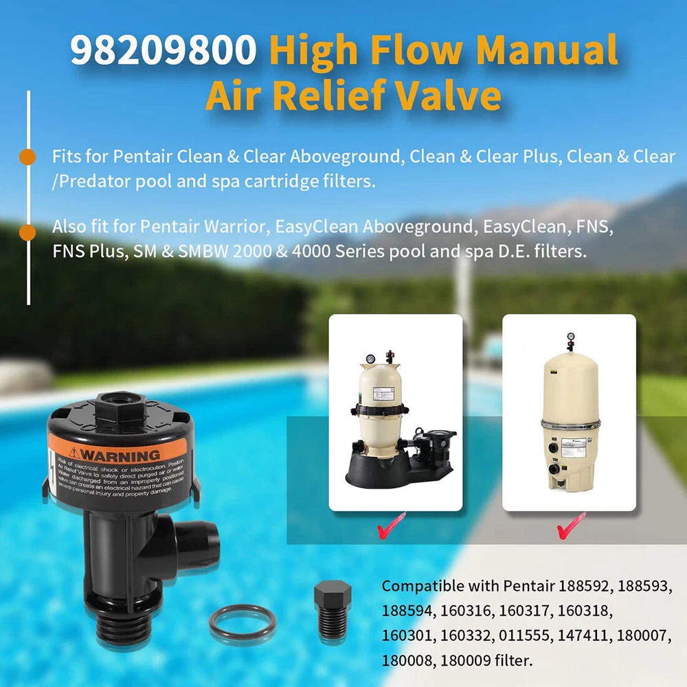 Fitment: Fits for Pentair Clean & Clear Aboveground, Clean & Clear Plus, Clean & Clear/Predator pool and spa cartridge filters. Also fit for Pentair Warrior, EasyClean Aboveground, EasyClean, FNS, FNS Plus, SM & SMBW 2000 & 4000 Series pool and spa D.E. filters Features: 1) This air relief valve is compatible with Pentair 188592, 188593, 188594, 160316, 160317, 160318, 160301, 160332, 011555, 147411, 180007, 180008, 180009 filter 2) Designed to help release air from the filter. Easy to replace and use. Remove the broken one directly, then screw the new air relief valve assembly into the original place. When in use, turn the air vent valve directly to expel the air. If water is ejected, turn the valve back to its original position 3) Made of high quality plastic and rubber, professional manufacture. Features with durable, sturdy, good wear and corrosion resistance, no deformation, no leak 4) This high flow manual relief valve is very easy to install and screw to the filter. No needs for any actual tools. Simply screw the gauge plug and put the rubber O-ring onto the threaded section of the tail end and insert the 98209803 right in the place of the filter 5) 98209800 High Flow Manual Relief Valve is compatible with Pentair Warrior, EasyClean Aboveground, EasyClean, FNS, FNS Plus, SMBW 2000 Series and 4000 Series and spa D. E. filters. Also fits for Pentair Clean and Clear (ccp100, ccp320, ccp420, ccp520), Quad DE 60, 80 and 100 and all Predator Filters for use with Package included: High Flow Manual Relief Valve Replacement Kit