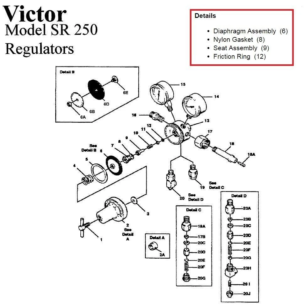 For Victor SR250D SR250C Oxygen Regulator Rebuild/Repair Parts Kit Condition: New Manufacturer Part Number: 0790-0048 Brand: Aftermarket Part Type: Repair Kit Product Description: Diaphragm Assembly (6) Nylon Gasket (8) Seat Assembly (9) Friction Ring (12) Parts included in the kit are the Diaphragm #0730-0024, Seat Assemble #0740-0010, Friction Washer #1408-0033, and Nozzle Gasket #1408-0086. Replace Victor Part #0790-0048 Payment Delivery details Terms of sales About us Contact us Payment Paypal Preferred. Delivery details · USPS Standard Shipping. · Order processing: within 1 business day upon payment(excluding holidays and weekends). · Shipped from: US Warehouse Terms of sales · Please read the item description and check the pictures carefully before ordering. · Return or refund is available only if item DOA or there's error in item description causing the item not fitting the need. In such cases, seller pays for all related shipping cost. · Returns are also acceptable if buyer purchased this by mistake and item is still in good condition for reselling. Buyer is responsible for all related shipping cost. · Buyer need to file an application for return within 60 days after receiving the item. Items returned must be still in good condition as they were received. Return notes: 1.Please contact us for return and we will proceed with following instructions. 2.Returning the package with a tracking method, like USPS. The RMA#(Return Merchant Authorization Number=Your ebay ID) must be clearly written on the return package, otherwise the package will be refused. 3.Email us the return tracking number. 4.All returns will be inspected prior to a credit being issued. About us We are specialized in auto parts accessories for many years and we also sell items on ebay for several years. If you have questions about our items and services, please kindly feel free to contact us, we will try our best to satisfy you within 24 business hours. Contact us Please be free to email us by clicking the "Asking a question" link, once there is any pre-sale or after-sale inquiry for our items. We will email back in 24 working hours. If you'd like to put a neutral or negative feedback, or open the ebay or paypal case, please email us so we could try our best to resolve the issue.