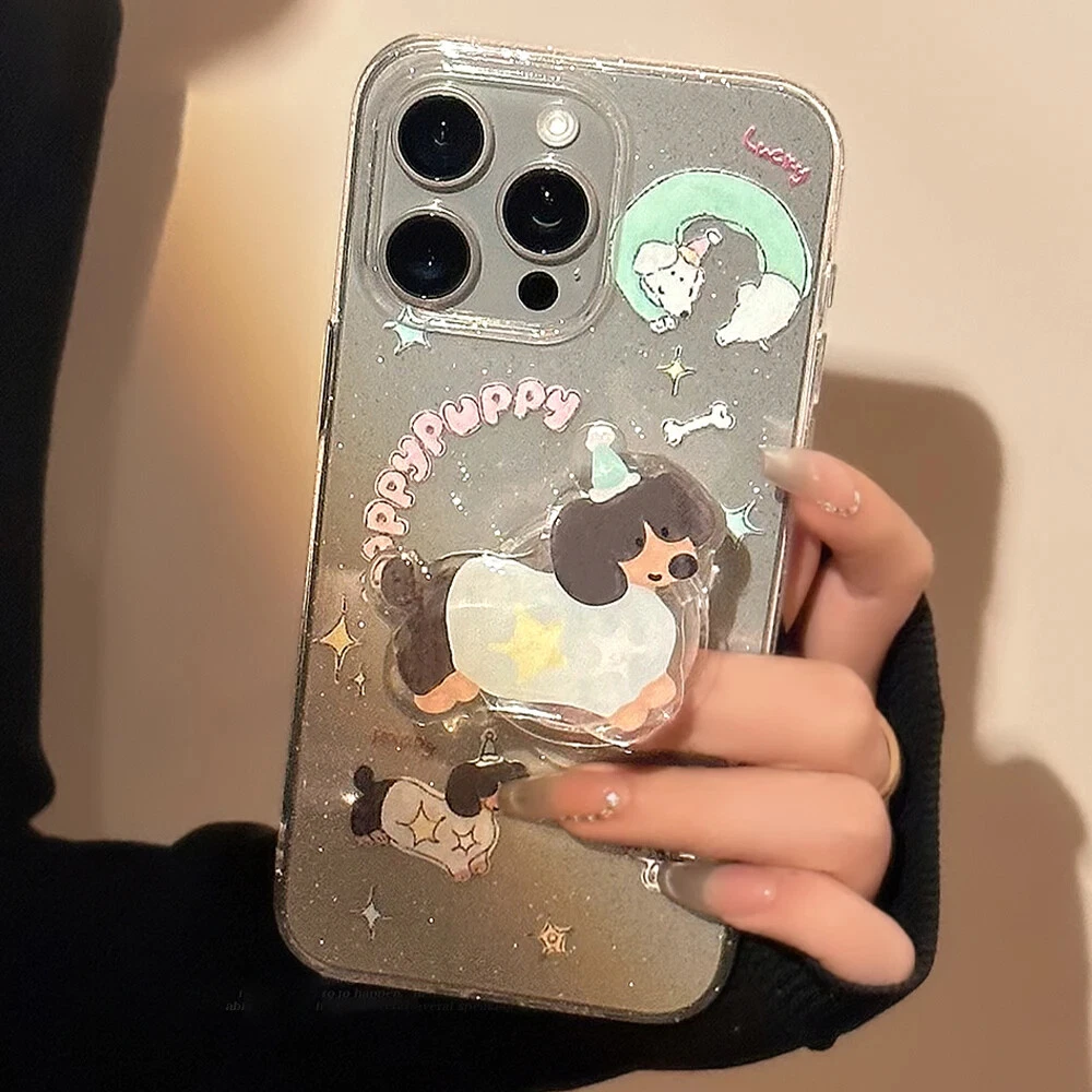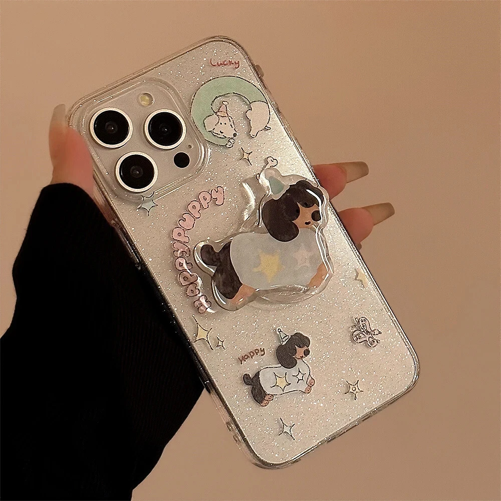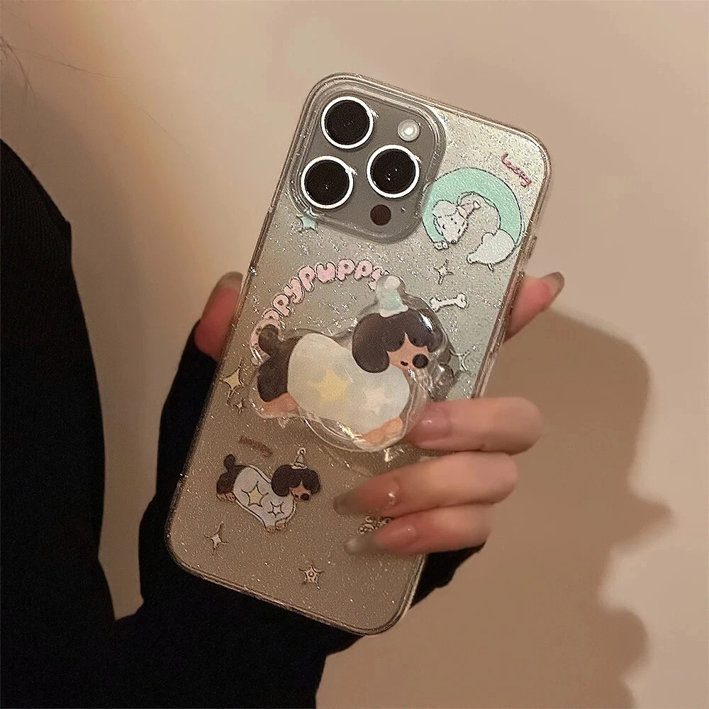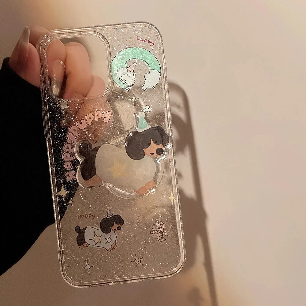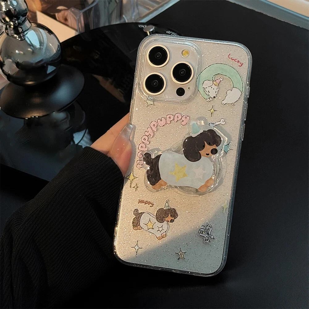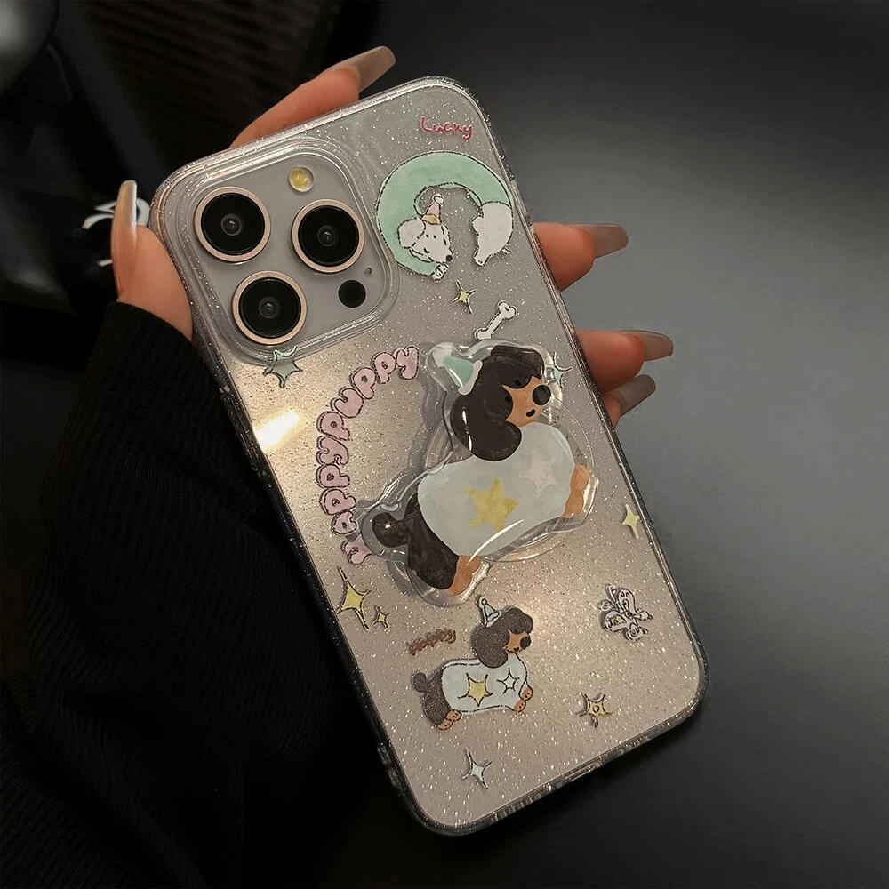 For iPhone 15 14 13 12 11 Pro Max Plus Puppy Stand Holder Clear Phone Case