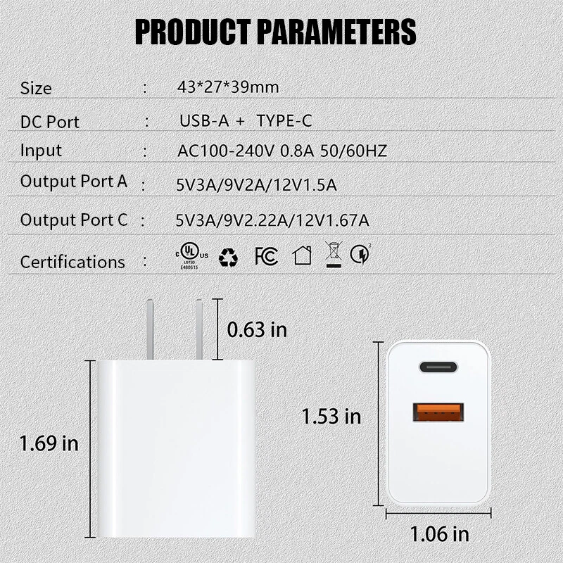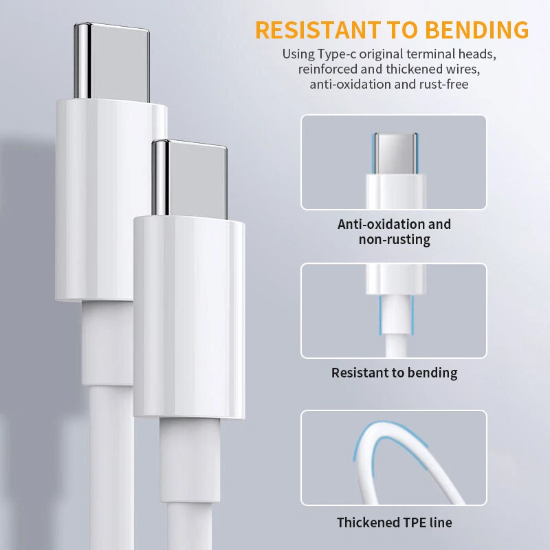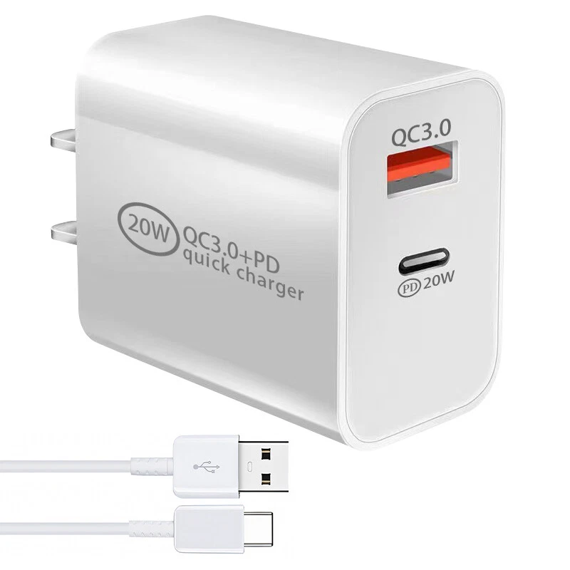 Features for Wall Charger: Made of high quality ABS material,ensuring durability and a smooth finish. Standard AC charger (US plug) Wide Compatibility: Ideal for almost all Phones, Electric Appliance, MP3 players, smartphones, e-book readers, Bluetooth speaker, more Auto adjustable 100-240V input fits world travelers in most countries High-Speed Charging: The USB-C port supports a maximum power output of 20W. Dual Port Fast Charging:Charging faster and safer than 1A adapter (Charge your iPhone 15 up to 50% capacity in just 30 minutes with the original cable. ) Auto stop charging after full charged, save energy and keep it safe Portable design, convenient to carry Light Weight: 40g (1.1oz) Features of Charger Cable: Ultra fast data transfer Supports quick charging Type-C reversible connector simplifies the connection. Plug and unplug easily without checking the orientation. Interface type: USB Type-C Charging Rate: 2.4A Data Transmission Rate: Up to 480Mbps Material:PVC Durability: Flexibility Testing: Over 10,000 bends Connection Durability: 5,000 insertions Cable Length: 1/2/3m (3/6/10 ft) Convenience: weighs only 30g Compatible with: For iPhone 15/15 Plus/15 Pro/15 Pro Max(Type-c to Type-c Cable) For iPhone 14/14 Plus/14 Pro/14 Pro Max For iPhone 13 Pro Max/13 Pro/13/13 Mini For iPhone 12 Pro Max/12 Pro/12/12 Mini For iPhone 11/11 Pro/11 Pro Max For iPhone X/XS/XR/XS MAX For iPhone SE 2020 For iPad Pro 12.9" 2018/2020 For iPad Pro 11" 2018/2020 For iPad Air3 10.5" For iPad Mini5 7.9" For iPad For Samsung Galaxy S20/S20+/S20 Ultra For Samsung Galaxy S21/S21+/S21 Ultra For Samsung Galaxy S22/S22+/S22 Ultra For Samsung Galaxy S23/S23+/S23 Ultra For Samsung Galaxy Note 20/20 Ultra For Samsung Galaxy Note 10/10+ /9/9+/8/8+... For Motorala Series Phone For LG Series Phone For Other Phone Packages include: Depend on the quantity option you choose