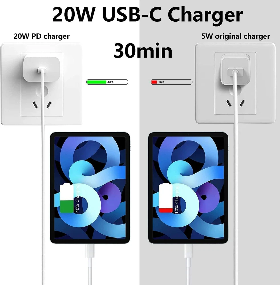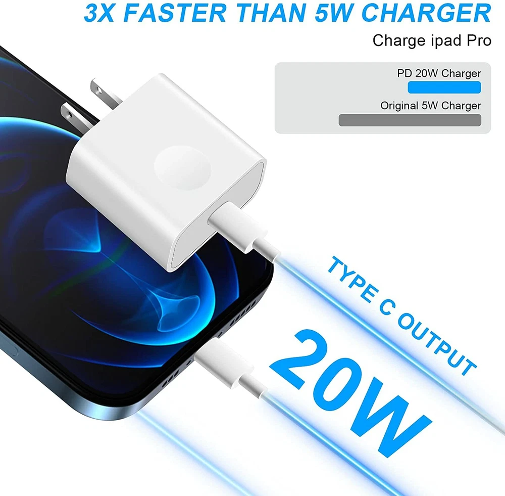 eBay Set: Input: AC 100~240, 50/60Hz Output: 5V/3A, 9V/2A-2.22A, 12V/1.5A-1.67A, 3.3-5.9V/3A, 3.3-11V/1.63A-1.8A Maximum Power: 20 watt Product color: white 20W USB C Power Adapter: Specification: Type: 20W PD Fast Charger, Wall Charger ,USB C Power Adapter,C ar Charger,Charger Adapter,Wall Charger Features: Fast Charge, Lightweight, / Color: White USB C TO USB C CABLE: Type: USB-C Cable /Charging & Data Sync Cable / Type-C/USB Cable/USB-C to USB Cable/Type c to Type c Cable/60w fast charger/PD Cable Cable Length:1m/3ft 2m/6ft Features:Fast Charge/Heavy Duty/Light weight/Portable/Travel/60w fast charger Color:White Reversible Connectors Special reversible USB C to USB C design, no need to distinguish reverse, simple and comfortable. Note: USB-A charger is not supported Only applicable to PD fast charge Fast Charge & Sync:USB C to USB C Fast Charging cable offers charging speed up to 60W NOTE: The actual charging speed depends on your device and wall charger. Simple & durable 13,000 swing life, the upgraded thick line can perfectly beat other products Thicker copper wire can increase the service life by 40% Comp atibility: For Apple iPad Pro 2021/ For Apple iPad Pro 2020/ For Apple iPad Pro 2018 For Apple iPad Pro 12.9 in 5 Generation/ For Apple iPad Pro 12.9 in 4 Generation / For Apple iPad Pro 12.9 in 3 Generation For Apple iPad Pro 11 in 3 Generation/ For Apple iPad Pro 11 in 2 Generation / For Apple iPad Pro 11 in 1 Generation For Apple 2020 New iPad Air 4th For Apple 2021 iPad Mini 6 For Apple iPhone 15 For Apple iPhone 15 Plus For Apple iPhone 15 Pro For Apple iPhone 15 Pro Max Wide Compatibility: For Samsung Galaxy S23/S22/S20/S21/S21+/S21 Ultra/Z Fold 3/Z Flip 3 For Google Pixel 4/ 4XL/ 3/ 3XL/ 2/ 2XL For LG, Motorola and any USB C & type C port phone
