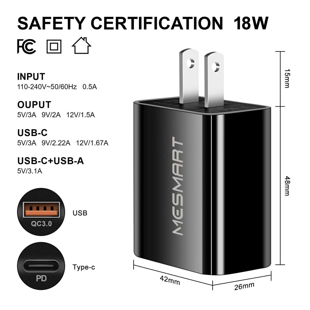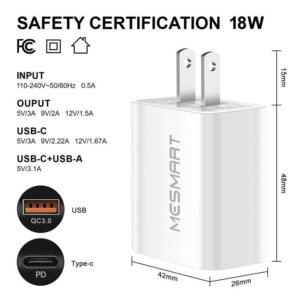 Product Description Features for Wall Charger: Brand: MESMART Made of high quality ABS material Standard USB-A+USB-C charger (US plug) Input: 110-240V 50/60Hz 0.5A Auto adjustable 110-240V input fits world travelers in most countries Output: USB-A(QC3.0):5V-3A/9V-2A/12V-1.5A USB-C:(PD)5V-3A/9V-2.22A/12V-1.67A USB-A+USB-C(QC3.0+PD):5V-3A Compatible with a Type C or AC charging cable (Not include in package) to charge the device you need Charging faster and safer than 2A adapter Certificated by FCC CE RoHs, ensure the safety for daily use Auto stop charging after full charged, save energy and keep it safe Portable design, convenient to carry Light Weight: 50g (1.75oz) Size: 48*46*28mm (1.89"*1.81"* 1.1") Package Content: Depend on the quantity option you choose About Us MESMART , aims to offer great items for every buyers and give every buyer the best service online. Choose supplier carefully and ensure the item quality. Do not hesitate to buy from ecosumall. You will get the best item with good price and enjoy the best service. Welcome to buy from us! Payment 1. Paypal is the payment method that we only support 2. You can check out and pay immediately after the auction ends or you complete the purchase. If you need an eBay invoice by email, please contact us before making payment. Thank you! 3. We start to process and fulfill your order once payment is received. If you add new orders after check out, please message us to confirm whether we can combine shipment for you. Or we will send the packages separately. 4. Payment are expected within 4 days after the order is confirmed. Shipping 1. We ship to the USA only. 2. How much is the shipping & handling? Our shipping and handling charges are stated clearly in the Shipping and Payments section of the item page. We always provide free shipping for most listings. 3. The combine shipping discount will be automatically calculated when you check out and pay all of your purchases together.If the Items checked out separately, please contact us to combine shipment for you but we will not offer the combine shipping discount. 4. Please make sure the correct Ship-To address is entered before checking out. Once the payment is completed, you may not be able to change the shipping address. We shall not be held responsible for any wrong or undeliverable addresses. 5. We usually ship within 1-2 business days after receiving cleared payment. 6. Our Shipping Service: We usually ship via USPS from our US warehouse, normally it will take 3-5 business days to be delivered. 7. If you have any concern about the shipping service or the item, please feel free to contact us via eBay Message, we will do our best to help you. Welcome to buy! 8. You, as the buyer, are responsible for the import duty and/or VAT for items bought from abroad. We have no idea about your local import duty or VAT or any import regulations or restrictions at the destination countries, and we shall not be held responsible for providing this information to buyers. If you have any questions in these respects, we strongly suggest that you check with your local authorities for details before purchases. MESMART, aims to offer great items for every buyers and give every buyer the best service online. Choose supplier carefully and ensure the item quality. Do not hesitate to buy from ecosumall. You will get the best item with good price and enjoy the best service. Welcome to buy from us! Terms 1. We put buyer's satisfaction at top priority. If you're not pleased with your purchases, we'll be happy to offer an exchange or refund the item total price within 30 days of your purchases. 2. For any Exchange, Refund or Return, the item must be in its original condition, including the box, packaging, and all the accessories or gifts. 3. We'll provide prepaid return shipping label if the return is a result of our fault. Postage reimbursement is offered only on standard mails, and it needs to be approved by our stuff prior to returning. 4. Please allow up to 7 business days for returns to be processed. 5. Shipping and Handling charges are not refundable. Returns 1. 30-Days Return is acceptable 2. We will pay for the return postage if the problem is our result Contact Us 1. Customer satisfaction is very important to us and our feedback rating reflects this satisfaction. If you have any question or concern, please contact us via eBay message first before leaving feedback, we will do our best to help you solve the problem. 2. We respond to all eBay messages as quickly as possible. Please allow us up to one business day before you start thinking your message is neglected or the reply is avoided, because there would be time difference, non-working hours or public holidays that have prevented us from making an instant response. Our service center located in China, working time from 8:30am. to 5:30pm. BJT (Monday to Friday) Attention There are various product combinations in the link, and each purchase option has a corresponding product picture. Please confirm the product before payment to ensure no mistake, and wish you a happy life. powered by