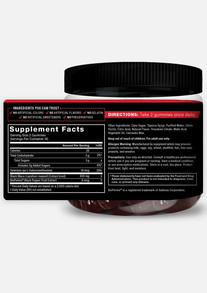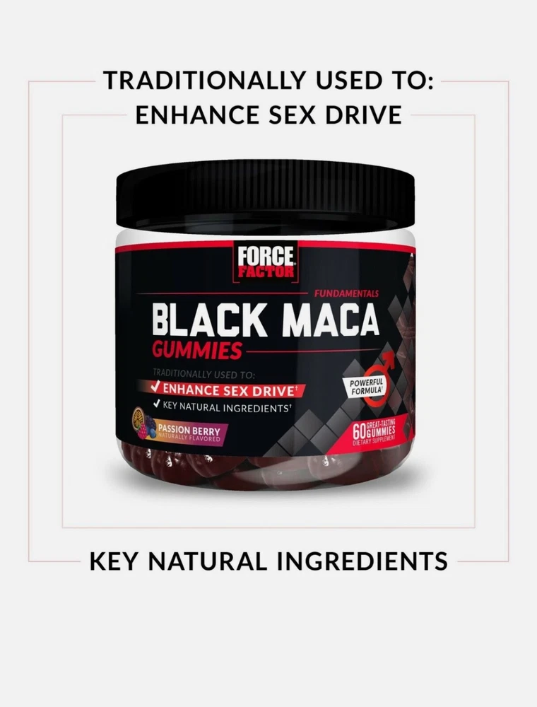 Gummies Black Maca Root For Vitality In Men Women Natural Energy Booster ANCIENT INCAN SECRET: Black maca, or maca negra, is endemic to Central Peru. Incan warriors are said to have consumed the root of this plant (Lepidium meyenii) to increase energy and strength, and today it is most often used to enhance vitality. POWERFUL DAILY DOSE: This formula contains 400mg of black maca root extract, along with BioPerine and selenium. AMAZING TASTE: Most black maca supplements are capsules, tablets, or powders. These gummies are not only easy to consume, but they are a delicious addition to your daily vitamin regimen, helping you avoid pill fatigue. FUNDAMENTAL STACKING: All of the Force Factor Fundamentals formulas were designed to stack together, as well as with any other supplement in our full line of premium performance nutrition products. MADE IN USA: Force Factor vitamins and supplements are expertly formulated with premium, globally sourced ingredients that are carefully tested for quality and potency. They are produced in GMP-certified facilities right here in the USA. Unit Count 60 Count Style Gummies Number of Items 1 Product Benefits Energy Management Special Ingredients Black Maca Age Range (Description) Adult Diet Type Vegetarian Package Information Tub Flavor Passion Berry Item Form Gummy Size 60 Count (Pack of 1)
