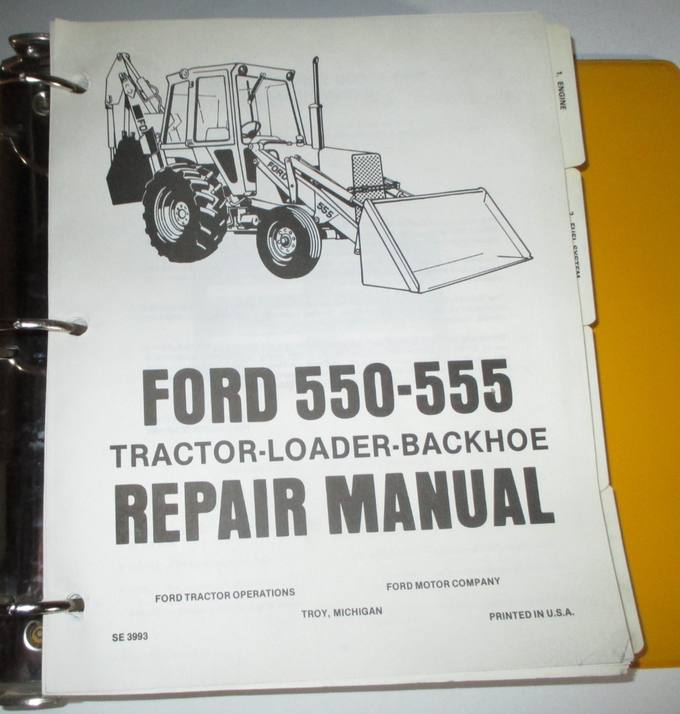Original! Ford Dealers Service / Repair Manual for the Model 550 and 555 Tractor Loader Backhoe. It would be hard to find a nicer original than this one! It's in very good used condition. Dated/Issued/Copyright: UNDATED Manual number SE-3993 It has around 750? pages. Inventory no. NH-8387 This manual has detailed repair information with lots of pictures/drawings. The same genuine manual your dealer used to repair these machines. **(see pictures)** **NOTE: MEDIA SHIPPING SOMETIMES MAY TAKE UP TO TWO WEEKS. IF YOU NEED IT FASTER THAN THAT OTHER SHIPPING OPTIONS ARE AVAILABLE UNDER THE "SHIPPING and PAYMENTS" TAB.** WE SHIP WORLD WIDE! Any package shipped to a location outside the USA, will pay higher shipping . International Buyers – Please Note : Import duties, taxes, and charges are not included in the item price or shipping cost. These charges are the buyer's responsibility. Please check with your country's customs office to determine what these additional costs will be prior to bidding or buying. If you are interested in Tractors & Farm or Construction Equipment, please check out my store & other auctions! THANKS FOR LOOKING!