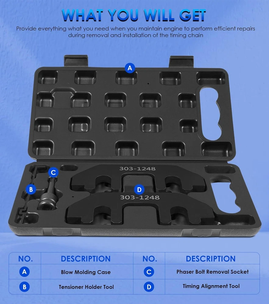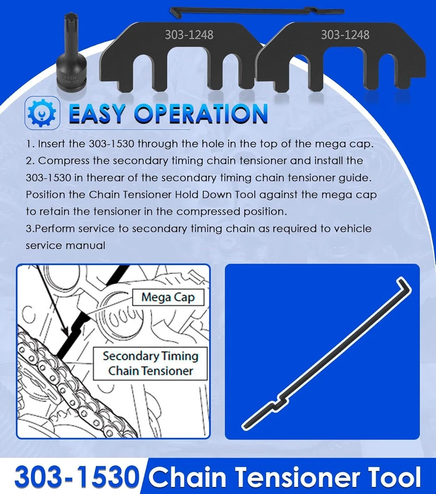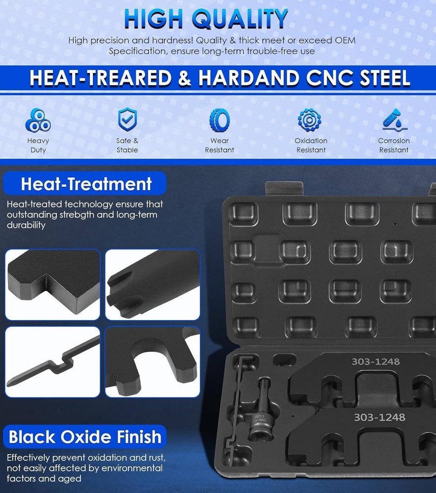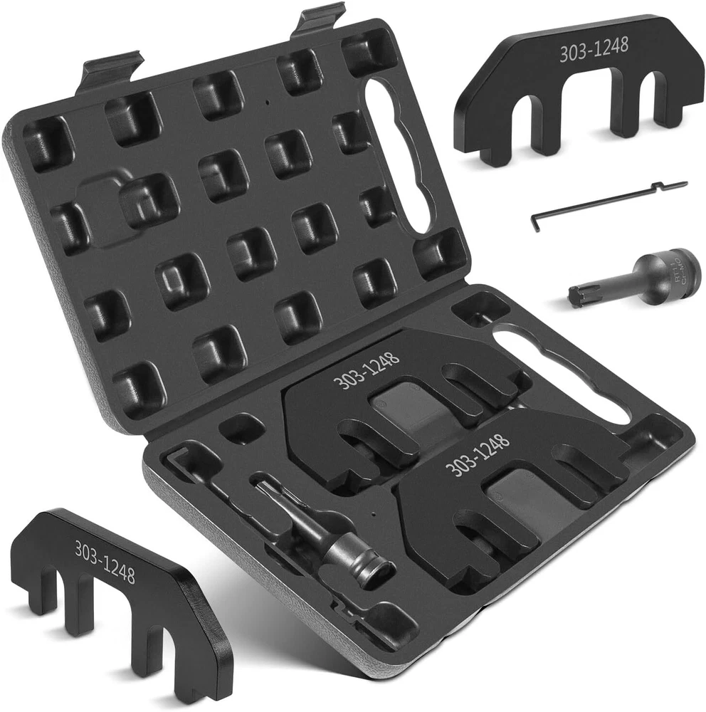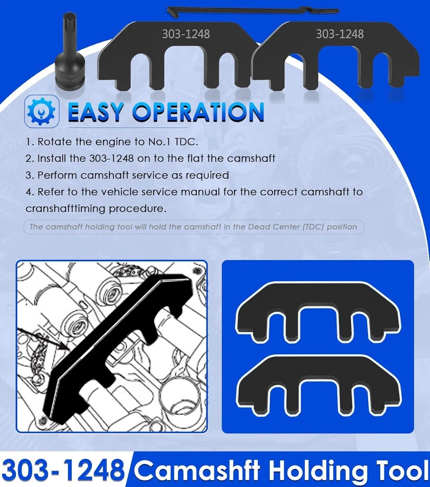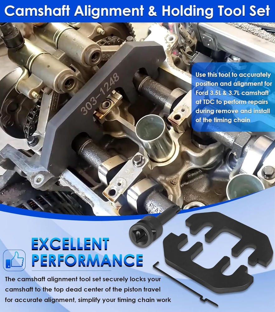 Camshaft Holding Tool Kit for Ford Timing Alignment Holder Tool Replace 303-1530 【WIDE COMPATIBILITY】: Compatible with Ford V6 3.5L & 3.7L Cyclone Engines. This timing alignment holder tool perfectly fit for Ford Edge Explorer F-150 Flex Fusion Fusion Hybrid Mustang Taurus Lincoln MKS MKT MKX MKZ Navigator Mercury Milan Sable Taurus Taurus X. Replace 303-1248 303-1530 . Please kindly confirm more compatibility details on the below descriptions before purchase. 【EXCELLENT FUNCTION】: The camshaft alignment tool securely locks your camshaft to the top dead center of the piston travel for accurate alignment and position. The chain tension tool through the hole in the top of the mega gap to retain the tensioner in the compressed position. And the phaser bolt removal socket removes fast and easily the damaged phaser bolt from the engine cam. 【HIGH PERFORMANCE】: The camshaft holding tool kit can help vehicle maintenance, allowing you use it to accurately position and alignment for Ford 3.5L and 3.7L camshafts at the TDC to convenient you to the timing chain and belt replacement, phaser bolt change, water pump maintenance and etc. Easy to use, simplify your timing chain work. This kit includes 2 x Camshaft Holding Tool, 1 x Chain Tensioner Holder Tool, 1 x Phaser Bolt Removal Socket. 【SUPERIOR MATERIAL】: The engine timing alignment holder set constructed from heavy duty and heat-treatment carbon steel with outstanding solid and great durability. Surface coated with black oxide finish, effectively prevent oxidation and rust. Accurate calculation and precision cutted make sure a perfect fit. High precision and hardness ensure that a reliable long-term service. 【SATISFACTION GUARANTEE】: We aim to give our customers the best products and services. If you have questions about this Camshaft Holding Tool Kit, please contact us without hesitate. A must have tool! Our camshaft holding tool kit saves your time, frustration and possible injury when trying to perform repairs during removal and installation of the timing chain. Compatible With All Ford V6 3.5L, 3.7L & 4L Engines High Precision And Hardness, Meet Or Exceed OEM Specification Details of 303-1248 Camshaft Holding Tool Set 1.All Payments must be Confirmed (Shipping and billing addresses must match) Payment is required within 7 days from the date of the auction ending. 2.We accept PayPal, MasterCard, Visa, American Express, Discover and etc payment. 1.Orders will be ship out within 1 business days via USPS, Or UPS . (Orders from Saturdays, Sundays or holidays will process on next business day and will be ship within 24 hours. ) 2.All of the items are shipped from our Warehouse in USA.It will take about 3 to 5 business days to you. 3.Any defective items received can be replaced or refunded. Please contact us with the item number, eBay ID and defect description. 1.100% Satisfaction Guarantee: If you're not 100% satisfied with our items, simply return it for a full refund in 60 days (Items must be in new condition and in original package). Kindly please feel free to contact us before return. 2.Return or Replacements: Support 12 months' Warranty. All product will be tested in 100% before delivery. If the item is was damaged in transit, kindly please contact us for a replacement or refund (Excluding contrived damage or misuse). Any question, please don’t hesitate to let us know. We try our best to reply to your emails as soon as possible, due to high volume of daily incoming emails, we may not be able to reply your emails immediately. Please allow 24 hours for us to response. your understanding and patience is much appreciated!