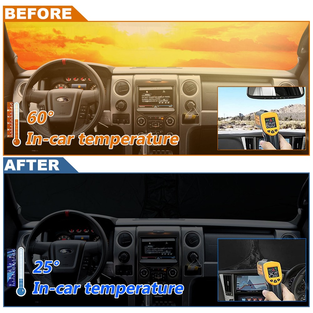 Car Sun Shade Visor Foldable Front Window Windshield Cover For Ford F-150 21-24 Fitment For Ford F-150 21-24 Features Custom Fit : Windshield Shade Cover custom fit for Ford F150 2021-2024, Full covered your windshield, No Gap, Perfect fit. Double Thickness Material : Made of 210T Reflective Polyester, Sun Blocker is consist of both double reflective layers and double thermal insulating layers which can make shading and insulation more effective,Keeps your vehicle cool and protects against damage caused by hot sunlight. Air Condition Works Faster & Easier : Using less energy and gas instead of having to wait 15 minutes for your AC to cool off your car, the AC cools faster & easier. Saves your money while making your drive much more comfortable and enjoyable. Great Protection : With windscreen sun shade,it can protect car interior from harmful UV rays and heat that will fade dash and seats.Also when you travel by car or need a nap,our Custom fit Windshield Shades can block 99% sun shine and UV rays,give you and your family more protection. Easy to install & store : The foldable built-in elastic ring design allows you to prop the sunshade up in seconds with ease and fold-away storage making it convenient for daily use. Without falling off.Easy to twist, fold and store in the storage pouch. Specifications Product Name: Car sunshade Suitable for: Front Rear Windshield Material: Reflective Silver-Coated Nylon with foldable metal frame Color: Black + Silver Tone Net Weight: 180g Package Included 1 X Car Front Windshield Sunshade 1 X Sunshade Storage bag Payment We can accept payment of Paypal only. Payment should be made within 7 days after purchasing. (No payment orders eBay system will automatically open unpaid dispute, and this is not good to your account.) Shipping Item will be shipped out within 48 hours upon receipt of your cleared payment. We can not ship on Sundays and other public holidays. International Buyers Please Note: 1, Import duties, taxes and charges are not included in the item price or shipping charges. These charges are the buyer's responsibility. 2, Please check with your countrys customs office to determine what these additional costs will be prior to bidding/buying. Please make sure your address in paypal is correct. we will only follow your address listed in the Paypal payment for the shipment. Combine shipment is not allowed. If you want to combine all the items together, you should still pay for all of the shipping, insurance and handling fee! Returns We offer you 30 days return. The buyer is responsible for return shipping including a result of customer error or wrong item bought: 1) If you received an incorrect, damaged, defective, or item not as described, contact us for a partial/full refund or replacement on our cost. 2) If you want to return the item, please contact us within 60 days after package received. Return products must also be in its original condition: including box, packaging and all other accessories. Feedback 1.We are appreciated your business and to improve our customer service and our commitment to quality. 2.We will leave a positive feedback immediately after payment is received. We appreciate a positive feedback as much as you do. 3.If for some reason there is any issue with the purchase, please contact us prior to leaving feedback, and we will be glad to work with you to have it resolved. Contact Us We do appreciate your purchase from our store. If you are satisfied with the item as well as our service, please kindly leave us a Positive Feedback to help develop our business. Thank you in advance. Our office hours are MONDAY - FRIDAY 9:00PM - 18:00PM PST , we do not answer any E-mails or eBay messages on weekend. All E-mail or eBay message take us around 24 hours to respond. Thanks a lot. Car Sun Shade Visor Foldable Front Window Windshield Cover For Ford F-150 21-24 Fitment For Ford F-150 21-24 Features Custom Fit : Windshield Shade Cover custom fit for Ford F150 2021-2024, Full covered your windshield, No Gap, Perfect fit. Double Thickness Material : Made of 210T Reflective Polyester, Sun Blocker is consist of both double reflective layers and double thermal insulating layers which can make shading and insulation more effective,Keeps your vehicle cool and protects against damage caused by hot sunlight. Air Condition Works Faster & Easier : Using less energy and gas instead of having to wait 15 minutes for your AC to cool off your car, the AC cools faster & easier. Saves your money while making your drive much more comfortable and enjoyable. Great Protection : With windscreen sun shade,it can protect car interior from harmful UV rays and heat that will fade dash and seats.Also when you travel by car or need a nap,our Custom fit Windshield Shades can block 99% sun shine and UV rays,give you and your family more protection. Easy to install & store : The foldable built-in elastic ring design allows you to prop the sunshade up in seconds with ease and fold-away storage making it convenient for daily use. Without falling off.Easy to twist, fold and store in the storage pouch. Specifications Product Name: Car sunshade Suitable for: Front Rear Windshield Material: Reflective Silver-Coated Nylon with foldable metal frame Color: Black + Silver Tone Net Weight: 180g Package Included 1 X Car Front Windshield Sunshade 1 X Sunshade Storage bag On Feb 2, 2025 at 04:38:20 PST, seller added the following information: