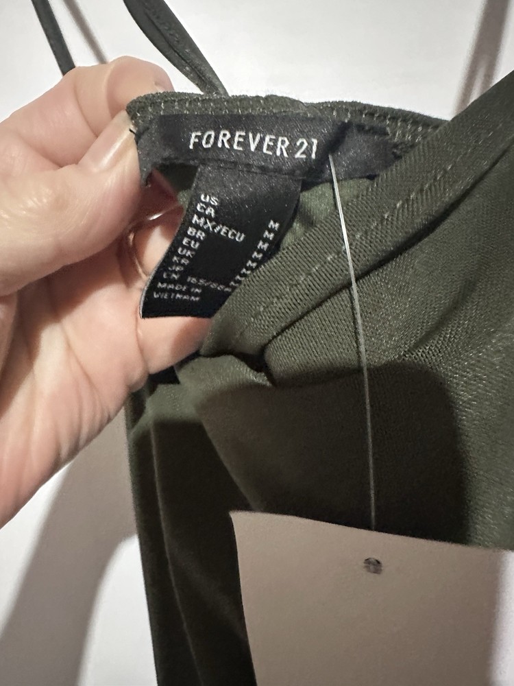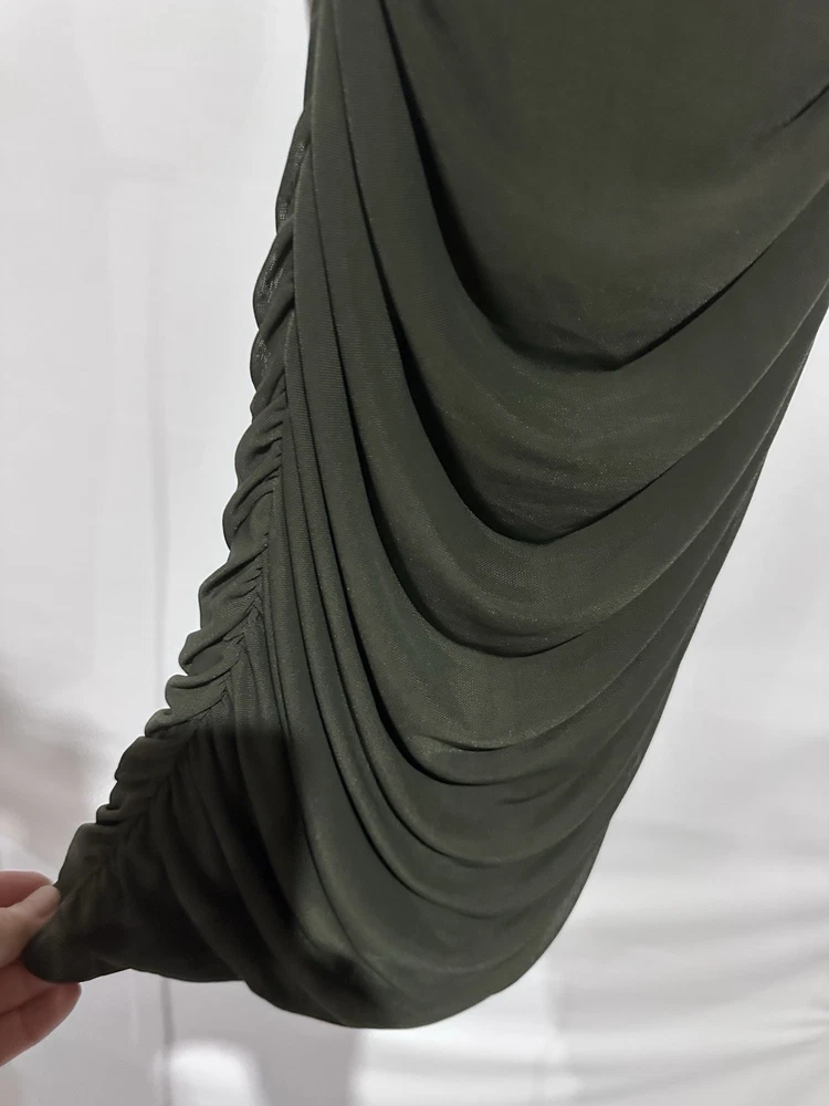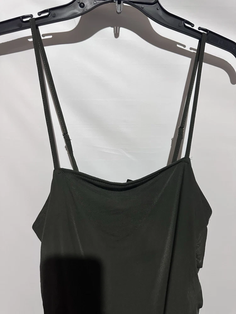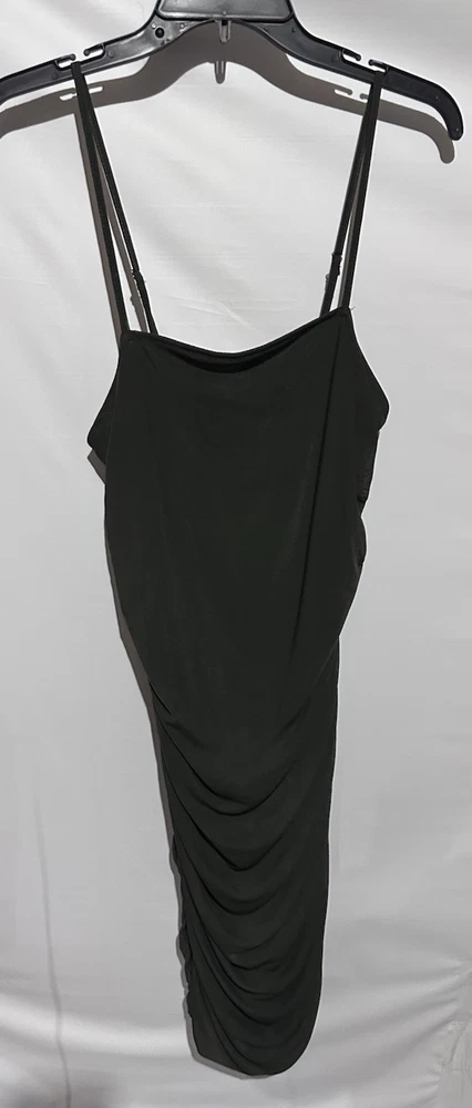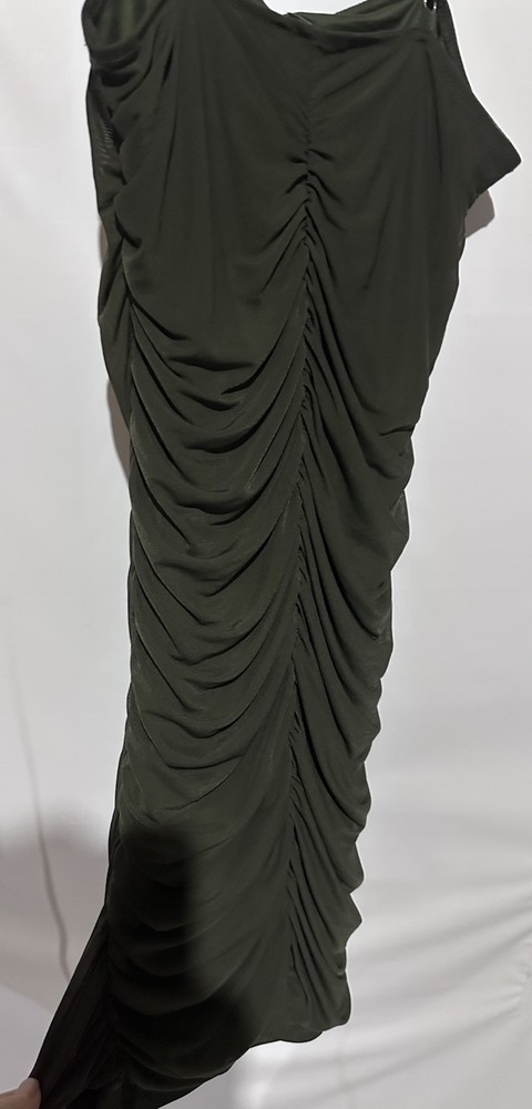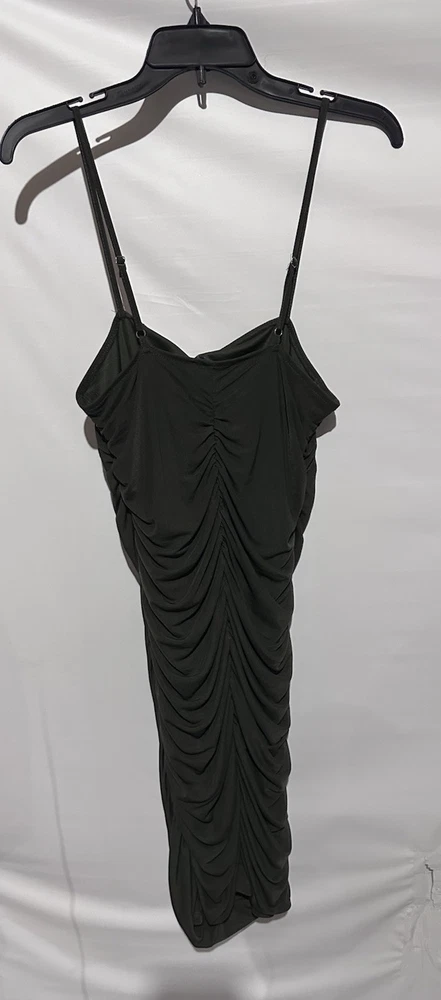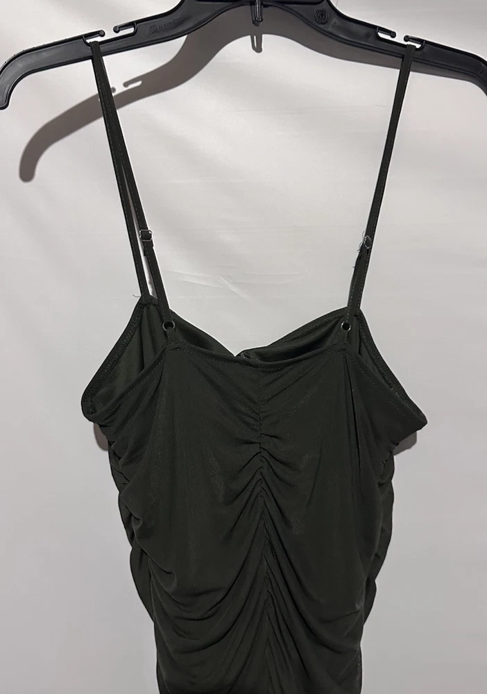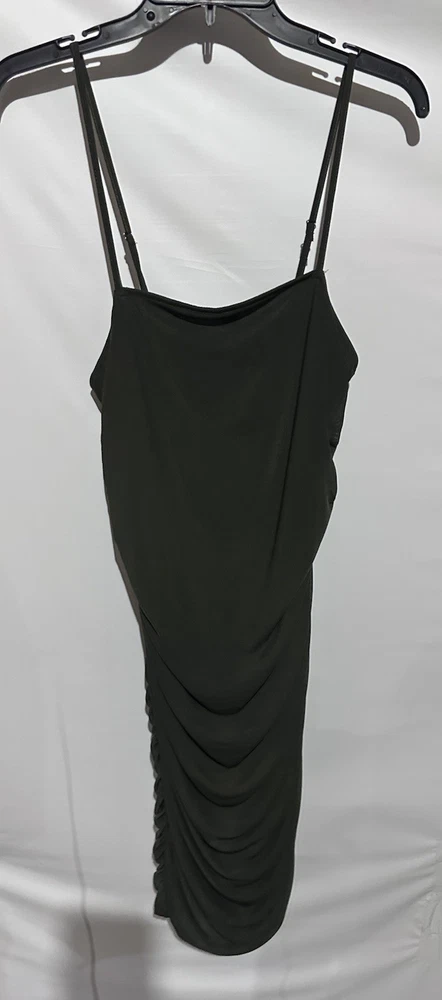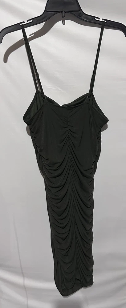 The Forever 21 Olive Green Cocktail Party Bodycon Sheath Dress in size M is a stylish and versatile garment perfect for various occasions. Made of a comfortable and stretchy polyester and spandex blend, this sleeveless dress features a solid green color and a flattering bodycon style. With a pullover closure and a midi length, this dress is perfect for parties, cocktail events, or a night out in the town. Its ruched design adds a touch of elegance, making it a great choice for those looking for a classic and clubwear-inspired outfit.
