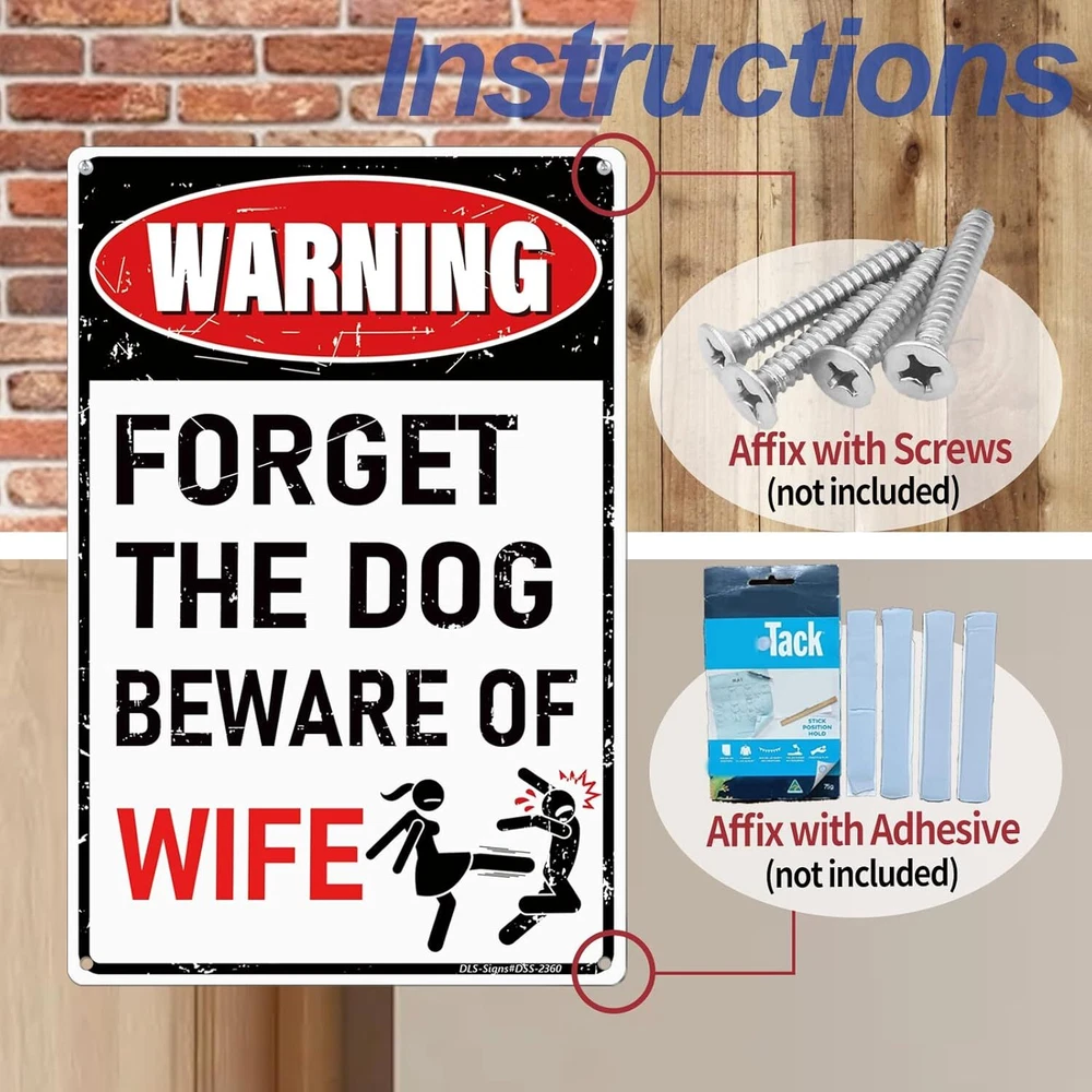 'Forget the Dog – Beware of Wife!' Funny Man Cave Decor for Men | BEWARE-WIFE Product Details Mounting Type: Wall Mount Product Dimensions: 12"L x 8"W Shape: Rectangular Style: Retro Pre-printed: Letter Item Weight: 3.84 ounces Manufacturer: MOLESS Country of Origin: China Color: BEWARE-WIFE Brand: MOLESS Material: Aluminum Theme: Man Cave Recommended Uses For Product: Man Cave Decor Funny Decor: The sign grabs attention with warning design, to add playful touch and fun to your man cave, garage, or basement. 12 x 8 Inches: Compact yet bold—ideal for any man cave zone wall decor. Explore more funny mancave decor signs on MOLESS Signs. High-Quality: Made from durable, rust-free 0.030 aluminum for long-lasting use indoors or outdoors. Easy to Setup: 4 pre-drilled holes (0.2") for effortless hanging or mounting anywhere. Great Gift Idea: Ideal for mancave enthusiasts—ideal for gifting. Cool stuff for men! Pro Tip: Colors may vary slightly due to screen settings. Reach out if you have any issues—MOLESS Signs is here to help!