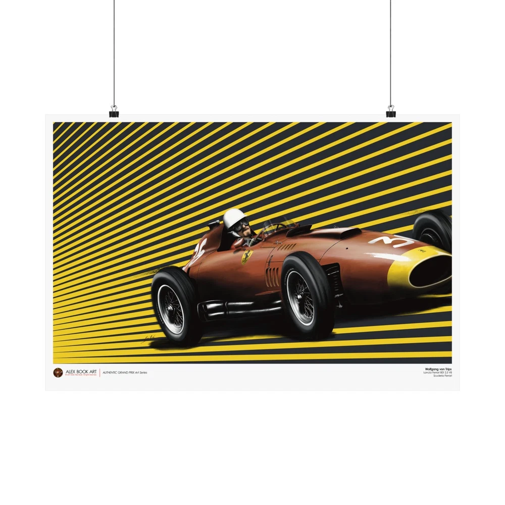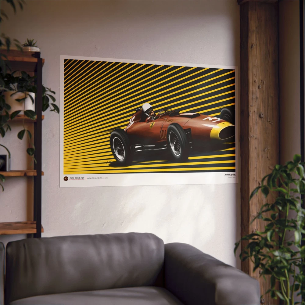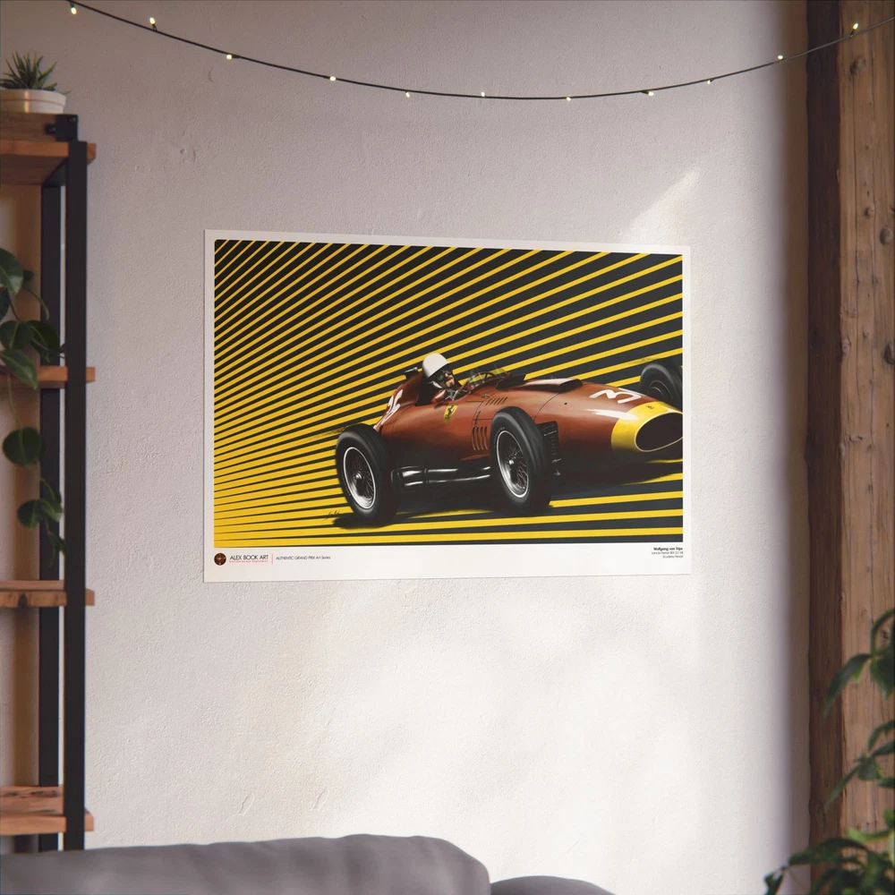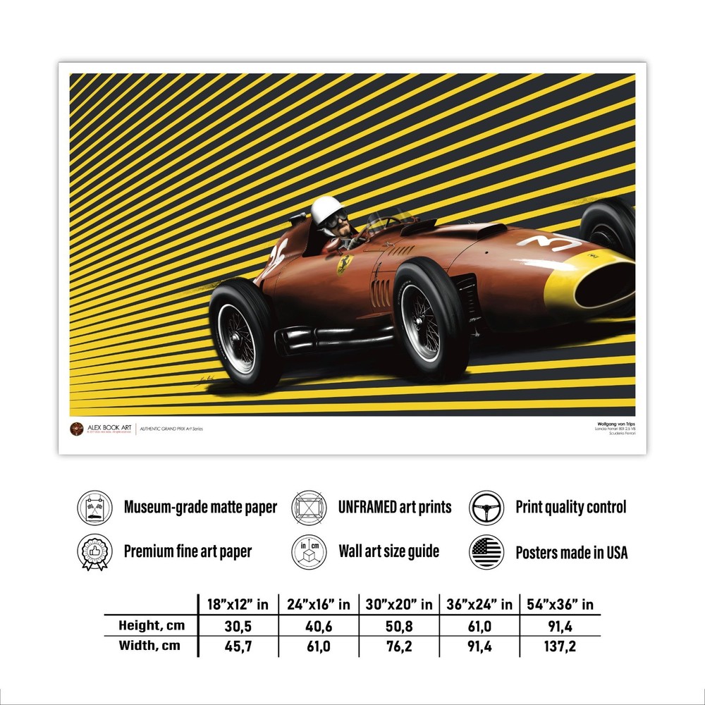 Driver: Wolfgang von Trips Race Car: Lancia Ferrari 801 2.5 V8 Team: Scuderia Ferrari Authentic Grand Prix Art Series - an original art print by Alex Book created as part of a collection dedicated to the history of Formula 1 racing. The artwork is developed through a digital oil painting process that combines traditional painterly technique with illustration and design, keeping a clear, readable composition and a documentary approach to motorsport history. Wolfgang von Trips and the Ferrari 801: The Rise of "Count Crash" at Monza The 1957 Italian Grand Prix at Monza served as the definitive proving ground for Wolfgang von Trips, the charismatic German aristocrat who would become one of the era’s most revered figures. Entering the race as a junior member of Scuderia Ferrari, von Trips arrived with a reputation for frightening speed marred by erratic accidents, earning him the unfortunate moniker "Count Crash." However, on the hallowed asphalt of his team’s home soil, he delivered a performance of disciplined maturity, securing his first-ever Formula 1 podium and signaling his transition into a world-class contender. His mount for this home outing was the Ferrari 801, the final evolutionary stage of the Lancia-funded D50 project. By late 1957, the car had been significantly modified by Ferrari’s engineering team; the iconic offset pannier tanks were fully integrated into a more conventional body, and the chassis was refined to house the 2.5-liter 90-degree V8. Producing approximately 280-285 bhp, the 801 featured a more robust suspension setup compared to its Lancia predecessor. Although it struggled against the sheer pace of the Vanwalls and Maseratis during the season, the 801 remained a formidable tool in the hands of a driver willing to exploit its high-speed stability. In a race defined by high-speed attrition on the road circuit (the high-banked oval having been abandoned due to safety concerns), von Trips executed a calculated drive. While the Vanwall of Stirling Moss dominated the lead, von Trips kept his V8 screaming through the Curva Grande and Parabolica, finishing a remarkable third behind Moss and Juan Manuel Fangio. This podium finish at Monza was a prophetic moment, establishing von Trips as Germany's great hope and the spiritual successor to the pre-war titans of the Silver Arrows. Each art print is produced on museum-grade 175 gsm matte fine art paper using high-quality archival inks for sharp detail, balanced contrast, and long-lasting durability. The print is professionally assembled in the USA from globally sourced materials under controlled production standards, carefully packed for safe shipping, and supplied without a frame so collectors can choose their preferred presentation. EU representative : HONSON VENTURES LIMITED, 3, Gnaftis House flat 102, Limassol, Mesa Geitonia, 4003, CY Product information : Generic brand, 2 year warranty in EU and Northern Ireland as per Directive 1999/44/EC Care instructions : If the poster does gather any dust, you may wipe it off gently with a clean, dry cloth.