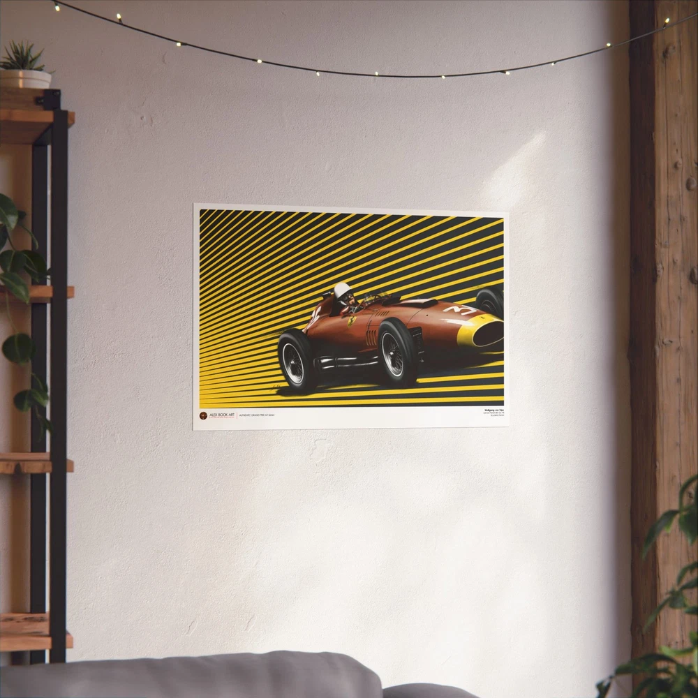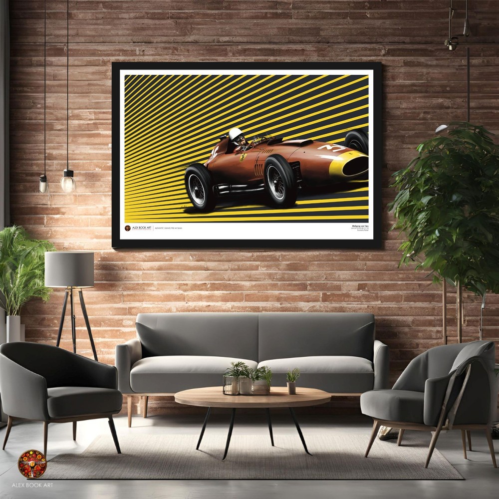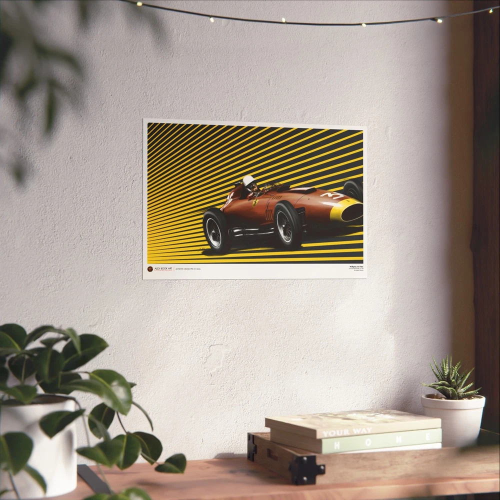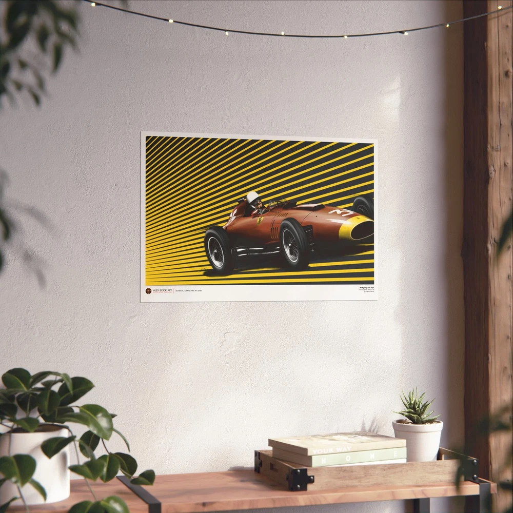 Driver: Wolfgang von Trips Race Car: Lancia Ferrari 801 2.5 V8 Team: Scuderia Ferrari Authentic Grand Prix Art Series - an original art print by Alex Book created as part of a collection dedicated to the history of Formula 1 racing. The artwork is developed through a digital oil painting process that combines traditional painterly technique with illustration and design, keeping a clear, readable composition and a documentary approach to motorsport history. Wolfgang von Trips and the Ferrari 801: The Rise of "Count Crash" at Monza The 1957 Italian Grand Prix at Monza served as the definitive proving ground for Wolfgang von Trips, the charismatic German aristocrat who would become one of the era’s most revered figures. Entering the race as a junior member of Scuderia Ferrari, von Trips arrived with a reputation for frightening speed marred by erratic accidents, earning him the unfortunate moniker "Count Crash." However, on the hallowed asphalt of his team’s home soil, he delivered a performance of disciplined maturity, securing his first-ever Formula 1 podium and signaling his transition into a world-class contender. His mount for this home outing was the Ferrari 801, the final evolutionary stage of the Lancia-funded D50 project. By late 1957, the car had been significantly modified by Ferrari’s engineering team; the iconic offset pannier tanks were fully integrated into a more conventional body, and the chassis was refined to house the 2.5-liter 90-degree V8. Producing approximately 280-285 bhp, the 801 featured a more robust suspension setup compared to its Lancia predecessor. Although it struggled against the sheer pace of the Vanwalls and Maseratis during the season, the 801 remained a formidable tool in the hands of a driver willing to exploit its high-speed stability. In a race defined by high-speed attrition on the road circuit (the high-banked oval having been abandoned due to safety concerns), von Trips executed a calculated drive. While the Vanwall of Stirling Moss dominated the lead, von Trips kept his V8 screaming through the Curva Grande and Parabolica, finishing a remarkable third behind Moss and Juan Manuel Fangio. This podium finish at Monza was a prophetic moment, establishing von Trips as Germany's great hope and the spiritual successor to the pre-war titans of the Silver Arrows. Each art print is produced on museum-grade 175 gsm matte fine art paper using high-quality archival inks for sharp detail, balanced contrast, and long-lasting durability. The print is professionally assembled in the USA from globally sourced materials under controlled production standards, carefully packed for safe shipping, and supplied without a frame so collectors can choose their preferred presentation. EU representative : HONSON VENTURES LIMITED, 3, Gnaftis House flat 102, Limassol, Mesa Geitonia, 4003, CY Product information : Generic brand, 2 year warranty in EU and Northern Ireland as per Directive 1999/44/EC Care instructions : If the poster does gather any dust, you may wipe it off gently with a clean, dry cloth.