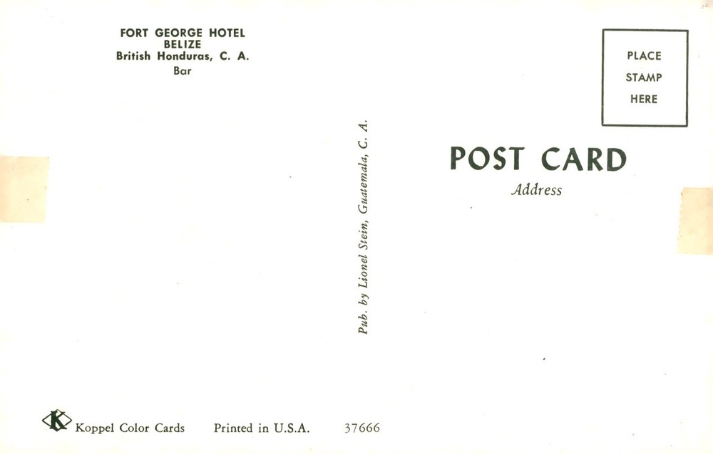 Vintage postcard of Fort George Hotel in Belize, British Honduras, showcasing a bar. Published by Lionel Stein in Guatemala. Printed in the U.S.A. with Koppel Color Cards.