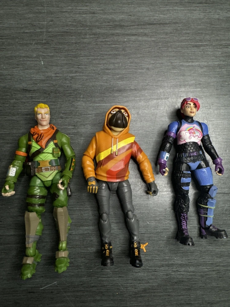 Enhance your collection with this lot of three Fortnite action figures. These figures depict your favorite characters from the game, ready for battle. Each figure is intricately designed and highly detailed, making them a perfect addition to your display. These action figures are made for collectors and fans alike. They are perfect for display, play, or as a gift. The lot includes figures from the popular Fortnite franchise, making it a must-have for any fan. Don't miss out on this opportunity to add these highly sought after figures to your collection.