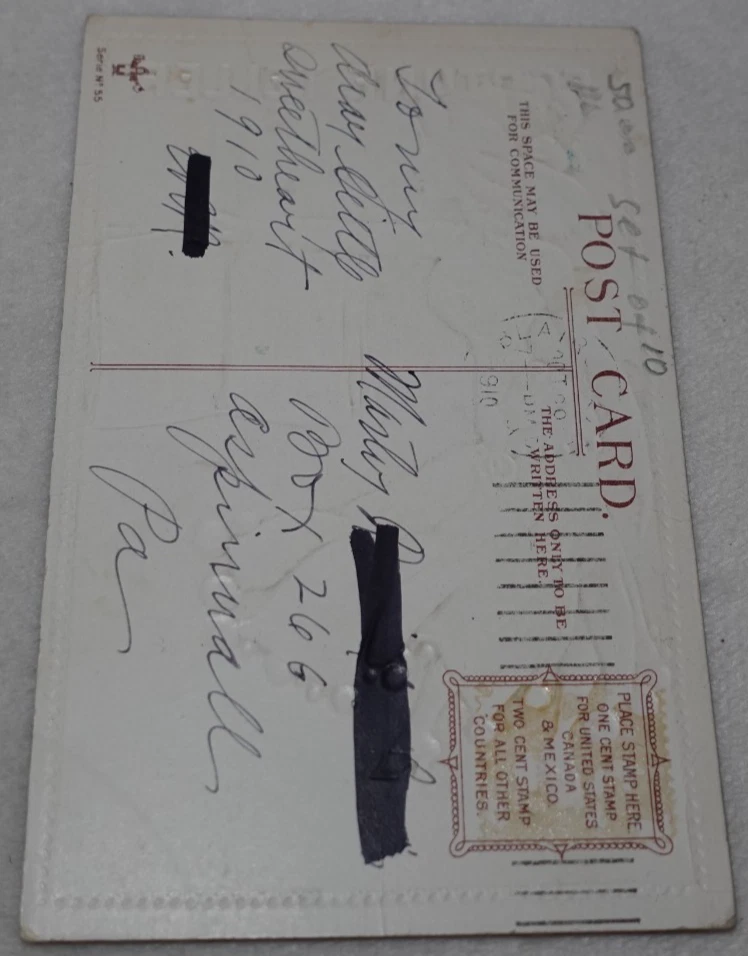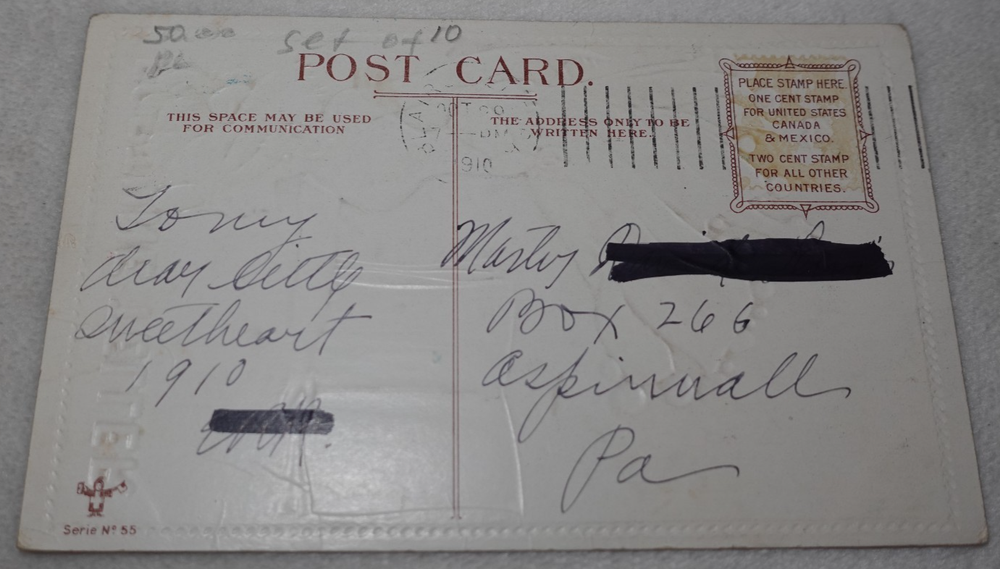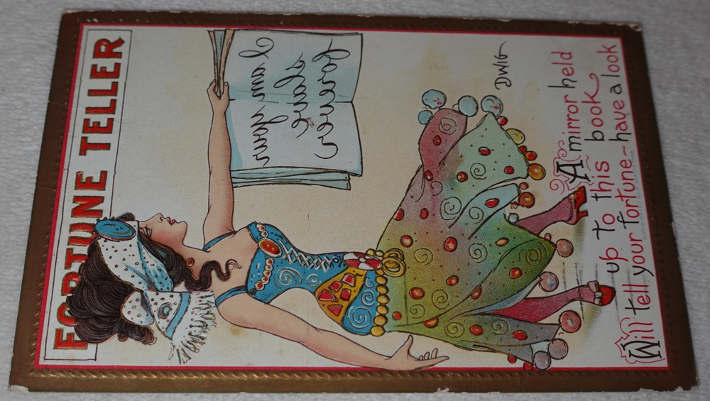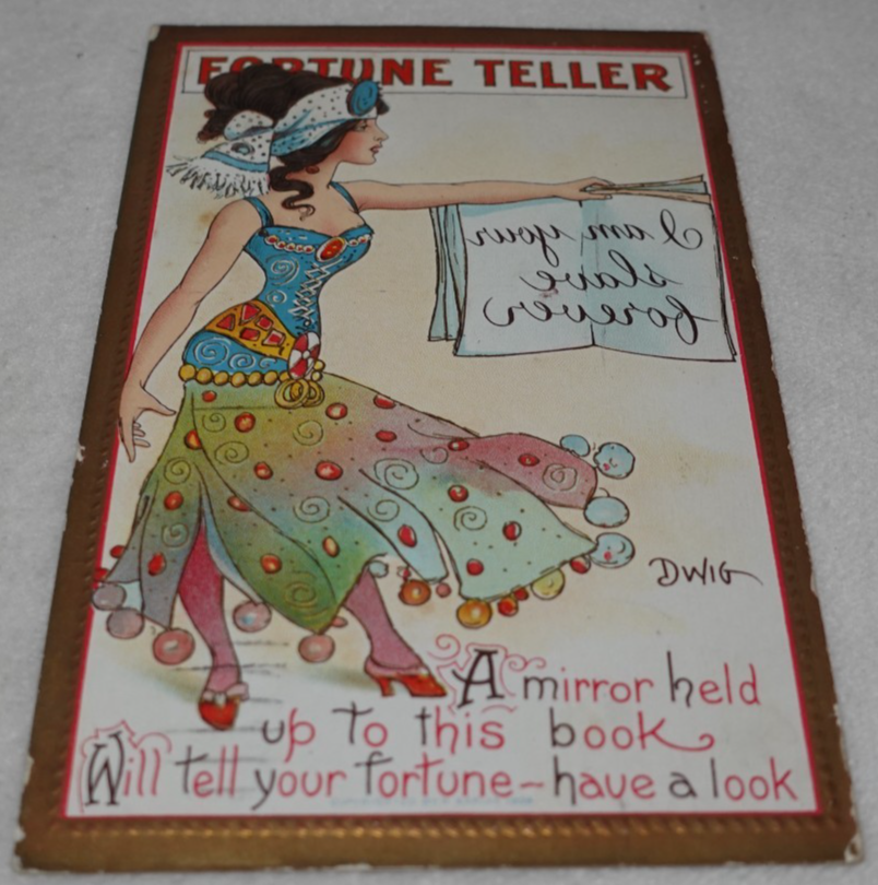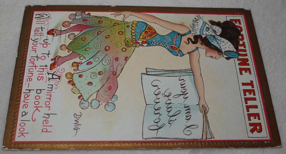 Fortune Teller A Mirror Held Up To This Book Have A Look Dwig Antique Postcard The year "1910" is written on the back side of the postcard. Measures approximately 3 1/2" x 5 1/2". Item has edge chipping, dings to the edges and corners, surface marks, creasing, staining, age discoloration and marks. Previous owner used a black marker on the back side of the postcard, covering up written information. Please see photos for more information on condition and ask any questions you may have.