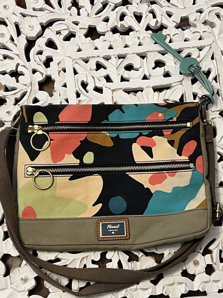 Up for sale is this vintage Fossil Issue No. 1954 organizer bag in like new condition. Sturdy canvas and high quality hardware, including zippers, strap buckle, etc and supple, genuine leather on the key bag charm. Adjustable cotton strap 24” maximum strap drop Bag itself measures 10” high 2-3” deep 13” wide -2 large zippered pockets on front of purse -1 large interior zip pocket -2 interior slip pockets -Signature Fossil key bag charm - Leather brand patch inside -Excellent preowned condition, inside and out—just one tiny dot on the reverse of the purse—extremely minor—see photos Thanks for stopping by my store, Technicolor Turnstile! I've been selling on ebay since 2002 and have received 100% positive feedback. I always provide FREE SHIPPING and pack each and every item with the greatest of care. Please feel free to reach out with questions at any time about any of my items.