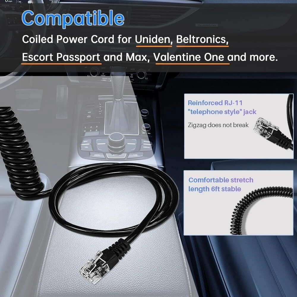 FouceClaus Radar Detector Power Charger Cord for Escort Valentine One Black Product Details Package Dimensions: 4.25 x 3.11 x 1.85 inches Item Weight: 3.42 ounces Item model number: FC-1016512 Manufacturer: FouceClaus Brand: FOUCECLAUS Connectivity Technology: USB Connector Type: USB Type C Compatible Devices: Valentine One, Escort Passport, Beltronics, Uniden and most Radar Detectors with RJ-11 jack. Special Feature: 6Ft Coiled cord Color: Black Input Voltage: 12 Volts Mounting Type: Wall Mount Amperage: 3.1 Amps Total USB Ports: 2 6Ft Coiled cord vehicle lighter Wire plug for Beltronics / Escort Passport / Uniden and more radar detectors (NOTE: This is not the smart type cord). 2 USB Ports: Charge your mobile devices while still using the radar detector. 3.1A output usb charging provides full-speed charging for your devices. Compatibility: Replacement charger power supply for Valentine One, Escort Passport 9500i, 8500 X50, Solo S2, Passport 7500S, 8500, 7500, 6800; Beltronics STi Driver, Pro RX65, Pro RX55, Vector 995, 965, 955, 940 (phone style connector), 895, and Express 795; Uniden LRD950 Radar Detector and most Radar Detectors with RJ-11 jack. Input: DC 12V / Cable Output: 12V-2A(Max) / USB Output: DC 5V-3.1A(MAX).